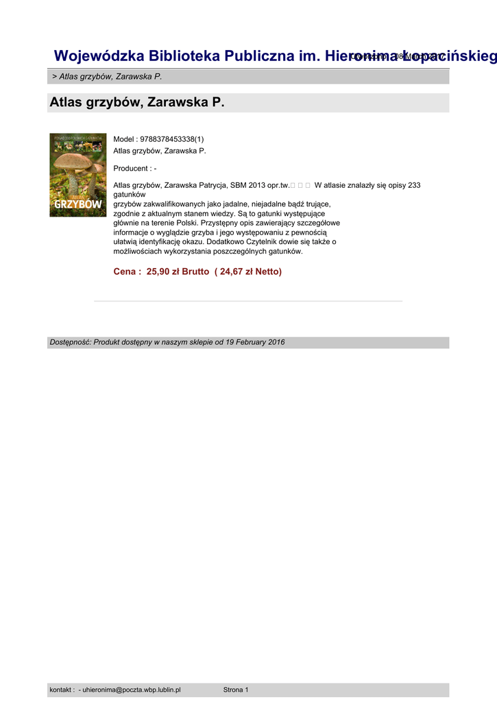 Utworzono : 08Łopacińskieg March 2017 Wojewódzka Biblioteka Publiczna im. Hieronima > Atlas grzybów, Zarawska P. Atlas grzybów, Zarawska P. Model : 9788378453338(1) Atlas grzybów, Zarawska P. Producent : Atlas grzybów, Zarawska Patrycja, SBM 2013 opr.tw.��� W atlasie znalazły się opisy 233 gatunków grzybów zakwalifikowanych jako jadalne, niejadalne bądź trujące, zgodnie z aktualnym stanem wiedzy. Są to gatunki występujące głównie na terenie Polski. Przystępny opis zawierający szczegółowe informacje o wyglądzie grzyba i jego występowaniu z pewnością ułatwią identyfikację okazu. Dodatkowo Czytelnik dowie się także o możliwościach wykorzystania poszczególnych gatunków. Cena : 25,90 zł Brutto ( 24,67 zł Netto) Dostępność: Produkt dostępny w naszym sklepie od 19 February 2016 kontakt : - [email protected] Strona 1