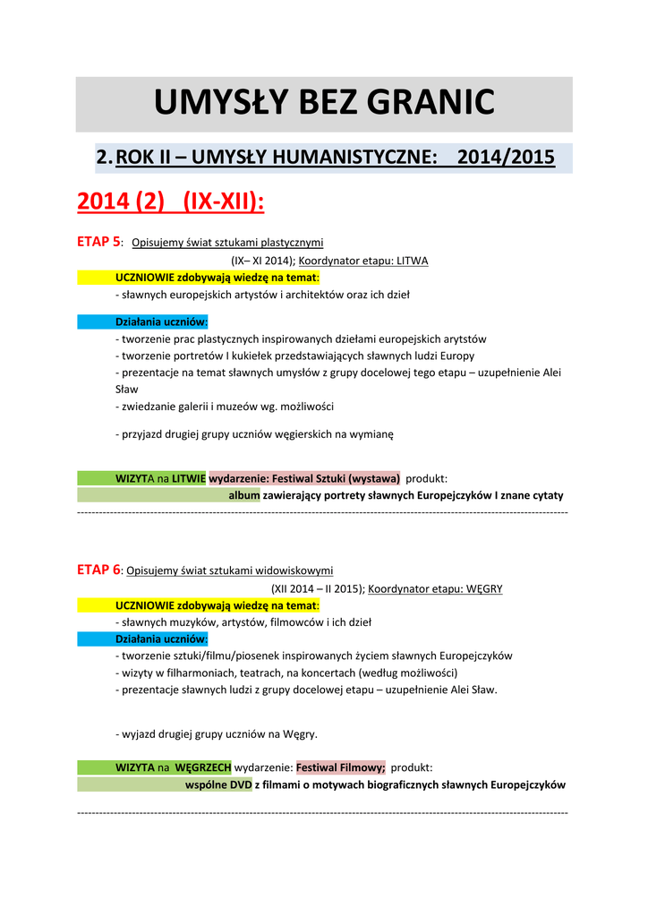 UMYSŁY BEZ GRANIC 2. ROK II – UMYSŁY HUMANISTYCZNE: 2014/2015 2014 (2) (IX-XII): ETAP 5: Opisujemy świat sztukami plastycznymi (IX– XI 2014); Koordynator etapu: LITWA UCZNIOWIE zdobywają wiedzę na temat: - sławnych europejskich artystów i architektów oraz ich dzieł Działania uczniów: - tworzenie prac plastycznych inspirowanych dziełami europejskich arytstów - tworzenie portretów I kukiełek przedstawiających sławnych ludzi Europy - prezentacje na temat sławnych umysłów z grupy docelowej tego etapu – uzupełnienie Alei Sław - zwiedzanie galerii i muzeów wg. możliwości - przyjazd drugiej grupy uczniów węgierskich na wymianę WIZYTA na LITWIE wydarzenie: Festiwal Sztuki (wystawa) produkt: album zawierający portrety sławnych Europejczyków I znane cytaty -------------------------------------------------------------------------------------------------------------------------------------- ETAP 6: Opisujemy świat sztukami widowiskowymi (XII 2014 – II 2015); Koordynator etapu: WĘGRY UCZNIOWIE zdobywają wiedzę na temat: - sławnych muzyków, artystów, filmowców i ich dzieł Działania uczniów: - tworzenie sztuki/filmu/piosenek inspirowanych życiem sławnych Europejczyków - wizyty w filharmoniach, teatrach, na koncertach (według możliwości) - prezentacje sławnych ludzi z grupy docelowej etapu – uzupełnienie Alei Sław. - wyjazd drugiej grupy uczniów na Węgry. WIZYTA na WĘGRZECH wydarzenie: Festiwal Filmowy; produkt: wspólne DVD z filmami o motywach biograficznych sławnych Europejczyków -------------------------------------------------------------------------------------------------------------------------------------- 2015 (I-VII): Stage 7: Opisujemy świat literaturą (III – V 2015); Koordynator etapu: Grecja UCZNIOWIE zdobywają wiedzę na temat: - sławni pisarze, poeci i ich dzieła Działania uczniów: - tworzenie prac literackich (opowiadania, wiersze) inspirowanych dziełami sławnych pisarzy I poetów - prezentacje na temat sławnych ludzi grupy docelowej etapu – uzupełnienie Alei Sław WIZYTA w GRECJI wydarzenie: Festiwal Książki ; produkt książka (zbiór opowiadań) PRODUKT NA ZAKOŃCZENIE PROJEKTU: gra planszowa na temat sławnych umysłów Europy -------------------------------------------------------------------------------------------------------------------------------------- ETAP 8: Podsumowanie I ewaluacja projektu (VI 2015) Działania uczniów: - Wypełnianie ankiet na temat uczestnictwa w projekcie - Oficjalne otwarcie gotowej “Alei Sław” w każdej ze szkół