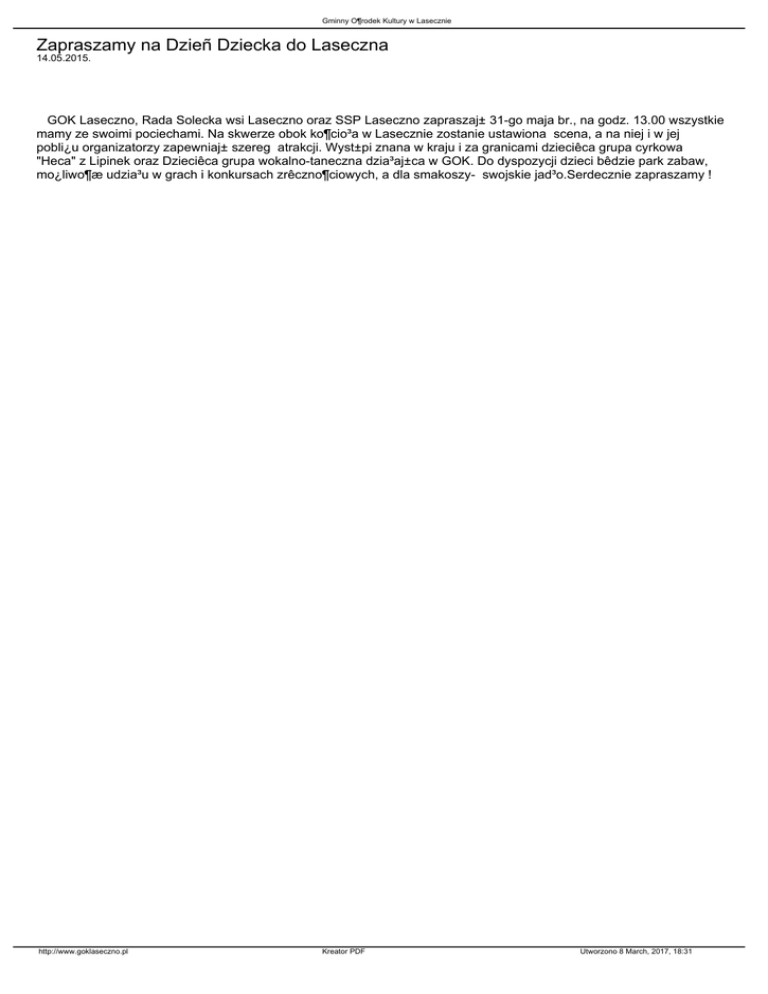 Gminny O¶rodek Kultury w Lasecznie Zapraszamy na Dzieñ Dziecka do Laseczna 14.05.2015. GOK Laseczno, Rada Solecka wsi Laseczno oraz SSP Laseczno zapraszaj± 31-go maja br., na godz. 13.00 wszystkie mamy ze swoimi pociechami. Na skwerze obok ko¶cio³a w Lasecznie zostanie ustawiona scena, a na niej i w jej pobli¿u organizatorzy zapewniaj± szereg atrakcji. Wyst±pi znana w kraju i za granicami dzieciêca grupa cyrkowa "Heca" z Lipinek oraz Dzieciêca grupa wokalno-taneczna dzia³aj±ca w GOK. Do dyspozycji dzieci bêdzie park zabaw, mo¿liwo¶æ udzia³u w grach i konkursach zrêczno¶ciowych, a dla smakoszy- swojskie jad³o.Serdecznie zapraszamy ! http://www.goklaseczno.pl Kreator PDF Utworzono 8 March, 2017, 18:31