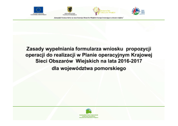 Zasady wypełniania formularza wniosku propozycji operacji do realizacji w Planie operacyjnym Krajowej Sieci Obszarów Wiejskich na lata 2016-2017 dla województwa pomorskiego STRONA TYTUŁOWA 1. Na stronie tytułowej wniosku, w pozycji pierwszej należy wpisać pełną nazwę Wnioskodawcy (w przypadku wniosków składanych w partnerstwie – lidera/partnera wiodącego). 2. W pozycji drugiej należy zaznaczyć check box dotyczący partnerstwa w KSOW. W przypadku, gdy podmiot zgłaszający operację do realizacji nie jest partnerem KSOW, a chciałby status partnera uzyskać, zobowiązany jest wypełnić formularz znajdujący się pod adresem: http://ksow.pl/ksow/formularz-zgloszeniowy.html. STRONA TYTUŁOWA 3. W pozycji trzeciej należy wpisać tytuł Operacji nadany jej przez Wnioskodawcę. W tej samej pozycji należy określić budżet operacji wyrażony w kwocie brutto. Budżet Operacji, może obejmować tylko koszty kwalifikowane w ramach Schematu II Pomocy Technicznej Programu Rozwoju Obszarów Wiejskich na lata 2014-2020. 4. W ostatniej pozycji należy wpisać planowany termin realizacji operacji. tj. termin rozpoczęcia i zakończenia działań na rzecz realizacji operacji, w którym będą ponoszone koszty przedstawione do refundacji. Początek realizacji operacji nie powinien być planowany w pierwszych miesiącach 2016 roku ponieważ przewidywany termin podpisania umów partnerskich to styczeń-luty 2016 r. Termin realizacji operacji powinien zamykać się z końcem listopada 2016. 1.DANE WNIOSKODAWCY 1.1 Dane zgłaszającego: W zależności od formy organizacyjno - prawnej Wnioskodawcy należy podać numer PESEL (osoby fizyczne) lub numer REGON (podmioty inne niż osoba fizyczna). Następnie należy wpisać numer NIP Wnioskodawcy składający się z 10 cyfr (nie dotyczy osób fizycznych). W wierszach poniżej należy podać dokładny adres siedziby / zamieszkania Wnioskodawcy. 1.2 Osoba uprawniona do reprezentowanie zgłaszającego Należy wpisać imię i nazwisko oraz funkcję / stanowisko osoby (osób), które zgodnie z KRS / postanowieniami statutu lub innego aktu wewnętrznego są upoważnione reprezentowania Wnioskodawcy. 1.3 Osoba do kontaktu Należy wpisać dane osoby, która jest upoważniona do składania wyjaśnień dotyczących Operacji (koordynator Operacji) oraz adres do korespondencji (jedynie w przypadku, gdy jest inny, aniżeli adres siedziby / zamieszkania Wnioskodawcy). 1.4 Informacje o profilu działalności Pozycja składająca się z dwóch części. W pierwszej „Zakres działalności” należy opisać przedmiot działalności Wnioskodawcy. Natomiast w pozycji „Zasięg działania” należy określić czy zasięg działania Wnioskodawcy jest ponadnarodowy, krajowy, ponadregionalny, regionalny, lokalny, etc. Opis powinien być zgodny ze statutem lub innym dokumentem określającym profil i zakres działalności Wnioskodawcy. 2. DANE DOTYCZĄCE OPERACJI 2.1 Rodzaj Działania KSOW w ramach Planu działania KSOW na lata 20142020 realizowane w ramach Planu operacyjnego 2016-2017. Należy w polu „Wybór” postawić znak X przy działaniu KSOW, w ramach którego będzie realizowana operacja . Istnieje możliwość wskazania tylko jednego działania. W tabeli wymienione zostały tylko te działania, w ramach których mogą być realizowane operacje zgłaszane przez partnerów KSOW. Jeżeli wnioskodawca planuje realizować więcej niż jedna operację w ramach jednego działania konieczne jest wypełnienie oddzielnego wniosku 2.2 Priorytety PROW 2014-2020. Należy w polu „Wybór” należy postawić znak X przy priorytecie PROW, w ramach którego będzie realizowana Operacja . Istnieje możliwość zaznaczenia więcej niż jednego priorytetu. 2.3 Cele KSOW na lata 2014-2020. Należy w polu „Wybór” postawić znak X przy celu KSOW, w ramach którego będzie realizowana operacja . Istnieje możliwość zaznaczenia więcej niż jednego celu. 2.4 Zakładane cele operacji wraz z uzasadnieniem w odniesieniu do priorytetów PROW i celów KSOW. Formułując cel Operacji należy mieć na względzie cele KSOW i priorytety PROW, wymienione i wybrane przez Wnioskodawcę w tabeli powyżej. Należy opisać jaka zmiana ma nastąpić w wyniku realizacji Operacji. W przypadku operacji złożonych z wielu działań (elementów) należy wskazać cel główny oraz cele szczegółowe operacji. 2.5 Grupa docelowa/odbiorcy projektu. Należy wskazać do jakich grup odbiorców adresowana jest operacja i poszczególne jej działania. Należy wskazać liczbę osób (organizacji) objętych operacją oraz wskazać sposób rekrutacji (jeśli operacja tego wymaga). 2.6 Uzasadnienie wyboru grupy docelowej oraz uzasadnienie potrzeby realizacji operacji. W dedykowanym polu należy przedstawić diagnozę problemu, zagadnienia, sytuacji, do której odnosi się operacja. Należy opisać przyczynę istnienia danego stanu oraz określić w jaki sposób realizacja Operacji przyczyni się do poprawy sytuacji. Należy ponadto krótko scharakteryzować Operację tj. określić czego dotyczy, z jakich elementów (części, zadań) będzie się składać. Należy uzasadnić dlaczego te grupy odbiorców zostały wybrane w kontekście uzasadnienia potrzeby realizacji projektu. 2.7 Szczegółowe zadania planowane do realizacji w ramach operacji/ informacje na temat realizacji operacji W dedykowanym polu należy wyszczególnić zadania jakie zostaną zrealizowane w ramach Operacji, które będą podlegały sfinansowaniu ze środków KSOW. Np. operacja zakłada przeprowadzenie cyklu 5 szkoleń, zorganizowanie konferencji podsumowującej oraz wydanie publikacji pokonferencyjnej. Ewentualnie jeśli operacja składa się z wielu zadań należy opisać ich znaczenie dla realizacji celu operacji. Jeśli Wnioskodawca przewiduje realizację innych zadań niepodlegających finansowaniu ze środków KSOW, a dotyczących realizacji operacji należy wpisać krótką informację na ten temat. W celu ułatwienia w