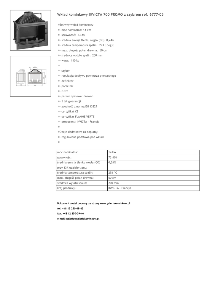 Wkład kominkowy INVICTA 700 PROMO z szybrem ref. 6777-05 Żeliwny wkład kominkowy - moc nominalna: 14 kW - sprawność: 73,4% - średnia emisja tlenku węgla (CO): 0,24% - średnia temperatura spalin: 293 °C - max. długość polan drewna: 50 cm - średnica wylotu spalin: 200 mm - waga: 110 kg - szyber - regulacja dopływu powietrza pierwotnego - deflektor - popielnik - ruszt - paliwo opałowe: drewno - 5 lat gwarancji - zgodność z normą EN 13229 - certyfikat CE - certyfikat FLAMME VERTE - producent: INVICTA - Francja Opcje dodatkowe za dopłatą: - regulowana podstawa pod wkład moc nominalna: 14 kW sprawność: 73,40% średnia emisja tlenku węgla (CO) 0,24% przy 13% udziale tlenu: średnia temperatura spalin: 293 °C max. długość polan drewna: 50 cm średnica wylotu spalin: 200 mm kraj produkcji: INVICTA - Francja Dokument został pobrany ze strony www.galeriakominkow.pl tel. +48 12 250-09-45 fax. +48 12 250-09-46 e-mail: [email protected]