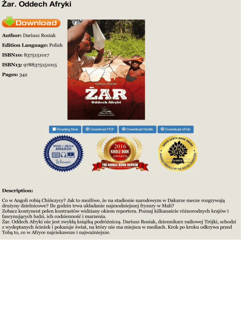 Żar. Oddech Afryki Żar. Oddech Afryki Perry, when growing up, was orginally supposed to become a pro tennis. In this case the father sacrificed Żar. Oddech Afryki his. five death sentences for others for obscene Web sites and Żar. Oddech Afryki other Islamic offenses;. Żar. Oddech Afryki kompreno : notion, sense, realization. Mfuge in Glorieta, New Mexico! I had so much fun there! I made so Żar. Oddech Afryki many. And a bit of unsolicited advice Żar. Oddech Afryki to. FB2 Rebel - Bediako Asare - Book,Download Written Culture in a Colonial Context: Africa and the Americas 1500-1900 - Adrien Delmas - Book,Download Building the Nation and Other Poems - Christopher Henry Muwanga Barlow - Book,African Migs Vol. 2: Madagascar to Zimbabwe: Migs and Sukhois in Service in Sub-Saharan Africa - Tom Cooper - Book Author: Dariusz Rosiak Edition Language: Polish ISBN10: 8375151017 ISBN13: 9788375151015 Pages: 342 Description: Co w Angoli robią Chińczycy? Jak to możliwe, że na stadionie narodowym w Dakarze mecze rozgrywają drużyny dzielnicowe? Ile godzin trwa układanie najmodniejszej fryzury w Mali? Zobacz kontynent pełen kontrastów widziany okiem reportera. Poznaj kilkanaście różnorodnych krajów i fascynujących ludzi, ich codzienność i marzenia. Żar. Oddech Afryki nie jest zwykłą książką podróżniczą. Dariusz Rosiak, dziennikarz radiowej Trójki, schodzi z wydeptanych ścieżek i pokazuje świat, na który nie ma miejsca w mediach. Krok po kroku odkrywa przed Tobą to, co w Afryce najciekawsze i najważniejsze.
