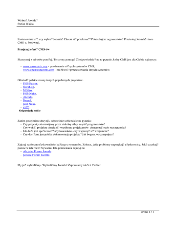 Wybra? Joomla? Stefan Wajda Zastanawiasz si?, czy wybra? Joomla? Chcesz si? przekona?? Potrzebujesz argumentów? Przetestuj Joomla! i inne CMS-y. Porównaj. Przejrzyj ofert? CMS-ów Skorzystaj z adresów poni?ej. Te strony pomog? Ci odpowiedzie? na to pytanie, który CMS jest dla Ciebie najlepszy: - www.cmsmatrix.org - porównanie ró?nych systemów CMS, - www.opensourcecms.com - mo?liwo?? przetestowania innych systemów. Odwied? polskie strony innych popularnych projektów. - PHP-Fusion, - GeekLog, - MDPro, - PHP-Nuke, - jPortal2, - Drupal, - post-Nuke, - e107, Odpowiedz sobie Zanim podejmiesz decyzj?, odpowiedz sobie tak?e na pytania: - Czy projekt jest rozwijany przez stabilny silny zespó? programistów? - Czy wokó? projektu skupia si? wspólnota projektantów dostarczaj?cych rozszerzenia? - Jak du?a jest spo?eczno?? u?ytkowników, czy wspieraj? si? wzajemnie? - Czy dost?pna jest polska dokumentacja projektu? Jak bogata, wyczerpujaca? Zajrzyj na forum u?ytkowników ka?dego z systemów. Zobacz, jakie problemy napotykaj? u?ytkownicy. Jak? uzyskuj? pomoc w ich rozwi?zywaniu. Dla porównania zajrzyj na: - oficjalne Forum Joomla - polskie Forum Joomla My ju? wybrali?my. Wybrali?my Joomla! Zapraszamy tak?e i Ciebie! strona 1 / 1