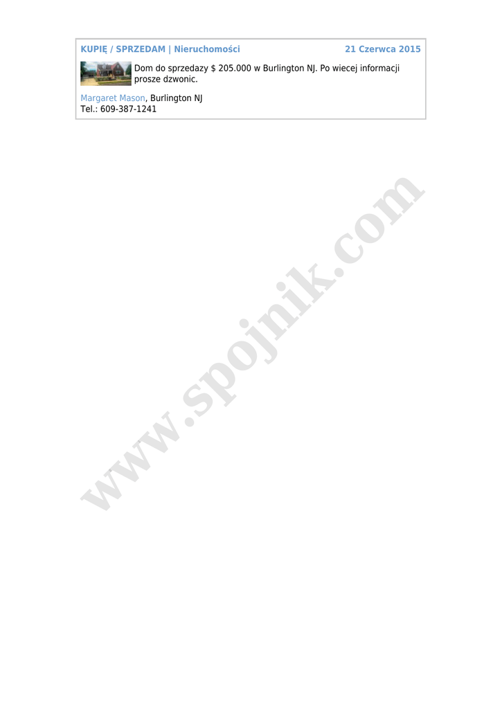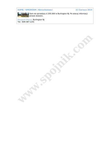 KUPIĘ / SPRZEDAM | Nieruchomości 21 Czerwca 2015 Dom do sprzedazy $ 205.000 w Burlington NJ. Po wiecej informacji prosze dzwonic. w w w .s po jn ik .c o m Margaret Mason, Burlington NJ Tel.: 609-387-1241