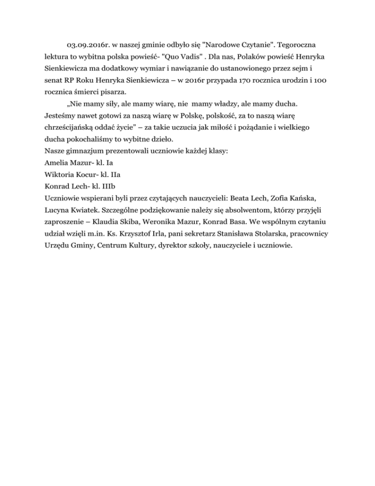03.09.2016r. w naszej gminie odbyło się "Narodowe Czytanie". Tegoroczna lektura to wybitna polska powieść- "Quo Vadis" . Dla nas, Polaków powieść Henryka Sienkiewicza ma dodatkowy wymiar i nawiązanie do ustanowionego przez sejm i senat RP Roku Henryka Sienkiewicza – w 2016r przypada 170 rocznica urodzin i 100 rocznica śmierci pisarza. „Nie mamy siły, ale mamy wiarę, nie mamy władzy, ale mamy ducha. Jesteśmy nawet gotowi za naszą wiarę w Polskę, polskość, za to naszą wiarę chrześcijańską oddać życie” – za takie uczucia jak miłość i pożądanie i wielkiego ducha pokochaliśmy to wybitne dzieło. Nasze gimnazjum prezentowali uczniowie każdej klasy: Amelia Mazur- kl. Ia Wiktoria Kocur- kl. IIa Konrad Lech- kl. IIIb Uczniowie wspierani byli przez czytających nauczycieli: Beata Lech, Zofia Kańska, Lucyna Kwiatek. Szczególne podziękowanie należy się absolwentom, którzy przyjęli zaproszenie – Klaudia Skiba, Weronika Mazur, Konrad Basa. We wspólnym czytaniu udział wzięli m.in. Ks. Krzysztof Irla, pani sekretarz Stanisława Stolarska, pracownicy Urzędu Gminy, Centrum Kultury, dyrektor szkoły, nauczyciele i uczniowie.