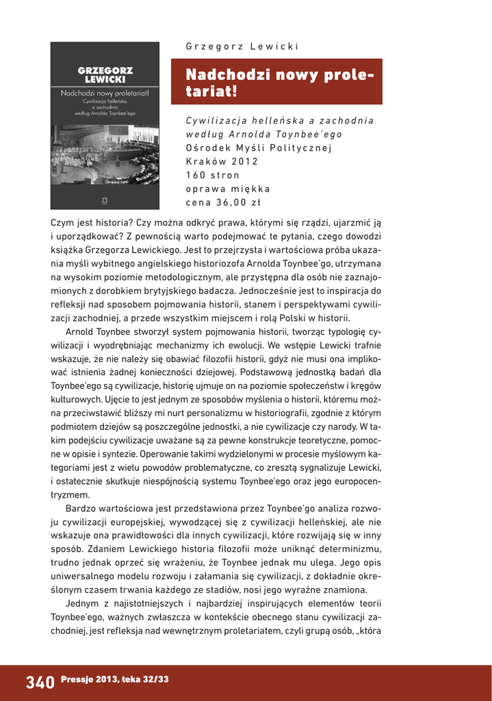 Grzegorz Lewicki Nadchodzi nowy proletariat! Cywilizacja helleńska a zachodnia w e d ł u g A r n o l d a To y n b e e ’ e g o Ośrodek Myśli Politycznej Kraków 2012 160 stron oprawa miękka cena 36,00 zł Czym jest historia? Czy można odkryć prawa, którymi się rządzi, ujarzmić ją i uporządkować? Z pewnością warto podejmować te pytania, czego dowodzi książka Grzegorza Lewickiego. Jest to przejrzysta i wartościowa próba ukazania myśli wybitnego angielskiego historiozofa Arnolda Toynbee’go, utrzymana na wysokim poziomie metodologicznym, ale przystępna dla osób nie zaznajomionych z dorobkiem brytyjskiego badacza. Jednocześnie jest to inspiracja do refleksji nad sposobem pojmowania historii, stanem i perspektywami cywilizacji zachodniej, a przede wszystkim miejscem i rolą Polski w historii. Arnold Toynbee stworzył system pojmowania historii, tworząc typologię cywilizacji i wyodrębniając mechanizmy ich ewolucji. We wstępie Lewicki trafnie wskazuje, że nie należy się obawiać filozofii historii, gdyż nie musi ona implikować istnienia żadnej konieczności dziejowej. Podstawową jednostką badań dla Toynbee’ego są cywilizacje, historię ujmuje on na poziomie społeczeństw i kręgów kulturowych. Ujęcie to jest jednym ze sposobów myślenia o historii, któremu można przeciwstawić bliższy mi nurt personalizmu w historiografii, zgodnie z którym podmiotem dziejów są poszczególne jednostki, a nie cywilizacje czy narody. W takim podejściu cywilizacje uważane są za pewne konstrukcje teoretyczne, pomocne w opisie i syntezie. Operowanie takimi wydzielonymi w procesie myślowym kategoriami jest z wielu powodów problematyczne, co zresztą sygnalizuje Lewicki, i ostatecznie skutkuje niespójnością systemu Toynbee’ego oraz jego europocentryzmem. Bardzo wartościowa jest przedstawiona przez Toynbee’go analiza rozwoju cywilizacji europejskiej, wywodzącej się z cywilizacji helleńskiej, ale nie wskazuje ona prawidłowości dla innych cywilizacji, które rozwijają się w inny sposób. Zdaniem Lewickiego historia filozofii może uniknąć determinizmu, trudno jednak oprzeć się wrażeniu, że Toynbee jednak mu ulega. Jego opis uniwersalnego modelu rozwoju i załamania się cywilizacji, z dokładnie określonym czasem trwania każdego ze stadiów, nosi jego wyraźne znamiona. Jednym z najistotniejszych i najbardziej inspirujących elementów teorii Toynbee’ego, ważnych zwłaszcza w kontekście obecnego stanu cywilizacji zachodniej, jest refleksja nad wewnętrznym proletariatem, czyli grupą osób, „która 340 Pressje 2013, teka 32/33 jest w jakiś sposób w danej społeczności na danym etapie historii, ale do niej nie należy” (s. 55). Próba identyfikacji zewnętrznego proletariatu współczesnego Zachodu jest najśmielszym i najistotniejszym dokonaniem Lewickiego. Co ciekawe, koncepcje podobne do teorii Toynbee’ego pojawiają się również w pracach innych autorów, na przykład u Przemysława Żurawskiego vel Grajewskiego. W książce Duch pyszny poprzedza upadek (2012) pisze on, że rozpad projektów federacyjnych wynika z zaniku woli ich tworzenia i pojawienia się mniejszości, które przestają się z nim utożsamiać. Jako jeden z przykładów podaje on Kozaków, którzy przyczynili się do upadku I Rzeczpospolitej. Toynbee zajmował się też historią Polski. Jak przypomina Lewicki, „traktował on kultury nadwiślańskie jako współczesne tereny graniczne Zachodu, określając je jako «marchie» – czyli dosłownie rzecz ujmując – awangardę, przednią straż Zachodu przed naporami zewnętrznymi, nie tylko stricte militarnymi, ale również rozumianymi w szerszym ujęciu duchowym” (s. 150). Niezwykle interesująca jest, niestety jedynie zasygnalizowana w zakończeniu książki, refleksja nad tym, jaką rolę w obecnym stadium cywilizacji zachodniej może odegrać Polska. Zgodnie z modelem Toynbee’ego, nasz kraj, ze względu na położenie geograficzne, wymuszające stałe podejmowanie różnorodnych wyzwań, może pretendować do roli rezerwuaru kreatywności Europy i źródła jej sił witalnych. Być może więc mimo Identyfikacja zewnętrznego proletariatu jest najśmielszym i najistotniejszym dokonaniem Lewickiego kryzysu, będącego wynikiem komunizmu, wciąż posiadamy potencjał kulturowy, a nasze problemy mogą okazać się impulsem dla wyzwolenia kreatywności. Toynbee pisał, że Polska „ma swoje słowo do powiedzenia współczesnemu Zachodowi” (s. 150). Pozostaje pytanie, jakie jest to słowo. Krzysztof Mazur (2011) przedstawił w tece „Pressji” Zabiliśmy proroka wielką wizję Jana Pawła II oparcia polskiej demokracji na wartościach chrześcijańskich, tak, aby stała się zarzewiem reewangelizacji Europy. Niestety na początku lat dziewięćdziesiątych projekt ten został odrzucony. Kluczową kwestią jest to, czy mamy jeszcze na tyle sił, aby do niego wrócić. Podjęcie wyzwania naprawy Europy i jej duchowego przewodnictwa byłoby wielką szansą nie tylko dla niej, lecz również dla nas samych, stanowiłoby bowiem potężny impuls rozwojowy. Idea ta jest niewątpliwie piękna, pozostaje jednak pytanie, czy możliwa do realizacji. Marek Cichocki podczas dyskusji z autorem w Muzeum w Gliwicach w lutym 2013 roku wskazywał, że ze względu na ogromne straty polskich elit w XX wieku i długoletnią stagnację w PRL, nie jesteśmy w stanie w perspektywie kilku pokoleń podjąć zadania przewodniczenia Europie. Jak jednak pokazuje nasza historia, najwięcej zależy od nas samych – musimy tylko się wyzwolić z apatii, bezczynności, zniechęcenia i serwilizmu. Podejmowanie wyzwań wydaje się być na trwałe wpisane w historię naszego narodu, w czym należy przyznać rację Toynbee’emu. Maciej Malik 341