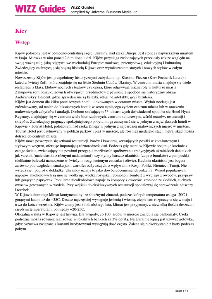 WIZZ Guides compiled by Universal Business Media Ltd Kiev Wstęp Kijów położony jest w północno-centralnej części Ukrainy, nad rzeką Dniepr. Jest stolicą i największym miastem w kraju. Mieszka w nim ponad 2.6 miliona ludzi. Kijów przyciąga zwiedzających przez cały rok ze względu na swoją ważną rolę, jaką odgrywa we wschodniej Europie: naukową, przemysłową, edukacyjną i kulturalną. Zwiedzający zachwycają się bogatą historią Kijowa oraz wymieszaniem starych i nowych stylów w całym mieście. Nowoczesny Kijów jest przepełniony historycznymi zabytkami np. Klasztor Pieczar (Kiev Pechersk Lavra) i katedra świętej Zofii, która znajduje się na liście Siedmiu Cudów Ukrainy. W centrum miasta znajduje się wiele restauracji z klasą, klubów nocnych i teatrów czy opera, które odgrywają ważną rolę w kulturze miasta. Zakupowiczom poszukującym tradycyjnych przedmiotów z pewnością spodoba się historyczny obszar Andriyivskyy Descent, gdzie sprzedawane są książki, religijne artefakty, gry i biżuteria. Kijów jest domem dla kilku prestiżowych hoteli, ulokowanych w centrum miasta. Wybór noclegu jest zróżnicowany, od tanich do luksusowych hoteli; w sercu tętniącego życiem centrum miasta lub w otoczeniu malowniczych zabytków i atrakcji. Osobom szukającym 5* luksusowych doświadczeń spodoba się Hotel Hyatt Regency, znajdujący się w centrum wielu biur rządowych, centrum kulturowym, wśród teatrów, restauracji i sklepów. Zwiedzający pragnący spokojniejszego pobytu mogą zatrzymać się w jednym z największych hoteli w Kijowie - Tourist Hotel, położonym nad rzeką Dniepr w jednym z najbardziej malowniczych miejsc w mieście. Tourist Hotel jest usytuowany w pobliżu parków i plaż w mieście, ale również niedaleko stacji metra, skąd można dotrzeć do centrum miasta. Kijów może poszczycić się setkami restauracji, barów i kawiarni, serwujących posiłki w komfortowym i stylowym wnętrzu, oferując imponującą różnorodność dań. Podczas gdy menu w Kijowie obejmuje kuchnie z całego świata, zwiedzający nie powinni przegapić możliwości spróbowania tradycyjnych ukraińskich dań takich jak varenik (małe ciastka z różnymi nadzieniami), czy słynny barszcz ukraiński (zupa z buraków) z pampushki (delikatne bułeczki namoczone w świeżym, rozgniecionym czosnku i oliwie). Kuchnia ukraińska jest bogata zarówno pod względem smaku jak i wartości odżywczych, z wpływami z Rosji, Polski, Niemiec i Turcji. Nie wstydź się i poproś o dokładkę, Ukraińcy uznają to jako dowód docenienia ich jedzenia! Wśród popularnych napojów alkoholowych są mocne wódki np. wódka rosyjska i Somohon (bimber) z wyciągu z owoców, przypraw lub gorących papryczek. Popularne niealkoholowe napoje to kompoty z owoców, zrobione ze słodkich, suchych owoców gotowanych w wodzie. Przy wejściu do ekskluzywnych restauracji spodziewaj się sprawdzenia płaszczy i torebek. W Kijowie dominuje klimat kontynentalny; ze śnieżnymi zimami, podczas których temperatura osiąga -20C i gorącymi latami aż do +35C. Deszcz najczęściej występuje jesienią i wiosną, ciepłe lato rozpoczyna się w maju i trwa do końca września. Kijów znany jest z indiańskiego lata, klimat jest przyjemny, z niewielką ilością deszczu i ciepłymi temperaturami pomiędzy +20-25C. Oficjalną walutą w Kijowie jest hryvna. Dla wygody, co 100 jardów w mieście znajdują się bankomaty. Czeki podróżne można również realizować w lokalnych bankach za 3% opłatą. Na Ukrainie lepiej jest używać gotówkę, gdyż oszustwa związane z kartami kredytowymi występują dość często. Zaleca się niekorzystanie z karty podczas pobytu. page 1 / 1