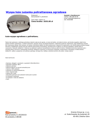 Wyspa łoże Leżanka polirattanowa ogrodowa Producent: ___ Kod produktu: V_42220153 Cena netto: 1329,27 zł Kontakt z Handlowcem: Tel/Fax: (68) 506 50 56 Email: [email protected] GG: 45303488 Cena brutto: 1635.00 zł Łoże-wyspa ogrodowa z polirattanu. Piękne łoże wykonane z solidnego polirattanu idealnie nada się do ogrodu, na taras lub balkon, ale także do domu. Jest bardzo wygodne, dzięki temu podnosi komfort użytkowania, a solidne wykonanie, pozwala cieszyć się bezpieczeństwem i stabilnością podczas użytkowania. Jego dodatkowym atutem jest nowoczesny design, który sprawia, że zestaw z polirattanu będzie nie tylko praktycznym miejscem do wypoczynku, ale również piękną ozdobą twojego otoczenia. Dodatkowym atutem łoża jest materiał wykorzystany do produkcji, ponieważ jest on odporny na warunki pogodowe i bardzo łatwy w czyszczeniu. Poduszki, baldachim i materace są odpinane i podczas nieużytkowania można je zabrać do domu. Podstawa konstrukcji wykonana jest z wysokiej jakości aluminium malowanego proszkowo. Baldachim wykonany na konstrukcji metalowej, antykorozyjne. Wchodzący w skład zestawu baldachim zadba o upragniony cień podczas upalnego, letniego dnia. Zadbaj o odrobinę komfortu dla siebie i swojej rodziny! Dane techniczne: ● ● ● ● ● ● ● ● ● ● ● ● Wymiary: (długość x szerokość x wysokość) 230x149x132cm Wysokość siedziska: 48cm Materiał: poliratan Materiał odporny na warunki atmosferyczne Tkanina: 100% poliester Poduszka na zamek błyskawiczny Kolor: brązowo-biały Idealny dla 4 osób Wszystkie pokrowce oraz poduszki można prać w pralce W zestawie 5 poduszek W zestawie 1 mata do siedzenia Dach Kod produktu:V_42220153 ID produktu:138148 Granos Group sp. z o.o. ul. Sulechowska 4a budynek 45 65-001 Zielona Góra