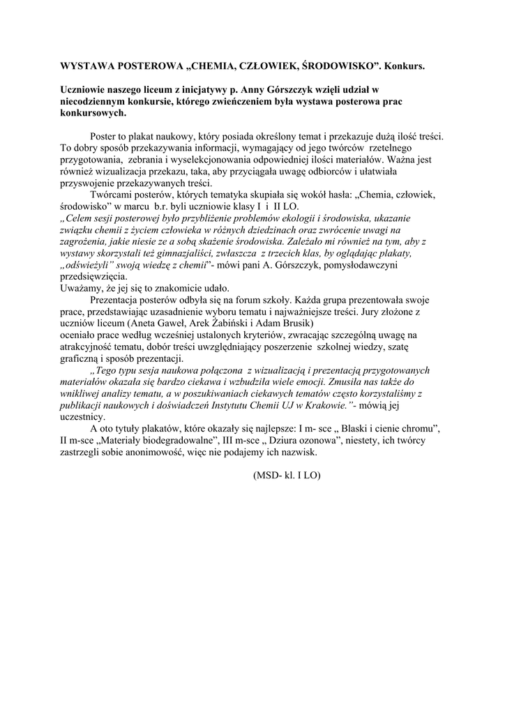 WYSTAWA POSTEROWA „CHEMIA, CZŁOWIEK, ŚRODOWISKO”. Konkurs. Uczniowie naszego liceum z inicjatywy p. Anny Górszczyk wzięli udział w niecodziennym konkursie, którego zwieńczeniem była wystawa posterowa prac konkursowych. Poster to plakat naukowy, który posiada określony temat i przekazuje dużą ilość treści. To dobry sposób przekazywania informacji, wymagający od jego twórców rzetelnego przygotowania, zebrania i wyselekcjonowania odpowiedniej ilości materiałów. Ważna jest również wizualizacja przekazu, taka, aby przyciągała uwagę odbiorców i ułatwiała przyswojenie przekazywanych treści. Twórcami posterów, których tematyka skupiała się wokół hasła: „Chemia, człowiek, środowisko” w marcu b.r. byli uczniowie klasy I i II LO. „Celem sesji posterowej było przybliżenie problemów ekologii i środowiska, ukazanie związku chemii z życiem człowieka w różnych dziedzinach oraz zwrócenie uwagi na zagrożenia, jakie niesie ze a sobą skażenie środowiska. Zależało mi również na tym, aby z wystawy skorzystali też gimnazjaliści, zwłaszcza z trzecich klas, by oglądając plakaty, „odświeżyli” swoją wiedzę z chemii”- mówi pani A. Górszczyk, pomysłodawczyni przedsięwzięcia. Uważamy, że jej się to znakomicie udało. Prezentacja posterów odbyła się na forum szkoły. Każda grupa prezentowała swoje prace, przedstawiając uzasadnienie wyboru tematu i najważniejsze treści. Jury złożone z uczniów liceum (Aneta Gaweł, Arek Żabiński i Adam Brusik) oceniało prace według wcześniej ustalonych kryteriów, zwracając szczególną uwagę na atrakcyjność tematu, dobór treści uwzględniający poszerzenie szkolnej wiedzy, szatę graficzną i sposób prezentacji. „Tego typu sesja naukowa połączona z wizualizacją i prezentacją przygotowanych materiałów okazała się bardzo ciekawa i wzbudziła wiele emocji. Zmusiła nas także do wnikliwej analizy tematu, a w poszukiwaniach ciekawych tematów często korzystaliśmy z publikacji naukowych i doświadczeń Instytutu Chemii UJ w Krakowie.”- mówią jej uczestnicy. A oto tytuły plakatów, które okazały się najlepsze: I m- sce „ Blaski i cienie chromu”, II m-sce „Materiały biodegradowalne”, III m-sce „ Dziura ozonowa”, niestety, ich twórcy zastrzegli sobie anonimowość, więc nie podajemy ich nazwisk. (MSD- kl. I LO)