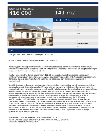 Lulkowo DOM na SPRZEDAŻ 141 m2 416 000 617/4767/ODS Primary 875 123 2015 2 4 SemiDetached 141 Opis KUPUJĄC TEN DOM OD RAZU ZYSKUJESZ 8.000 ZŁ NOWY DOM W STANIE DEWELOPERSKIM LUB POD KLUCZ. Mam przyjemność zaprezentować Państwu ofertę sprzedaży domu w zabudowie bliźniaczej w podtoruńskim Lulkowie, zaledwie kilometr od Łysomic. Lokalizacja ta cechują się bezproblemowym dojazdem do Torunia w zaledwie 15 min. Prosty i funkcjonalny dom o powierzchni 122,60 m2 w zabudowie bliźniaczej z poddaszem użytkowym i garażem jednostanowiskowym o powierzchni ponad 18 m2. Na parterze przestronny, słoneczny salon z jadalnią i otwartą kuchnią. Na poddaszu trzy przestronne sypialnie z garderobami. Wysoki standard wykonania i zastosowanych materiałów – szczególny nacisk położony został na termoizolacyjność i dźwiękoszczelność budynków co zapewni w trakcie użytkowania wymierne oszczędności np.: - stolarka okienna - ciepły profil 6-cio komorowy firmy Aluplast z szybą potrójną o współczynniku 0,7W/m2K (na rynku standard to U=1,0W/m2K) - drzwi wejściowe stalowe z czterema zawiasami z blachy gr. 1mm z izolacją termiczną oraz dwoma zamkami jeden z atestem europejskim antywłamaniowym - brama garażowa segmentowa firmy Hormann z izolacją termiczną - ściany wykonane z pustaków ceramicznych Porotherm Profi P+W 25cm o współczynniku U=0,95W/m2K oraz parametrze akustycznym Rw=45dB firmy Wienerberger murowane na klej termoizolacyjny - strop Teriwa Konbet Family Thermo 10 komorowy - najwyższa izolacyjność cieplna i akustyczna. W standardzie instalacja kominkowa, przewody spalinowe z wkładem ceramicznym izolowanym wełną mineralną docieplenie ścian w systemie Caparol styropian EPS 70 – gr. 15cm, co daje izolacyjność termiczną ścian U=0,20W/m2K w standardzie deweloperskim również kompletna instalacja wod-kan i c.o. wraz z piecem, oraz instalacja cyrkulacji ciepłej wody użytkowej. ISTNIEJE MOŻLIWOŚĆ WYKOŃCZENIA DOMU POD KLUCZ. PEŁNĄ GALERIĘ ZDJĘĆ ZNAJDZIECIE PAŃSTWO NA NASZEJ STRONIE PANORAMA-NIERUCHOMOŚCI.net Panorama Nieruchomości ZAPRASZAMY Emil Drzymalski tel. 508-222-220 email: [email protected] Panorama Nieruchomości Powered by TCPDF (www.tcpdf.org)