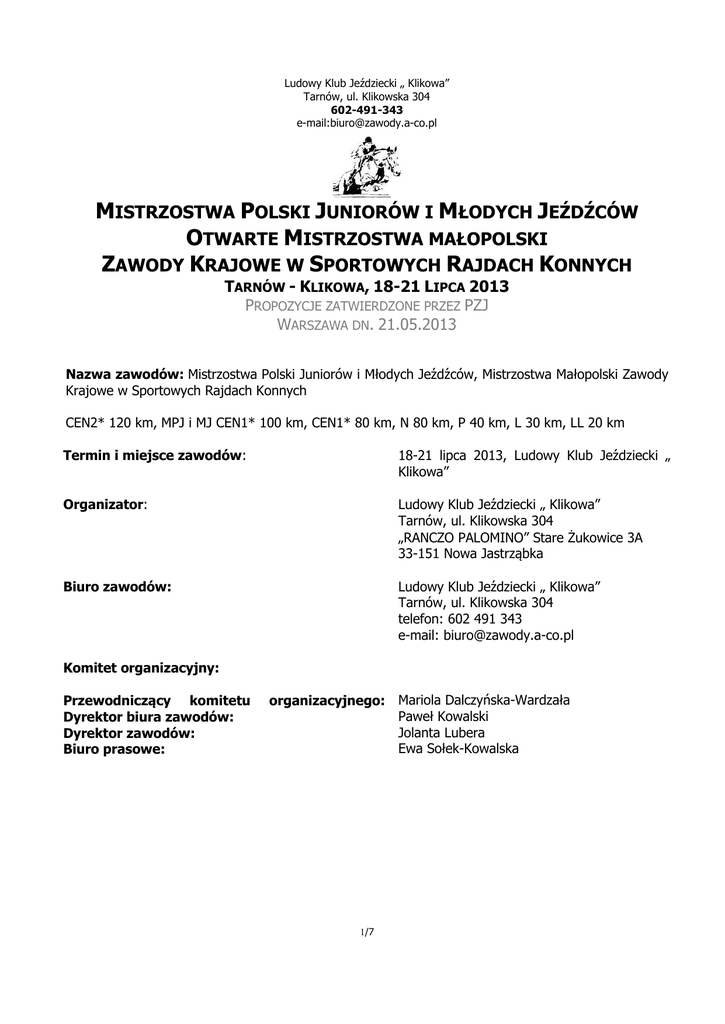 Ludowy Klub Jeździecki „ Klikowa” Tarnów, ul. Klikowska 304 602-491-343 e-mail:[email protected] MISTRZOSTWA POLSKI JUNIORÓW I MŁODYCH JEŹDŹCÓW OTWARTE MISTRZOSTWA MAŁOPOLSKI ZAWODY KRAJOWE W SPORTOWYCH RAJDACH KONNYCH TARNÓW - KLIKOWA, 18-21 LIPCA 2013 PROPOZYCJE ZATWIERDZONE PRZEZ PZJ WARSZAWA DN. 21.05.2013 Nazwa zawodów: Mistrzostwa Polski Juniorów i Młodych Jeźdźców, Mistrzostwa Małopolski Zawody Krajowe w Sportowych Rajdach Konnych CEN2* 120 km, MPJ i MJ CEN1* 100 km, CEN1* 80 km, N 80 km, P 40 km, L 30 km, LL 20 km Termin i miejsce zawodów: 18-21 lipca 2013, Ludowy Klub Jeździecki „ Klikowa” Organizator: Ludowy Klub Jeździecki „ Klikowa” Tarnów, ul. Klikowska 304 „RANCZO PALOMINO” Stare Żukowice 3A 33-151 Nowa Jastrząbka Biuro zawodów: Ludowy Klub Jeździecki „ Klikowa” Tarnów, ul. Klikowska 304 telefon: 602 491 343 e-mail: [email protected] Komitet organizacyjny: Przewodniczący komitetu Dyrektor biura zawodów: Dyrektor zawodów: Biuro prasowe: organizacyjnego: Mariola Dalczyńska-Wardzała Paweł Kowalski Jolanta Lubera Ewa Sołek-Kowalska 1/7 Ludowy Klub Jeździecki „ Klikowa” Tarnów, ul. Klikowska 304 602-491-343 e-mail:[email protected] PRZEPISY OGÓLNE Zawody odbywają się w oparciu o obowiązujące przepisy i regulaminy PZJ oraz według niniejszych propozycji. OSOBY OFICJALNE - Zawody Krajowe Sędzia Główny Delegat Techniczny/Komisarz Chief Steward Gospodarz toru Przewodniczący Komisja sędziowska Małgorzata Kram POL Grażyna Kańka POL Anna Skobrtal POL Anna Hadała POL Krzysztof Krasuski POL Paweł Kleszcz POL Paweł Kowalski POL Komisja weterynaryjna lek. wet. Jacek Kańka POL Lek. wet. Peter Jahn CZE lek. wet. Mateusz Hecold POL lek. wet. Wojciech Piekałkiewicz POL lek. wet. Zbigniew Kołodziejski POL Lekarz weterynarii zawodów lek. wet. Piotr Szpotański lek. wet. Jarosław Rubersz Zabezpieczenie medyczne zawodów i lekarz dla lek. med. Norbert Januszek zawodników Serwis kowalski Tadeusz Południak 2/7 PROGRAM ZAWODÓW Ludowy Klub Jeździecki „ Klikowa” Tarnów, ul. Klikowska 304 602-491-343 e-mail:[email protected] Czwartek 18.07.2013 Godzina 17.00 – przegląd weterynaryjny dla konkursów 1 do 3 Godzina 19.00 – odprawa techniczna Piątek 19.07.2013 Konkurs nr 1 godz. 6.30 Konkurs CEN 1* Otwarte Mistrzostwa Małopolski dystans 80 km – na czas w Sportowych Rajdach Konnych Bramki weterynaryjne po 30 km, 60 km i na mecie po 80 km. Przerwa po 30 km - 40 min , 60 km - 40 min Zasady rozgrywania konkursu zgodnie z regulaminem PZJ obowiązującym w dniu zawodów. Tytuł Mistrza Małopolski zostanie przyznany przy minimum 3 startujących parach. Konkurs Best Condition Konkurs 2 godz. 7.00 Konkurs ZK N dystans 80 km – na normę czasu Bramki weterynaryjne po 30 km, 60 km i na mecie po 80 km . Przerwa po 30 km - 40 min, 60 km - 40 min. Zasady rozgrywania konkursu zgodnie z regulaminem PZJ obowiązującym w dniu zawodów. Konkurs nr 3 Konkurs ZK LL Bramka weterynaryjna na mecie po 20 km. godz. 7:30 dystans 20 km - na normę czasu Zasady rozgrywania konkursu zgodnie z regulaminem PZJ obowiązującym w dniu zawodów. Godzina 17.00 – przegląd weterynaryjny dla konkursów 4 do 7 Godzina 19.00 – odprawa techniczna Sobota 20.07.2013 Konkurs nr 4 godz. 6.00 Konkurs CEN 2* dystans 120 km – na czas Bramki weterynaryjne po 30 km, 60 km, 90 km i na mecie po 120 km. Przerwa po 30 km - 40 min , 60 km - 40 min, po 90 km – 40 min. Zasady rozgrywania konkursu zgodnie z regulaminem PZJ obowiązującym w dniu zawodów. 3/7 Ludowy Klub Jeździecki „ Klikowa” Tarnów, ul. Klikowska 304 602-491-343 e-mail:[email protected] Konkurs nr 5 godz. 6.30 Konkurs CEN 1* Mistrzostwa Polski Juniorów i Młodych Dystans100 km – na czas Jeźdźców Bramki weterynaryjne po 40 km, 70 km i na mecie po 100 km. Przerwa po 40 km - 50 min , 70 km - 50 min Zasady rozgrywania konkursu zgodnie z regulaminem PZJ obowiązującym w dniu zawodów. Zawodnicy, którzy chcą być klasyfikowani w konkursie Mistrzostw Polski Juniorów i Młodych Jeźdźców , a chcący startować w konkursie CEI1* zobligowani są do zgłoszenia się równocześnie na konkurs CEI1* i CEN1* Zgodnie z przepisami ogólnymi PZJ Mistrzostwa Polski Juniorów i Mistrzostwa Polski Młodych Jeźdźców zostaną rozegrane wyłącznie przy zgłoszeniu się minimum 6 zawodników . Konkurs Best Condition Konkurs nr 6 godz. 7:00 Konkurs ZK P dystans 40 km - na normę czasu Bramka weterynaryjna po 20 km i na mecie po 40 km. Przerwa po 20 km - 40 min. Zasady rozgrywania konkursu zgodnie z regulaminem PZJ obowiązującym w dniu zawodów. Konkurs nr 7 godz. 7:30 Konkurs ZK L dystans 30 km -na normę czasu Bramka weterynaryjna po 15 km (lotna) i na mecie po 30 km. Zasady rozgrywania konkursu zgodnie z regulaminem PZJ obowiązującym w dniu zawodów. Godziny rozpoczęcia konkursów mogą zostać zmienione na odprawie technicznej. Niedziela 21.07.2013 Zakończenie zawodów i uroczyste ogłoszenie wyników niedziela 21.07.2013. godz. 11:00 INFORMACJA O TRASIE Opis trasy: zawody rozgrywane będą na terenach Płaskowyżu Tarnowskiego. Start i meta: Ludowy Klub Jeździecki w Tarnowie „Klikowa”. Trasa przebiega terenem nizinnym, częściowo zalesionym Podłoże - drogi leśne i polne, piaszczyste, dłuższe odcinki dróg bitych, utwardzonych, szutrowych, również odcinki asfaltu. Różnica wzniesień: 5-30 metrów. Pętle o długości 15 km, 20 km, 30 km. Mapa dostępna będzie na stronie internetowej www.zawody.a-co.pl oraz na www.facebook.com/lkj.klikowa.endurance 4/7 ŚWIADCZENIA Ludowy Klub Jeździecki „ Klikowa” Tarnów, ul. Klikowska 304 602-491-343 e-mail:[email protected] Zakwaterowanie: Noclegi proszę rezerwować indywidualnie. Możliwe miejsca zakwaterowania w okolicach LKJ Klikowa: Hotel „Tarnovia”, ul. Kościuszki, Tarnów tel. 14 6300350 Camping „ Pod Jabłoniami” (domki, hotel), ul. Piłsudskiego, Tarnów, tel. 14 6215124 Hotel Chemik ul.Traugutta 5, Tarnów, t