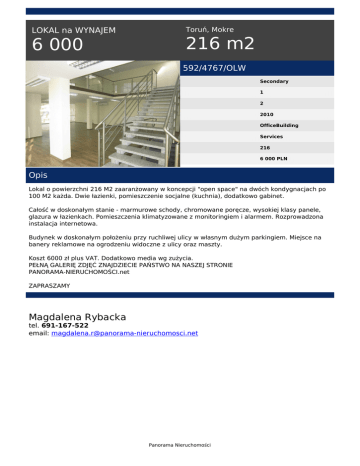 LOKAL na WYNAJEM 6 000 Toruń, Mokre 216 m2 592/4767/OLW Secondary 1 2 2010 OfficeBuilding Services 216 6 000 PLN Opis Lokal o powierzchni 216 M2 zaaranżowany w koncepcji "open space" na dwóch kondygnacjach po 100 M2 każda. Dwie łazienki, pomieszczenie socjalne (kuchnia), dodatkowo gabinet. Całość w doskonałym stanie - marmurowe schody, chromowane poręcze, wysokiej klasy panele, glazura w łazienkach. Pomieszczenia klimatyzowane z monitoringiem i alarmem. Rozprowadzona instalacja internetowa. Budynek w doskonałym położeniu przy ruchliwej ulicy w własnym dużym parkingiem. Miejsce na banery reklamowe na ogrodzeniu widoczne z ulicy oraz maszty. Koszt 6000 zł plus VAT. Dodatkowo media wg zużycia. PEŁNĄ GALERIĘ ZDJĘĆ ZNAJDZIECIE PAŃSTWO NA NASZEJ STRONIE PANORAMA-NIERUCHOMOŚCI.net ZAPRASZAMY Magdalena Rybacka tel. 691-167-522 email: [email protected] Panorama Nieruchomości Powered by TCPDF (www.tcpdf.org)
