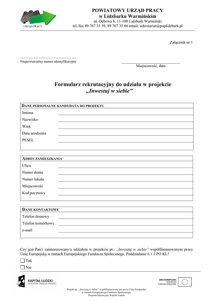 POWIATOWY URZĄD PRACY w Lidzbarku Warmińskim ul. Dębowa 8, 11-100 Lidzbark Warmiński tel./fax 89 767 33 39, 89 767 35 66 email: [email protected] Załącznik nr 1 ……………………..…….. Niepowtarzalny numer identyfikacyjny Miejscowość, data Formularz rekrutacyjny do udziału w projekcie „Inwestuj w siebie” DANE PERSONALNE KANDYDATA DO PROJEKTU Imiona Nazwisko Wiek Data urodzenia PESEL ADRES ZAMIESZKANIA Ulica Numer domu Numer lokalu Miejscowość Kod pocztowy DANE KONTAKTOWE Telefon domowy Telefon komórkowy e-mail Czy jest Pan/i zainteresowany/a udziałem w projekcie pt.: „Inwestuj w siebie” współfinansowanym przez Unię Europejską w ramach Europejskiego Funduszu Społecznego, Poddziałanie 6.1.1 PO KL? Tak Nie Projekt pt.: „Inwestuj w siebie” współfinansowany jest przez Unię Europejską w ramach Europejskiego Funduszu Społecznego, Program Operacyjny Kapitał Ludzki POWIATOWY URZĄD PRACY w Lidzbarku Warmińskim ul. Dębowa 8, 11-100 Lidzbark Warmiński tel./fax 89 767 33 39, 89 767 35 66 email: [email protected] INFORMACJE DODATKOWE Wyższe – zawód wyuczony: Wykształcenie ........................................................... Pomaturalne – zawód wyuczony: ........................................................... Policealne – zawód wyuczony: ............................................................... Średnie ogólnokształcące Średnie zawodowe – zawód wyuczony: ............................................................ Zasadnicze zawodowe – zawód wyuczony: ....................................................... Gimnazjalne Podstawowe Niepełne podstawowe Brak Doświadczenie zawodowe Poniżej 1 roku 1 rok – 2 lata Powyżej 2 lat Kobieta Płeć Mężczyzna Miasto Miejsce zamieszkania Wieś Czy jest Pan/i osobą samotnie wychowującą co najmniej jedno dziecko do 7 roku życia? Czy jest Pan/i osobą sprawującą opiekę nad osobą zależną? Tak Nie Tak Nie Czas pozostawania bez pracy Do 12 miesięcy Powyżej 12 miesięcy Projekt pt.: „Inwestuj w siebie” współfinansowany jest przez Unię Europejską w ramach Europejskiego Funduszu Społecznego, Program Operacyjny Kapitał Ludzki POWIATOWY URZĄD PRACY w Lidzbarku Warmińskim ul. Dębowa 8, 11-100 Lidzbark Warmiński tel./fax 89 767 33 39, 89 767 35 66 email: [email protected] W jakiej formie wsparcia chciałby/aby Pan/i uczestniczyć? w stażu zawodowym lub UWAGA!!! w szkoleniu zawodowym Projekt „Inwestuj w siebie” zakłada uczestnictwo w stażu lub szkoleniu zawodowym. w przypadku zaznaczenia odpowiedzi: w szkoleniu zawodowym, Należy wybrać jedną proszę o wskazanie kierunku szkolenia, w którym chciałby/aby Pan/i uczestniczyć: z powyższych form wsparcia. Opiekun dziecięcy, Spawacz, Manager ds. gastronomii i hotelarstwa z językiem angielskim, w przypadku zaznaczenia szkolenia: Manager ds. gastronomii i hotelarstwa z językiem angielskim, proszę określić jak ocenia Pan/i swój poziom znajomości języka angielskiego? brak znajomości dobra znajomość • Wyrażam zgodę na przetwarzanie moich danych osobowych, niezbędnych w procesie rekrutacji, dla potrzeb projektu, zgodnie z ustawą z dn. 29.08.1997 r. o ochronie danych osobowych (Dz. U. z 2002 r., nr 101, poz. 926, z późn. zm.). ………………………………….. (miejscowość, data) • Oświadczam, że zapoznałem się z Regulaminem Projektu „Inwestuj w siebie” Poddziałanie 6.1.1 PO KL i akceptuję zawarte w nim procedury. ………………………………….. (miejscowość, data) • …………………………………………… (czytelny podpis uczestnika projektu) …………………………………………… (czytelny podpis uczestnika projektu) Oświadczam, że spełniam warunki Projektu ujęte w Regulaminie Projektu „Inwestuj w siebie” Poddziałanie 6.1.1 PO KL. ………………………………….. (miejscowość, data) …………………………………………… (czytelny podpis uczestnika projektu) Projekt pt.: „Inwestuj w siebie” współfinansowany jest przez Unię Europejską w ramach Europejskiego Funduszu Społecznego, Program Operacyjny Kapitał Ludzki