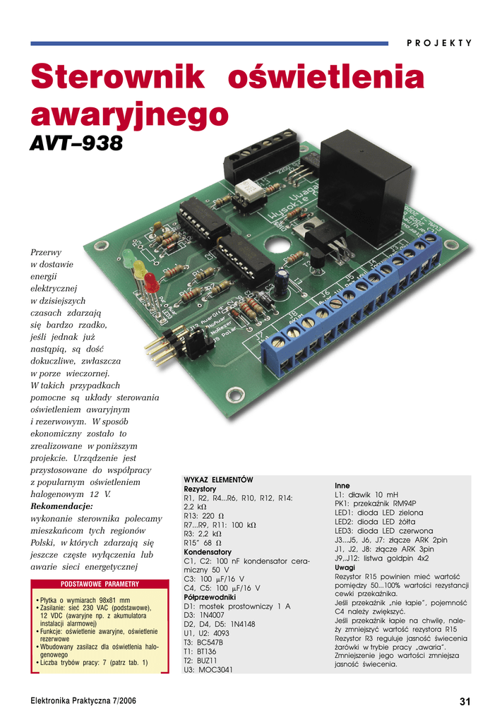 Sterownik oświetlenia P R awaryjnego O J E K T Y Sterownik oświetlenia awaryjnego AVT–938 Przerwy w dostawie energii elektrycznej w dzisiejszych czasach zdarzają się bardzo rzadko, jeśli jednak już nastąpią, są dość dokuczliwe, zwłaszcza w porze wieczornej. W takich przypadkach pomocne są układy sterowania oświetleniem awaryjnym i rezerwowym. W sposób ekonomiczny zostało to zrealizowane w poniższym projekcie. Urządzenie jest przystosowane do współpracy z popularnym oświetleniem halogenowym 12 V. Rekomendacje: wykonanie sterownika polecamy mieszkańcom tych regionów Polski, w których zdarzają się jeszcze częste wyłączenia lub awarie sieci energetycznej PODSTAWOWE PARAMETRY • Płytka o wymiarach 98x81 mm • Zasilanie: sieć 230 VAC (podstawowe), 12 VDC (awaryjne np. z akumulatora instalacji alarmowej) • Funkcje: oświetlenie awaryjne, oświetlenie rezerwowe • Wbudowany zasilacz dla oświetlenia halogenowego • Liczba trybów pracy: 7 (patrz tab. 1) Elektronika Praktyczna 7/2006 WYKAZ ELEMENTÓW Rezystory R1, R2, R4...R6, R10, R12, R14: 2,2 kV R13: 220 V R7...R9, R11: 100 kV R3: 2,2 kV R15” 68 V Kondensatory C1, C2: 100 nF kondensator ceramiczny 50 V C3: 100 mF/16 V C4, C5: 100 mF/16 V Półprzewodniki D1: mostek prostowniczy 1 A D3: 1N4007 D2, D4, D5: 1N4148 U1, U2: 4093 T3: BC547B T1: BT136 T2: BUZ11 U3: MOC3041 Inne L1: dławik 10 mH PK1: przekaźnik RM94P LED1: dioda LED zielona LED2: dioda LED żółta LED3: dioda LED czerwona J3...J5, J6, J7: złącze ARK 2pin J1, J2, J8: złącze ARK 3pin J9,.J12: listwa goldpin 4x2 Uwagi Rezystor R15 powinien mieć wartość pomiędzy 50...100% wartości rezystancji cewki przekaźnika. Jeśli przekaźnik „nie łapie”, pojemność C4 należy zwiększyć. Jeśli przekaźnik łapie na chwilę, należy zmniejszyć wartość rezystora R15 Rezystor R3 reguluje jasność świecenia żarówki w trybie pracy „awaria”. Zmniejszenie jego wartości zmniejsza jasność świecenia. 31
