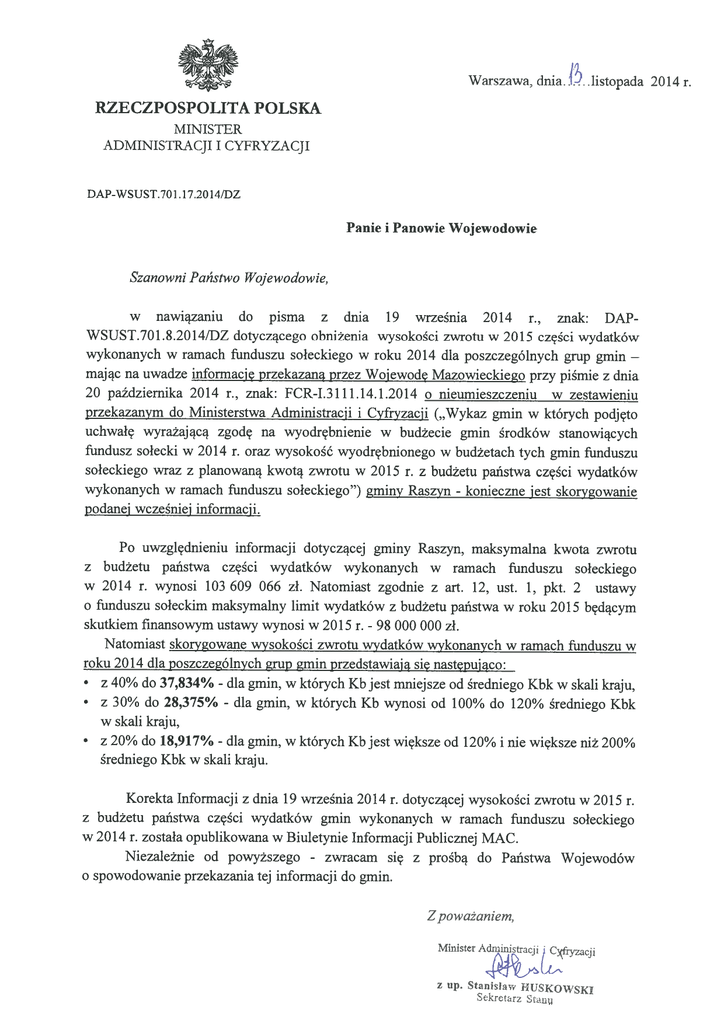 Warszawa, dnia. I?. .listopada 2014 r. RZECZPOSPOLITA POLSKA MINISTER ADMINISTRACJI I CYFRYZACJI DAP-WSUST.70 1.17.2014/DZ Panie i Panowie Wojewodowie Szanowni Państwo Wojewodowie, w nawiązaniu do pisma z dnia 19 września 2014 r., znak: DAP WSUST.701.8.2014/DZ dotyczącego obniżenia wysokości zwrotu w 2015 części wydatków wykonanych w ramach funduszu sołeckiego w roku 2014 dla poszczególnych grup gmin mając na uwadze informację przekazaną przez Wojewodę Mazowieckiego przy piśmie z dnia 20 października 2014 r., znak: FCR-I.3111.14.1.2014 o nieumieszczeniu w zestawieniu przekazanym do Ministerstwa Administracji i Cyfryzacji („Wykaz gmin w których podjęto uchwałę wyrażającą zgodę na wyodrębnienie w budżecie gmin środków stanowiących fundusz sołecki w 2014 r. oraz wysokość wyodrębnionego w budżetach tych gmin funduszu sołeckiego wraz z planowaną kwotą zwrotu w 2015 r. z budżetu państwa części wydatków wykonanych w ramach funduszu sołeckiego”) gminy Raszyn konieczne jest skorygowanie podanej wcześniej informacji. — Po uwzględnieniu informacji dotyczącej gminy Raszyn, maksymalna kwota zwrotu z budżetu państwa części wydatków wykonanych w ramach funduszu sołeckiego w 2014 r. wynosi 103 609 066 zł. Natomiast zgodnie z art. 12, ust. 1, pkt. 2 ustawy o funduszu sołeckim maksymalny limit wydatków z budżetu państwa w roku 2015 będącym skutkiem finansowym ustawy wynosi w 2015 r. 98 000 000 zł. Natomiast skoryowane wysokości zwrotu wydatków wykonanych w ramach funduszu w roku 2014 dla poszczeó1nych grup gmin przedstawiają się następująco: • z 40% do 37,834% dla gmin, w których Kb jest niniejsze od średniego Kbk w skali kraju, • z 30% do 28,375% dla gmin, w których Kb wynosi od 100% do 120% średniego Kbk w skali kraju, • z 20% do 18,917% dla gmin, w których Kb jest większe od 120% i nie większe niż 200% średniego Kbk w skali kraju. - - - - Korekta Informacji z dnia 19 września 2014 r. dotyczącej wysokości zwrotu w 2015 r. z budżetu państwa części wydatków gmin wykonanych w ramach funduszu sołeckiego w 2014 r. została opublikowana w Biuletynie Informacji Publicznej MAC. Niezależnie od powyższego zwracam się z prośbą do Państwa Wojewodów spowodowan o ie przekazania tej informacji do gmin. - Z poważaniem, Miistr Admistracjic 1 y z up. Saw FJUSKOWSKI Skrctarz