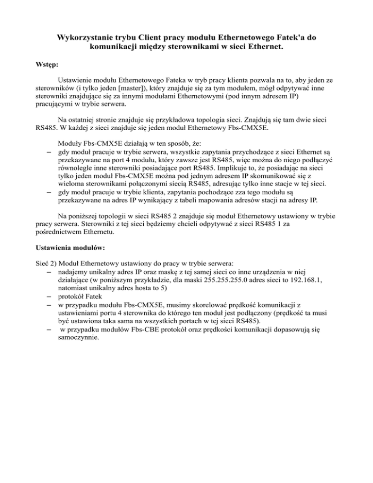 Wykorzystanie trybu Client pracy modułu Ethernetowego Fatek'a do komunikacji między sterownikami w sieci Ethernet. Wstęp: Ustawienie modułu Ethernetowego Fateka w tryb pracy klienta pozwala na to, aby jeden ze sterowników (i tylko jeden [master]), który znajduje się za tym modułem, mógł odpytywać inne sterowniki znajdujące się za innymi modułami Ethernetowymi (pod innym adresem IP) pracującymi w trybie serwera. Na ostatniej stronie znajduje się przykładowa topologia sieci. Znajdują się tam dwie sieci RS485. W każdej z sieci znajduje się jeden moduł Ethernetowy Fbs-CMX5E. Moduły Fbs-CMX5E działają w ten sposób, że: – gdy moduł pracuje w trybie serwera, wszystkie zapytania przychodzące z sieci Ethernet są przekazywane na port 4 modułu, który zawsze jest RS485, więc można do niego podłączyć równolegle inne sterowniki posiadające port RS485. Implikuje to, że posiadając na sieci tylko jeden moduł Fbs-CMX5E można pod jednym adresem IP skomunikować się z wieloma sterownikami połączonymi siecią RS485, adresując tylko inne stacje w tej sieci. – gdy moduł pracuje w trybie klienta, zapytania pochodzące zza tego modułu są przekazywane na adres IP wynikający z tabeli mapowania adresów stacji na adresy IP. Na poniższej topologii w sieci RS485 2 znajduje się moduł Ethernetowy ustawiony w trybie pracy serwera. Sterowniki z tej sieci będziemy chcieli odpytywać z sieci RS485 1 za pośrednictwem Ethernetu. Ustawienia modułów: Sieć 2) Moduł Ethernetowy ustawiony do pracy w trybie serwera: – nadajemy unikalny adres IP oraz maskę z tej samej sieci co inne urządzenia w niej działające (w poniższym przykładzie, dla maski 255.255.255.0 adres sieci to 192.168.1, natomiast unikalny adres hosta to 5) – protokół Fatek – w przypadku modułu Fbs-CMX5E, musimy skorelować prędkość komunikacji z ustawieniami portu 4 sterownika do którego ten moduł jest podłączony (prędkość ta musi być ustawiona taka sama na wszystkich portach w tej sieci RS485). – w przypadku modułów Fbs-CBE protokół oraz prędkości komunikacji dopasowują się samoczynnie. Podsumowując – powyższe ustawienia są ustawieniami jakie dokonujemy wtedy gdy chcemy się z sieci Ethernet połączyć ze sterownikami Fatek (czy to WinProladderem, FaconServerem, czy innym klientem). Sieć 1) Moduł Ethernetowy ustawiony do pracy w trybie klienta: – na tej samej zasadzie jak powyżej, definiujemy unikalny adres IP w sieci, maskę oraz prędkość komunikacji . – po ustawieniu trybu pracy na klienta pojawia się jeszcze jedna zakładka „Port Mapping” – w zakładce tej definiujemy mapowanie numerów stacji: - z adresów lokalnych na adresy zdalne - z adresów zdalnych na adres IP. W odniesieniu do poniższego przykładu topologii sieci, poniższy wpis w tabeli oznacza: – gdy z sieci znajdującej się za tym modułem nadejdzie zapytanie do stacji nr 12, 13 i 14 podmień te adresy na odpowiednio 1,2, i 3 oraz wyślij wiadomość po porcie 500 pod adres 192.168.1.5. – podmiana adresów lokalnych na zdalne daje nam to, że możemy mieć w obu sieciach pokrywające się adresy stacji (w przykładzie obie sieci mają sterowniki o adresach 1 , 2 i 3). – natomiast w sieci po stronie klienta nie ma adresów stacji 12, 13, 14. Fakt istnienia w zapytaniu któregoś z tych adresów stacji informuje moduł Ethernetowy, że wiadomość tą ma wysłać do sieci Ethernet pod odpowiedni adres IP, wcześniej dokonując podmiany adresu lokalnego na zdalny. Powyższe ustawienia zapewniają przekazywanie zapytań z sieci 1 (klienta) do sieci 2 (serwera). Program komunikacyjny: Odpytywać może tylko jeden spośród sterowników znajdujących się za modułem Ethernetowym ustawionym w tryb Client. Do komunikacji wykorzystujemy funkcję nr 151 CLINK pracującą w trybie 0 (tryb mastera w protokole Fatek). Funkcja 151 w trybie 0 bazuje na tabeli komunikacyjnej „Normal Link Table”, której kreator znajduje się w drzewku projektu WinProladder'a: Znaczenie wpisów w powyższej tabeli w odniesieniu do rozpatrywanej topologii sieci: 0 – odczytaj Markery ze stacji nr 2 (znajdującej się w tej samej sieci RS485) 1- zapisz rejestry do stacji nr 3 (znajdującej się w tej samej sieci RS485) 2 – odczytaj rejestry ze stacji nr 12. Moduł Ethernetowy wykryje ten numer stacji jako przeznaczony do mapowania na stację 1 i wyślę to zapytanie pod adres IP 192.168.1.5 3 - odczytaj markerów ze stacji nr 13. Moduł Ethernetowy wykryje ten numer stacji jako przeznaczony do mapowania na stację 2 i wyślę to zapytanie pod adres IP 192.168.1.5 4 – wysłanie stanów wejść sterownika do markerów stacji nr 14. Moduł Ethernetowy wykryje ten numer stacji jako przeznaczony do mapowania na stację 3 i wyślę to zapytanie pod adres IP 192.168.1.5 Uwaga: Gdy moduł ustawiony jest do pracy w trybie klienta, nie można się z nim połączyć innym klientem , np. z PC programować sterowników WinProladderem. W rozpatrywanym przykładzie, Winproladder połączy się ze sterownikami z sieci 2, nie połączy się z siecią 1. Sieć RS485 2 Stacja 1 PC FBs-CMX5E Stacja 2 FBs-CMX5/CBX5 Stacja 3 FBs-CMX5/CBX5 Switch Sieć RS485 1 Stacja 1 FBs-CMX5E c Stacja 2 FBs-CMX5/CBX5 Stacja 3 FBs-CMX5/CBX5