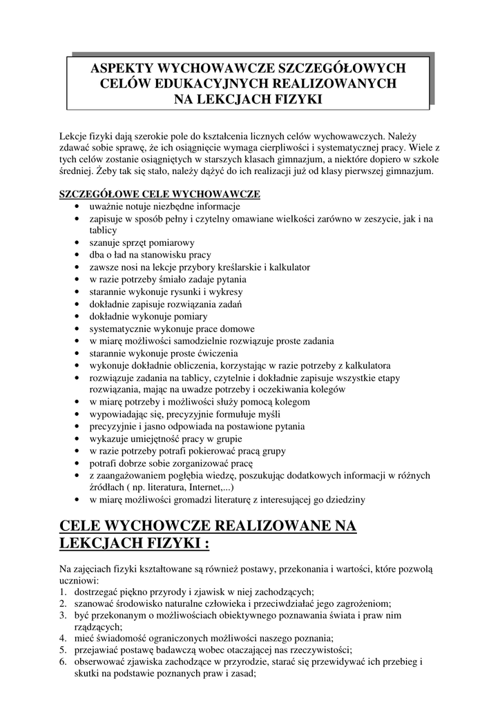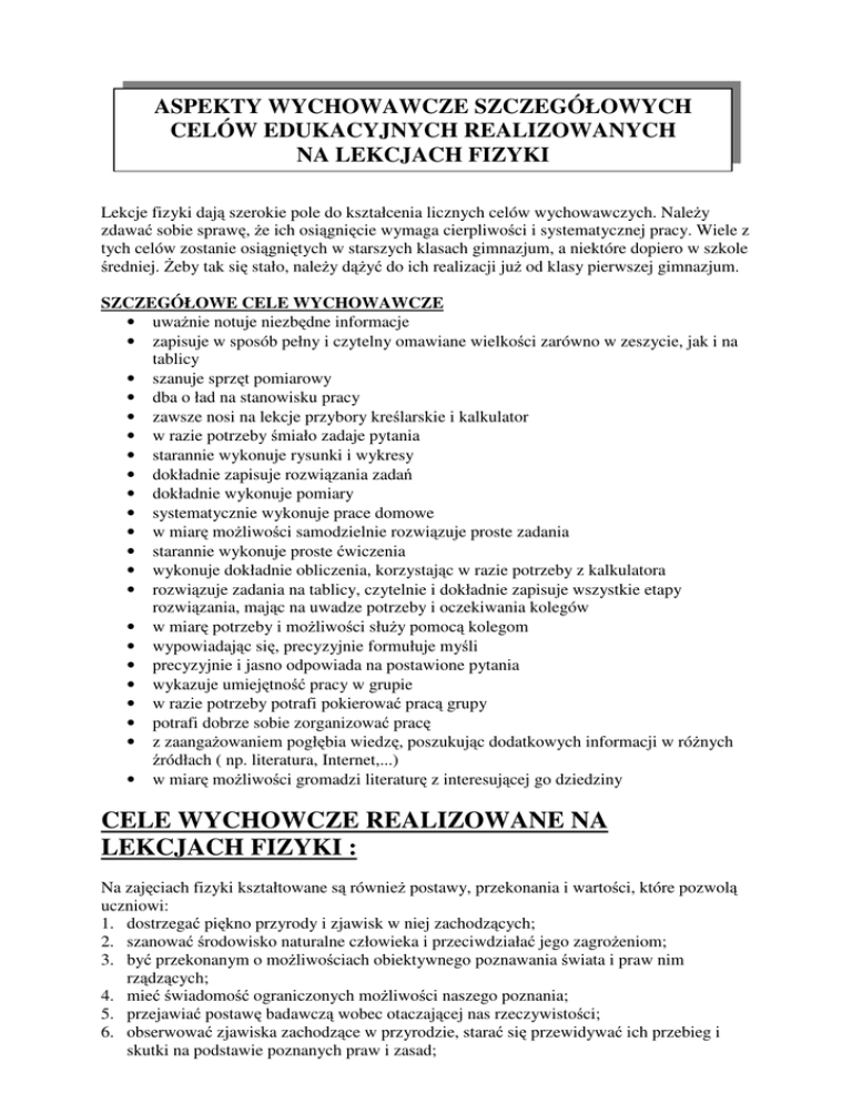 ASPEKTY WYCHOWAWCZE SZCZEGÓŁOWYCH CELÓW EDUKACYJNYCH REALIZOWANYCH NA LEKCJACH FIZYKI Lekcje fizyki dają szerokie pole do kształcenia licznych celów wychowawczych. Należy zdawać sobie sprawę, że ich osiągnięcie wymaga cierpliwości i systematycznej pracy. Wiele z tych celów zostanie osiągniętych w starszych klasach gimnazjum, a niektóre dopiero w szkole średniej. Żeby tak się stało, należy dążyć do ich realizacji już od klasy pierwszej gimnazjum. SZCZEGÓŁOWE CELE WYCHOWAWCZE • uważnie notuje niezbędne informacje • zapisuje w sposób pełny i czytelny omawiane wielkości zarówno w zeszycie, jak i na tablicy • szanuje sprzęt pomiarowy • dba o ład na stanowisku pracy • zawsze nosi na lekcje przybory kreślarskie i kalkulator • w razie potrzeby śmiało zadaje pytania • starannie wykonuje rysunki i wykresy • dokładnie zapisuje rozwiązania zadań • dokładnie wykonuje pomiary • systematycznie wykonuje prace domowe • w miarę możliwości samodzielnie rozwiązuje proste zadania • starannie wykonuje proste ćwiczenia • wykonuje dokładnie obliczenia, korzystając w razie potrzeby z kalkulatora • rozwiązuje zadania na tablicy, czytelnie i dokładnie zapisuje wszystkie etapy rozwiązania, mając na uwadze potrzeby i oczekiwania kolegów • w miarę potrzeby i możliwości służy pomocą kolegom • wypowiadając się, precyzyjnie formułuje myśli • precyzyjnie i jasno odpowiada na postawione pytania • wykazuje umiejętność pracy w grupie • w razie potrzeby potrafi pokierować pracą grupy • potrafi dobrze sobie zorganizować pracę • z zaangażowaniem pogłębia wiedzę, poszukując dodatkowych informacji w różnych źródłach ( np. literatura, Internet,...) • w miarę możliwości gromadzi literaturę z interesującej go dziedziny CELE WYCHOWCZE REALIZOWANE NA LEKCJACH FIZYKI : Na zajęciach fizyki kształtowane są również postawy, przekonania i wartości, które pozwolą uczniowi: 1. dostrzegać piękno przyrody i zjawisk w niej zachodzących; 2. szanować środowisko naturalne człowieka i przeciwdziałać jego zagrożeniom; 3. być przekonanym o możliwościach obiektywnego poznawania świata i praw nim rządzących; 4. mieć świadomość ograniczonych możliwości naszego poznania; 5. przejawiać postawę badawczą wobec otaczającej nas rzeczywistości; 6. obserwować zjawiska zachodzące w przyrodzie, starać się przewidywać ich przebieg i skutki na podstawie poznanych praw i zasad; 7. doceniać rolę wiedzy w rozwoju naszej cywilizacji; 8. dostrzegać zagrożenia dla człowieka i naszego środowiska wynikające z rozwoju nauki i techniki; 9. współpracować w zespole w celu osiągnięcia zamierzonego celu; 10. doceniać rolę pracy zespołowej; 11. prezentować i uzasadniać swoje poglądy i przekonania; 12. wykazywać cierpliwość i dokładność w pracy; 13. mieć przekonanie o możliwościach i korzyściach wynikających ze stosowania zdobyczy informacyjnych naszej cywilizacji; 14. być współodpowiedzialnym za użytkowanie wspólnych zasobów informacyjnych i korzystanie z technologii komputerowej; 15. odczuwać satysfakcje i radość poznania; 16. mieć poczucie własnej wartości i znać swoje możliwości; 17. planować własny rozwój intelektualny i być za niego odpowiedzialnym. 18. prezentować postawy odpowiedzialności za własny rozwój intelektualny 19. przejawiać zaangażowanie w zdobywaniu wiedzy i rozwijaniu zainteresowań 20. prezentować dociekliwość i postawę badawczą 21. prezentować postawę życzliwości wobec kolegów 22. prezentować postawę rzetelności w przygotowywaniu do zajęć lekcyjnych, opracowywaniu wyników ćwiczeń i eksperymentów fizycznych 23. wykonywać dokładnie i precyzyjnie obliczenia i wykresy 24. prezentować postawy samodzielności w podejmowaniu decyzji 25. pracować umiejętnie w grupie 26. przestrzegać zasady BHP Cele wychowawcze realizowane na pojedynczych lekcjach • • • • • • • • • • • • • • • • • • • • Umiejętne i ostrożne obchodzenie się z przyrządami Dokładne i staranne pomiary i sporządzanie wykresów prowadzące do wyciągania poprawnych wniosków z doświadczeń Wdrażanie uczniów do pracy w grupie Uświadamianie uczniom korzyści płynących z dobrze zaplanowanej pracy w grupie Ostrożne obchodzenie się z ogniem, prądem elektrycznym, szkłem laboratoryjnym Wdrażanie poczucia odpowiedzialności za powierzony sprzęt, miejsce pracy, Uzmysłowienie uczniom związku między doświadczeniami i obserwacjami z życia codziennego a ważnymi odkryciami naukowymi i prawami fizycznymi Zwrócenie uwagi uczniów na praktyczne znaczenie pojęcia prędkości Uzmysłowienie uczniom znaczenia starannego wykonywania pomiarów i wykresów Zwrócenie uwagi uczniów na praktyczne znaczenie składania sił Wpływ tarcia na bezpieczeństwo na drogach Wdrażanie uczniów do współpracy- umiejętne korzystanie z pracy innych i udostępnianie efektów swojej pracy Uzmysłowienie uczniom, że cierpliwość, dokładność i staranność pomiaru przynoszą spodziewane efekty Poznanie słuszności III zasady dynamiki dla życia człowieka ,, Jak Kuba Bogu, tak Bóg Kubie” Uświadomienie uczniom znaczenia odkryć praw fizyki w życiu codziennym człowieka i kształtowanie uznania dla ludzi nauki Kształtowanie pożądanych postaw ( koleżeństwo, życzliwość, wzajemna pomoc podczas pracy w grupie) Kształtowanie nawyku do porządku, sumienności, dokładności pomiarów Bezpieczne i ostrożne wykonywanie eksperymentu Wyrabianie nawyku porządku, staranności, dobrej organizacji, dokładnego odczytywania wyniku pomiaru Kształtowanie poczucia odpowiedzialności za powierzony sprzęt • • • • • • • • • • • Kształtowanie poczucia odpowiedzialności za członków grupy ( solidarność, współpraca, życzliwość, chęć pomocy, dobra organizacja pracy, planowanie) Kształtowanie umiejętno