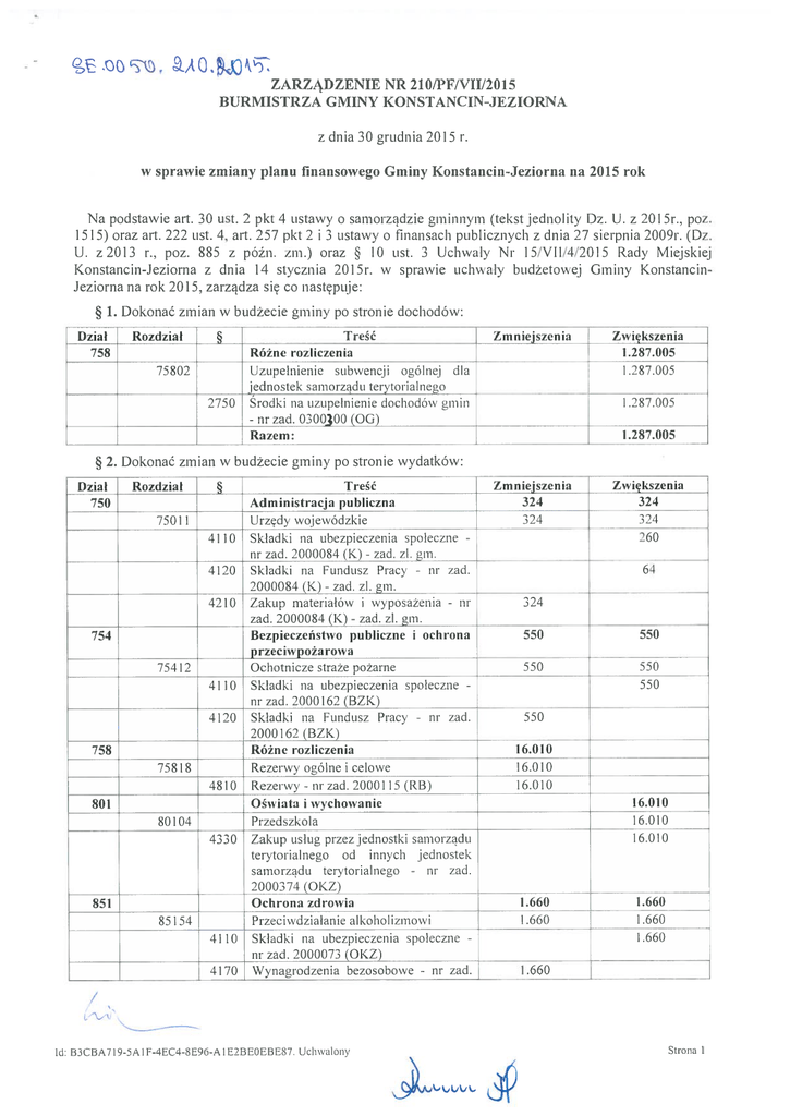 Konstancin-Jeziorna z dnia 30 grudnia 2015r. y sprawie zmian w budżecie gminy na rok 2015.