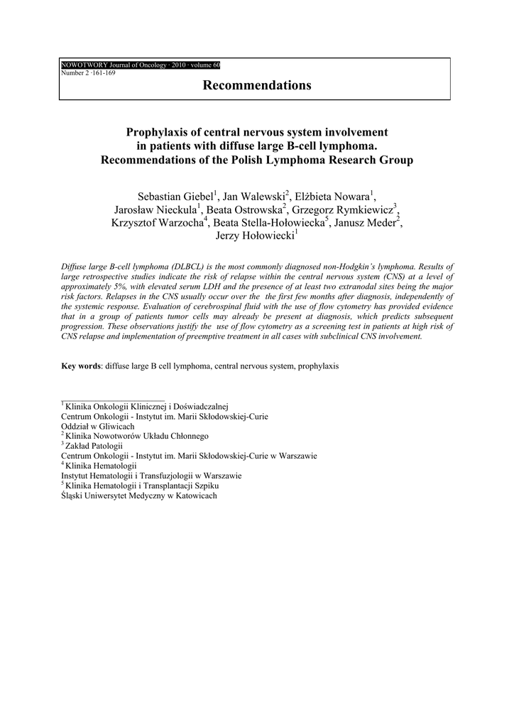 NOWOTWORY Journal of Oncology · 2010 · volume 60 Number 2 ·161-169 Recommendations Prophylaxis of central nervous system involvement in patients with diffuse large B-cell lymphoma. Recommendations of the Polish Lymphoma Research Group Sebastian Giebel1, Jan Walewski2, Elżbieta Nowara1, Jarosław Nieckula1, Beata Ostrowska2, Grzegorz Rymkiewicz3, Krzysztof Warzocha4, Beata Stella-Hołowiecka5, Janusz Meder2, Jerzy Hołowiecki1 Diffuse large B-cell lymphoma (DLBCL) is the most commonly diagnosed non-Hodgkin’s lymphoma. Results of large retrospective studies indicate the risk of relapse within the central nervous system (CNS) at a level of approximately 5%, with elevated serum LDH and the presence of at least two extranodal sites being the major risk factors. Relapses in the CNS usually occur over the the first few months after diagnosis, independently of the systemic response. Evaluation of cerebrospinal fluid with the use of flow cytometry has provided evidence that in a group of patients tumor cells may already be present at diagnosis, which predicts subsequent progression. These observations justify the use of flow cytometry as a screening test in patients at high risk of CNS relapse and implementation of preemptive treatment in all cases with subclinical CNS involvement. Key words: diffuse large B cell lymphoma, central nervous system, prophylaxis ________________________ 1 Klinika Onkologii Klinicznej i Doświadczalnej Centrum Onkologii - Instytut im. Marii Skłodowskiej-Curie Oddział w Gliwicach 2 Klinika Nowotworów Układu Chłonnego 3 Zakład Patologii Centrum Onkologii - Instytut im. Marii Skłodowskiej-Curie w Warszawie 4 Klinika Hematologii Instytut Hematologii i Transfuzjologii w Warszawie 5 Klinika Hematologii i Transplantacji Szpiku Śląski Uniwersytet Medyczny w Katowicach