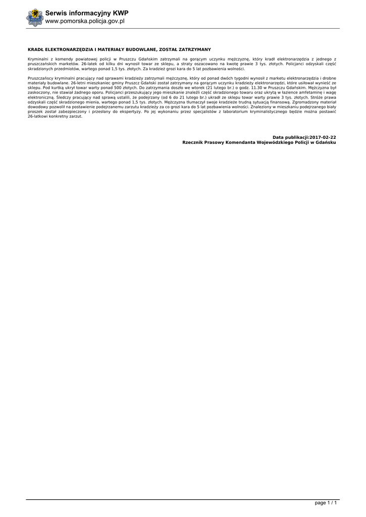 Serwis informacyjny KWP www.pomorska.policja.gov.pl KRADŁ ELEKTRONARZĘDZIA I MATERIAŁY BUDOWLANE, ZOSTAŁ ZATRZYMANY Kryminalni z komendy powiatowej policji w Pruszczu Gdańskim zatrzymali na gorącym uczynku mężczyznę, który kradł elektronarzędzia z jednego z pruszczańskich marketów. 26-latek od kilku dni wynosił towar ze sklepu, a straty oszacowano na kwotę prawie 3 tys. złotych. Policjanci odzyskali część skradzionych przedmiotów, wartego ponad 1,5 tys. złotych. Za kradzież grozi kara do 5 lat pozbawienia wolności. Pruszczańscy kryminalni pracujący nad sprawami kradzieży zatrzymali mężczyznę, który od ponad dwóch tygodni wynosił z marketu elektronarzędzia i drobne materiały budowlane. 26-letni mieszkaniec gminy Pruszcz Gdański został zatrzymany na gorącym uczynku kradzieży elektronarzędzi, które usiłował wynieść ze sklepu. Pod kurtką ukrył towar warty ponad 500 złotych. Do zatrzymania doszło we wtorek (21 lutego br.) o godz. 11.30 w Pruszczu Gdańskim. Mężczyzna był zaskoczony, nie stawiał żadnego oporu. Policjanci przeszukujący jego mieszkanie znaleźli część skradzionego towaru oraz ukrytą w łazience amfetaminę i wagę elektroniczną. Śledczy pracujący nad sprawą ustalili, że podejrzany (od 6 do 21 lutego br.) ukradł ze sklepu towar warty prawie 3 tys. złotych. Stróże prawa odzyskali część skradzionego mienia, wartego ponad 1,5 tys. złotych. Mężczyzna tłumaczył swoje kradzieże trudną sytuacją finansową. Zgromadzony materiał dowodowy pozwolił na postawienie podejrzanemu zarzutu kradzieży za co grozi kara do 5 lat pozbawienia wolności. Znaleziony w mieszkaniu podejrzanego biały proszek został zabezpieczony i przesłany do ekspertyzy. Po jej wykonaniu przez specjalistów z laboratorium kryminalistycznego będzie można postawić 26-latkowi konkretny zarzut. Data publikacji:2017-02-22 Rzecznik Prasowy Komendanta Wojewódzkiego Policji w Gdańsku page 1 / 1 Powered by TCPDF (www.tcpdf.org)