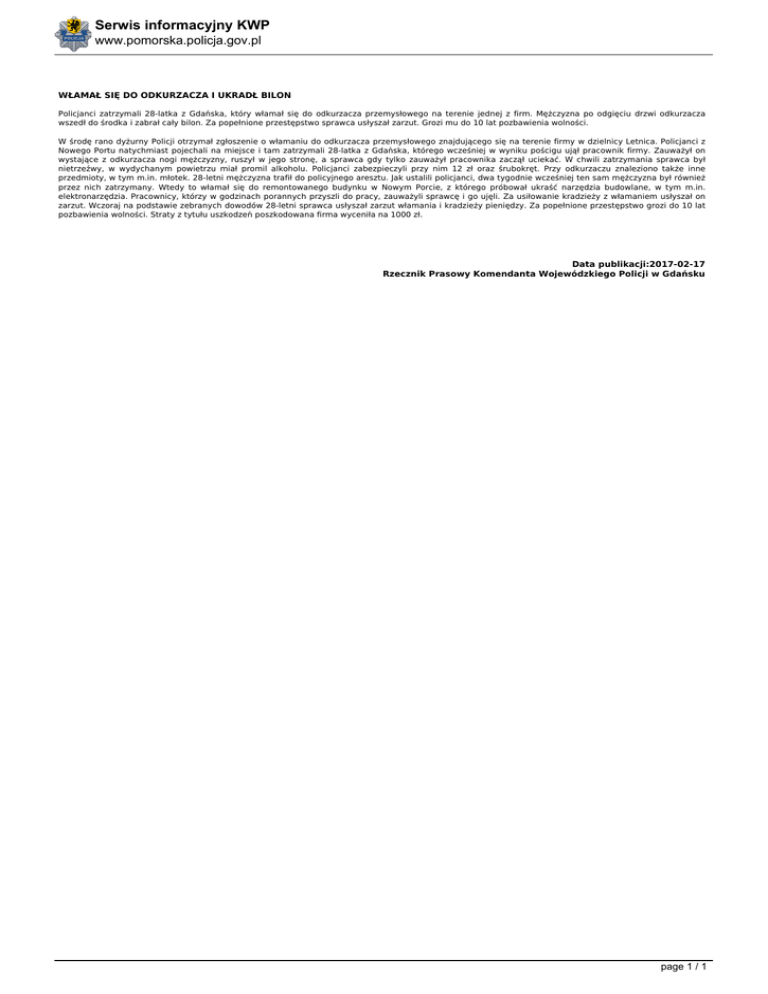 Serwis informacyjny KWP www.pomorska.policja.gov.pl WŁAMAŁ SIĘ DO ODKURZACZA I UKRADŁ BILON Policjanci zatrzymali 28-latka z Gdańska, który włamał się do odkurzacza przemysłowego na terenie jednej z firm. Mężczyzna po odgięciu drzwi odkurzacza wszedł do środka i zabrał cały bilon. Za popełnione przestępstwo sprawca usłyszał zarzut. Grozi mu do 10 lat pozbawienia wolności. W środę rano dyżurny Policji otrzymał zgłoszenie o włamaniu do odkurzacza przemysłowego znajdującego się na terenie firmy w dzielnicy Letnica. Policjanci z Nowego Portu natychmiast pojechali na miejsce i tam zatrzymali 28-latka z Gdańska, którego wcześniej w wyniku pościgu ujął pracownik firmy. Zauważył on wystające z odkurzacza nogi mężczyzny, ruszył w jego stronę, a sprawca gdy tylko zauważył pracownika zaczął uciekać. W chwili zatrzymania sprawca był nietrzeźwy, w wydychanym powietrzu miał promil alkoholu. Policjanci zabezpieczyli przy nim 12 zł oraz śrubokręt. Przy odkurzaczu znaleziono także inne przedmioty, w tym m.in. młotek. 28-letni mężczyzna trafił do policyjnego aresztu. Jak ustalili policjanci, dwa tygodnie wcześniej ten sam mężczyzna był również przez nich zatrzymany. Wtedy to włamał się do remontowanego budynku w Nowym Porcie, z którego próbował ukraść narzędzia budowlane, w tym m.in. elektronarzędzia. Pracownicy, którzy w godzinach porannych przyszli do pracy, zauważyli sprawcę i go ujęli. Za usiłowanie kradzieży z włamaniem usłyszał on zarzut. Wczoraj na podstawie zebranych dowodów 28-letni sprawca usłyszał zarzut włamania i kradzieży pieniędzy. Za popełnione przestępstwo grozi do 10 lat pozbawienia wolności. Straty z tytułu uszkodzeń poszkodowana firma wyceniła na 1000 zł. Data publikacji:2017-02-17 Rzecznik Prasowy Komendanta Wojewódzkiego Policji w Gdańsku page 1 / 1 Powered by TCPDF (www.tcpdf.org)