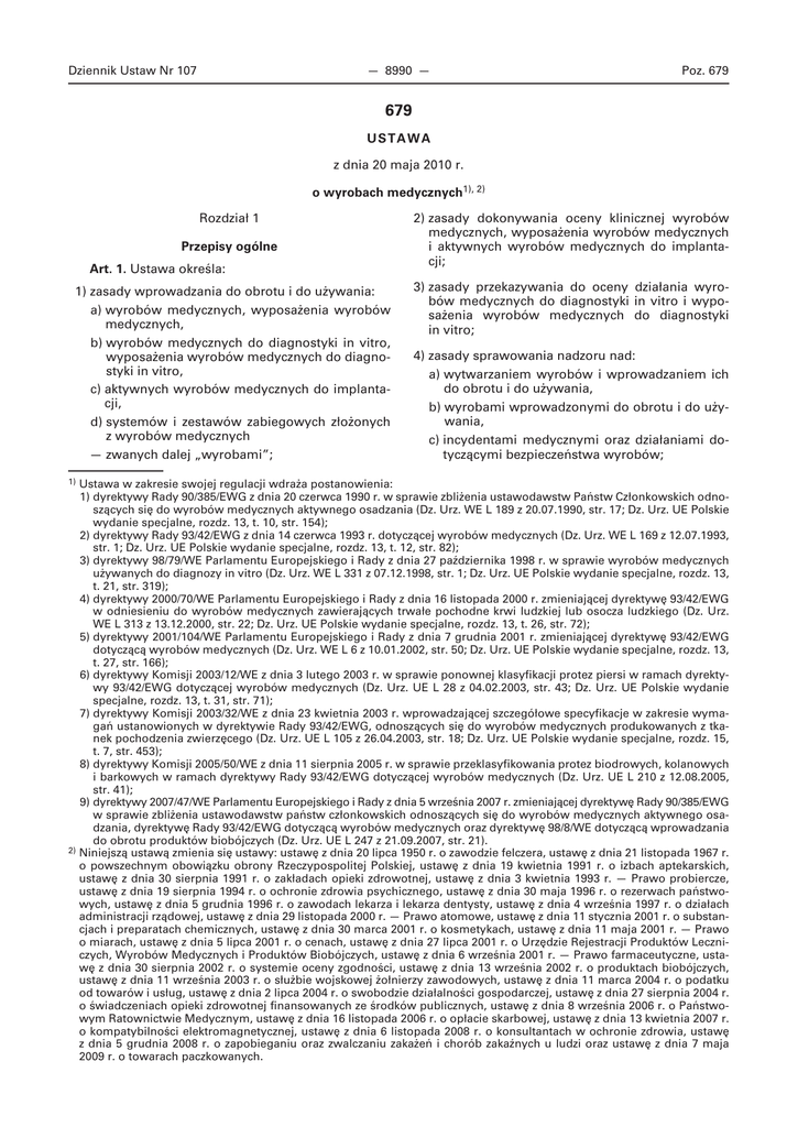 Dziennik Ustaw Nr 107 — 8990 — Poz. 679 679 USTA WA z dnia 20 maja 2010 r. o wyrobach medycznych1), 2) Rozdział 1 Przepisy ogólne Art. 1. Ustawa określa: 1) zasady wprowadzania do obrotu i do używania: a) wyrobów medycznych, wyposażenia wyrobów medycznych, b) wyrobów medycznych do diagnostyki in vitro, wyposażenia wyrobów medycznych do diagnostyki in vitro, c) aktywnych wyrobów medycznych do implantacji, d) systemów i zestawów zabiegowych złożonych z wyrobów medycznych — zwanych dalej „wyrobami”; 1) 2) zasady dokonywania oceny klinicznej wyrobów medycznych, wyposażenia wyrobów medycznych i aktywnych wyrobów medycznych do implantacji; 3) zasady przekazywania do oceny działania wyrobów medycznych do diagnostyki in vitro i wyposażenia wyrobów medycznych do diagnostyki in vitro; 4) zasady sprawowania nadzoru nad: a) wytwarzaniem wyrobów i wprowadzaniem ich do obrotu i do używania, b) wyrobami wprowadzonymi do obrotu i do używania, c) incydentami medycznymi oraz działaniami dotyczącymi bezpieczeństwa wyrobów; Ustawa w zakresie swojej regulacji wdraża postanowienia: 1) dyrektywy Rady 90/385/EWG z dnia 20 czerwca 1990 r. w sprawie zbliżenia ustawodawstw Państw Członkowskich odnoszących się do wyrobów medycznych aktywnego osadzania (Dz. Urz. WE L 189 z 20.07.1990, str. 17; Dz. Urz. UE Polskie wydanie specjalne, rozdz. 13, t. 10, str. 154); 2) dyrektywy Rady 93/42/EWG z dnia 14 czerwca 1993 r. dotyczącej wyrobów medycznych (Dz. Urz. WE L 169 z 12.07.1993, str. 1; Dz. Urz. UE Polskie wydanie specjalne, rozdz. 13, t. 12, str. 82); 3) dyrektywy 98/79/WE Parlamentu Europejskiego i Rady z dnia 27 października 1998 r. w sprawie wyrobów medycznych używanych do diagnozy in vitro (Dz. Urz. WE L 331 z 07.12.1998, str. 1; Dz. Urz. UE Polskie wydanie specjalne, rozdz. 13, t. 21, str. 319); 4) dyrektywy 2000/70/WE Parlamentu Europejskiego i Rady z dnia 16 listopada 2000 r. zmieniającej dyrektywę 93/42/EWG w odniesieniu do wyrobów medycznych zawierających trwałe pochodne krwi ludzkiej lub osocza ludzkiego (Dz. Urz. WE L 313 z 13.12.2000, str. 22; Dz. Urz. UE Polskie wydanie specjalne, rozdz. 13, t. 26, str. 72); 5) dyrektywy 2001/104/WE Parlamentu Europejskiego i Rady z dnia 7 grudnia 2001 r. zmieniającej dyrektywę 93/42/EWG dotyczącą wyrobów medycznych (Dz. Urz. WE L 6 z 10.01.2002, str. 50; Dz. Urz. UE Polskie wydanie specjalne, rozdz. 13, t. 27, str. 166); 6) dyrektywy Komisji 2003/12/WE z dnia 3 lutego 2003 r. w sprawie ponownej klasyfikacji protez piersi w ramach dyrektywy 93/42/EWG dotyczącej wyrobów medycznych (Dz. Urz. UE L 28 z 04.02.2003, str. 43; Dz. Urz. UE Polskie wydanie specjalne, rozdz. 13, t. 31, str. 71); 7) dyrektywy Komisji 2003/32/WE z dnia 23 kwietnia 2003 r. wprowadzającej szczegółowe specyfikacje w zakresie wymagań ustanowionych w dyrektywie Rady 93/42/EWG, odnoszących się do wyrobów medycznych produkowanych z tkanek pochodzenia zwierzęcego (Dz. Urz. UE L 105 z 26.04.2003, str. 18; Dz. Urz. UE Polskie wydanie specjalne, rozdz. 15, t. 7, str. 453); 8) dyrektywy Komisji 2005/50/WE z dnia 11 sierpnia 2005 r. w sprawie przeklasyfikowania protez biodrowych, kolanowych i barkowych w ramach dyrektywy Rady 93/42/EWG dotyczącej wyrobów medycznych (Dz. Urz. UE L 210 z 12.08.2005, str. 41); 9) dyrektywy 2007/47/WE Parlamentu Europejskiego i Rady z dnia 5 września 2007 r. zmieniającej dyrektywę Rady 90/385/EWG w sprawie zbliżenia ustawodawstw państw członkowskich odnoszących się do wyrobów medycznych aktywnego osadzania, dyrektywę Rady 93/42/EWG dotyczącą wyrobów medycznych oraz dyrektywę 98/8/WE dotyczącą wprowadzania do obrotu produktów biobójczych (Dz. Urz. UE L 247 z 21.09.2007, str. 21). 2) Niniejszą ustawą zmienia się ustawy: ustawę z dnia 20 lipca 1950 r. o zawodzie felczera, ustawę z dnia 21 listopada 1967 r. o powszechnym obowiązku obrony Rzeczypospolitej Polskiej, ustawę z dnia 19 kwietnia 1991 r. o izbach aptekarskich, ustawę z dnia 30 sierpnia 1991 r. o zakładach opieki zdrowotnej, ustawę z dnia 3 kwietnia 1993 r. — Prawo probiercze, ustawę z dnia 19 sierpnia 1994 r. o ochronie zdrowia psychicznego, ustawę z dnia 30 maja 1996 r. o rezerwach państwowych, ustawę z dnia 5 grudnia 1996 r. o zawodach lekarza i lekarza dentysty, ustawę z dnia 4 września 1997 r. o działach administracji rządowej, ustawę z dnia 29 listopada 2000 r. — Prawo atomowe, ustawę z dnia 11 stycznia 2001 r. o substancjach i preparatach chemicznych, ustawę z dnia 30 marca 2001 r. o kosmetykach, ustawę z dnia 11 maja 2001 r. — Prawo o miarach, ustawę z dnia 5 lipca 2001 r. o cenach, ustawę z dnia 27 lipca 2001 r. o Urzędzie Rejestracji Produktów Leczniczych, Wyrobów Medycznych i Produktów Biobójczych, ustawę z dnia 6 września 2001 r. — Prawo farmaceutyczne, ustawę z dnia 30 sierpnia 2002 r. o systemie oceny zgodności, ustawę z dnia 13 września 2002 r. o produktach biobójczych, ustawę z dnia 11 września 2003 r. o służbie wojskowej żołnierzy zawodowych, ustawę z dnia 11 marca 2004 r. o podatku od towarów i usług, ustawę z dnia 2 lipca 2004 r. o swobodzie działalności gospodarczej, ustawę z dnia 27 sierpnia 2004 r. o świadczeniach opieki zdrowotnej finansowanych ze środków publicznych, ustawę z dnia 8 września 2006 r. o Państwowym Ratownictwie Medycznym, ustawę z dnia 16 listopada 2006 r. o opłacie skarbowej, ustawę z dnia 13 kwietnia 2007 r. o kompatybilności elektromagnetycznej, ustawę z dnia 6 listopada 2008 r. o konsultantach w ochronie zdrowia, ustawę z dnia 5 grudnia 2008 r. o zapobieganiu oraz zwalczaniu zakażeń i chorób zakaźnych u ludzi oraz ustawę z dnia 7 maja 2009 r. o towarach paczkowanych. Dziennik Ustaw Nr 107 — 8991 — 5) zasady dokonywania zgłoszeń i powiadomień dotyczących wyrobów oraz wytwórców, autoryzowanych przedstawicieli, importerów i dystrybutorów wyrobów; 6) zasady i sposób autoryzowania jednostek ubiegających się o aut