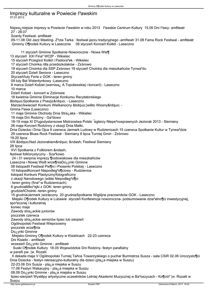 Gminny O¶rodek Kultury w Lasecznie Imprezy kulturalne w Powiecie I³awskim 07.01.2013. Najwa¿niejsze Imprezy w Powiecie I³awskim w roku 2013 I³awskie Centrum Kultury 15.06 Dni I³awy- amfiteatr 27 - 28.07 Szanty Festiwal- amfiteatr 09-11.08 Old Jazz Meeting- Z³ota Tarka : festiwal jazzu tradycyjnego -amfiteatr 31.08 Fama Rock Festiwal - amfiteatr Gminny O¶rodek Kultury w Lasecznie 06 styczeñ Koncert Kolêd - Laseczno 11 styczeñ Gminne Spotkanie Noworoczne - Nowa Wie¶ 13 styczeñ XXI Fina³ WO¦P - Wikielec 15 styczeñ Przegl±d Kolêd i Pastora³ek - Wikielec 17 styczeñ Choinka /dla przedszkolaków - Z±browo 19 styczeñ Choinka dla SSP Z±browo 19 styczeñ Choinka dla mieszkañców Tynwa³du 20 styczeñ Dzieñ Seniora - Laseczno Styczeñ/luty Ferie z GOK - teren gminy 09 luty Bal Walentynkowy -Laseczno 8 marca Dzieñ Kobiet (wernisa¿ A.Topolewskiej i koncert) - Laseczno 10 marca Dzieñ Kobiet - koncert w Z±browie 18 kwietnia Gminne Eliminacje Konkursu Recytatorskiego „Spotkania z Poezj±” - Laseczno Marzec/kwiecieñ Konkurs Wielkanocny „¦wiêto Wiosny” Gmina I³awa (Laseczno) 11 maja Gminne Obchody Dnia Stra¿aka - Wikielec 19 maja Dni Rodziny - Ga³dowo 18-19 maja XI D³ugodystansowe Mistrzostwa Polski ¯eglarzy Niepe³nosprawnych Jeziorak 2013 - Siemiany 26 maja Koncert Rodzinny z okazji Dnia Matki, Dnia Dziecka i Dnia Ojca 9 czerwca Jarmark Ludowy w Rudzienicach 15 czerwca Spotkanie Kultur w Tynwa³dzie 29 czerwca Blues Rock Festiwal - Siemiany 6 lipca Turniej Gmin - Z±browo 19-20 lipca VIII „Nad Jeziorakiem” – Festiwal Siemiany 28 lipca XVI Spotkania z Folklorem – festiwal folklorystyczny - Sza³kowo 24 i 31 sierpnia imprezy ¶rodowiskowe dla mieszkañców Laseczna i Nowej Wsi8 wrze¶niaDo¿ynki Gminne 08 listopadII Festiwal Pie¶ni i Piosenki Polskiej - Laseczno 10 listopadKoncert Niepodleg³o¶ciowy - Rudzienice listopad Konkurs Plastyczny/fotograficzny z okazji Narodowego ¦wiêta Niepodleg³o¶ci - teren gminy (fina³ w Rudzienicach) 6 grudniaMiko³ajki z GOK- teren gminy grudzieñChoinki -teren gminy 15 grudniaJarmark ¦wi±teczny 20 grudniaSpotkanie Wigilijne pracowników GOK - Laseczno Miejski O¶rodek Kultury w Lubawie styczeñ Konferencja noworoczna- podsumowanie dzia³alno¶ci inwestycyjnej, spo³ecznej i kulturalnej koniec maja Zawody stra¿ackie juniorów pocz±tek czerwca Zawody stra¿ackie seniorów lipiec lub sierpieñ Ogólnopolski Festiwal Wieprzowiny pocz±tek wrze¶nia Do¿ynki Gminne Miejsko-Gminny O¶rodek Kultury w Kisielicach 22-23 czerwca Dni Kisielic - amfiteatr wrzesieñ Do¿ynki Gminne - amfiteatr Suski O¶rodek Kultury 18.05 Wojewódzkie Dni Rodziny- festyn parafialny w parafii pw. ¦w. Rozalii II dekada maja V Ogólnopolski Turniej Tañca Towarzyskiego o puchar Burmistrza Susza - sala CSiR 02.06 Uroczysto¶ci Dnia Dziecka - festyn rekreacyjno-kulturalny dla dzieci (pla¿a miejska w Suszu) 22-23.06 Dni Susza - pla¿a miejska w Suszu 17.08 Festyn Wakacyjny - pla¿a miejska w Suszu 08.09 Do¿ynki Gminne - pla¿a miejska w Suszu lipiec-sierpieñ Wystêpy artystyczne uczestników Letniej Akademii Muzycznej w Ba³oszycach - Ko¶ció³ ¦w. Rozalii w Suszu http://www.goklaseczno.pl Kreator PDF Utworzono 8 March, 2017, 18:32 Gminny O¶rodek Kultury w Lasecznie http://www.goklaseczno.pl Kreator PDF Utworzono 8 March, 2017, 18:32