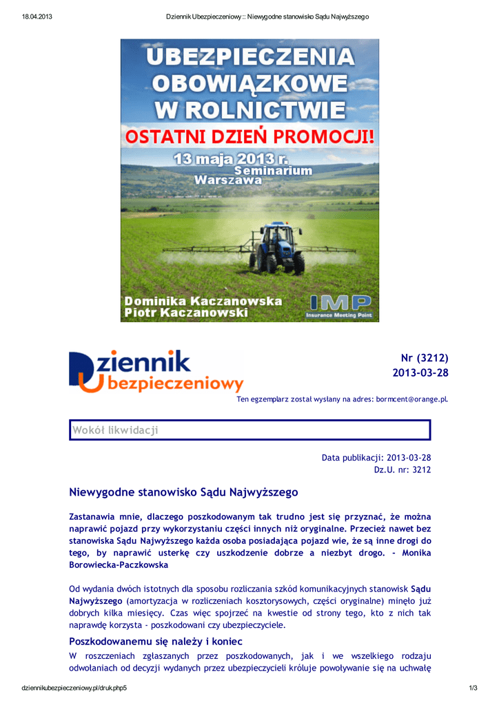 18.04.2013 Dziennik Ubezpieczeniowy :: Niewygodne stanowisko Sądu Najwyższego Nr (3212) 2013-03-28 Ten egzemplarz został wysłany na adres: [email protected]. Wokół likwidacji Data publikacji: 2013-03-28 Dz.U. nr: 3212 Niewygodne stanowisko Sądu Najwyższego Zastanawia mnie, dlaczego poszkodowanym tak trudno jest się przyznać, że można naprawić pojazd przy wykorzystaniu części innych niż oryginalne. Przecież nawet bez stanowiska Sądu Najwyższego każda osoba posiadająca pojazd wie, że są inne drogi do tego, by naprawić usterkę czy uszkodzenie dobrze a niezbyt drogo. - Monika Borowiecka-Paczkowska Od wydania dwóch istotnych dla sposobu rozliczania szkód komunikacyjnych stanowisk Sądu Najwyższego (amortyzacja w rozliczeniach kosztorysowych, części oryginalne) minęło już dobrych kilka miesięcy. Czas więc spojrzeć na kwestie od strony tego, kto z nich tak naprawdę korzysta - poszkodowani czy ubezpieczyciele. Poszkodowanemu się należy i koniec W roszczeniach zgłaszanych przez poszkodowanych, jak i we wszelkiego rodzaju odwołaniach od decyzji wydanych przez ubezpieczycieli króluje powoływanie się na uchwałę dziennikubezpieczeniowy.pl/druk.php5 1/3 18.04.2013 Dziennik Ubezpieczeniowy :: Niewygodne stanowisko Sądu Najwyższego Sądu Najwyższego z dnia 12 kwietnia 2012 roku (III CZP 80/11). Chodzi oczywiście o bezpodstawne stosowanie w wyliczeniach kosztorysowych tzw. urealnienia wartości części (nazywanego również amortyzacją wartości części). Ma to być główny argument do tego, by ceny te były ustalane w odniesieniu tylko do cen części oryginalnych. Modnym również jest powoływanie się na różnorodne Naprawa przy użyciu części wyroki wskazujące na to, że poszkodowany nie musi naprawiać pojazdu, nie musi niczego udowadniać i w równoważnych oryginałom lub o porównywalnej ogóle to mu się należy i koniec. Dodatkowo bardzo jakości może spełniać szeroko przytaczane są argumenty dotyczące tego, jak bardzo krzywdzące dla poszkodowanego jest wymogi pełnej restytucji. poszukiwanie części używanych czy też z nielegalnego obrotu, które wykorzystane do naprawy nie gwarantują tego, że pojazd będzie sprawny i bezpieczny. W argumentacji pełnomocników i poszkodowanych nie spotkałam się ani razu z przytoczeniem stanowiska, jakie przedstawił Sąd Najwyższy w uzasadnieniu do Postanowienia z dnia 20 czerwca 2012 roku (III CZP 85/11). Trudno się dziwić, bo stanowisko to trochę psuje szyki wywodom dotyczącym szkodliwości stosowania części innych niż oryginalne. Rozsądne podejście SN Dla przypomnienia - w uzasadnieniu do postanowienia Sąd Najwyższy rozsądnie wskazał, że problematyka dotycząca tego, jakie części mogą być wykorzystane do naprawy pojazdu jest dużo bardziej rozbudowana niż poszkodowani by chcieli. Nie jest tak, że poszkodowany ma wybór pomiędzy częściami używanymi, kradzionymi i z niewiadomego źródła a częściami oryginalnymi. Że są również części równoważne oryginałom i części o porównywalnej jakości. I co najważniejsze - o tym, jakie części powinny mieć w danym przypadku zastosowanie zależne jest od charakterystyki i historii pojazdu, który został uszkodzony. W tym uzasadnieniu też podoba mi się to, że Sąd Najwyższy wskazuje, że również naprawa przy użyciu części równoważnych oryginałom lub o porównywalnej jakości może spełniać wymogi pełnej restytucji tj. przywrócenia do stanu poprzedniego. I jeszcze jeden smaczek, nie bardzo pasujący poszkodowanym. Sąd Najwyższy wskazał, że jeżeli poszkodowany ma jakiś szczególny interes w tym, by pomimo braku logiczności w pokrywaniu kosztów zakupu części oryginalnych takie koszty ponieść, to musi to udowodnić, przedstawiając rachunek za naprawę z wykorzystaniem takich części. Ubezpieczyciele nie korzystają Można by się zatem spodziewać, że stanowisko to będzie szeroko wykorzystywane przez ubezpieczycieli. I tutaj spotyka nas rozczarowanie - nie wiem dlaczego, ale tak nie jest. Mam wrażenie, że albo likwidatorzy nie znają tego stanowiska, albo nie wiedzą, że mogą je stosować. A szkoda - bo stanowisko to daje bardzo szerokie pole do tego by określić, w których przypadkach można się ugiąć, a w których bronić stanowiska, że rozliczenie wg wyceny z zastosowaniem cen części oryginalnych nie jest uzasadnione. Dla przykładu - wyobraźmy sobie, że ubezpieczyciel Rozliczenie wg wyceny z otrzymuje odwołanie od decyzji, w której poszkodowany pisze, że samochód był w bardzo zastosowaniem cen części oryginalnych nie zawsze dobrym stanie, że posiadał wyłącznie części jest uzasadnione. oryginalne, że nigdy nie był naprawiany, że tylko można go naprawić przy wykorzystaniu części oryginalnych i że otrzymana kwota odszkodowania nie starcza na taką naprawę. Co może zrobić likwidator? Może dać uprzejmą sztampową odmowę zgodnie ze stanowiskiem i polityką danego ubezpieczyciela, a może te pochylić się nad sprawą i "postrzelać" w odpowiedzi w poszkodowanego argumentami, że pojazd: 1. Nie jest pojazdem nowym (a nawet czasem bardzo leciwym), 2. Został sprowadzony do Polski w niewiadomym stanie technicznym, dziennikubezpieczeniowy.pl/druk.php5 2/3 18.04.2013 Dziennik Ubezpieczeniowy :: Niewygodne stanowisko Sądu Najwyższego 3. Poszkodowany jest jego kolejnym właścicielem, 4. Posiada ślady przeprowadzonych napraw, 5. Jest zaniedbany itp. wskazującymi na to, że najbardziej racjonalnym i ekonomicznie uzasadnionym sposobem naprawienia takiego pojazdu jest dokonanie naprawy przy wykorzystaniu części innych niż oryginalne (o ile są dostępne na rynku). Z takimi argumentami trudno już poszkodowanemu będzie dyskutować. A jak się uprze - to można mu przypomnieć, że "zgodnie ze stanowiskiem Sądu Najwyższego powinien udowodnić, że poniesiony koszt naprawy był wyższy". Ubezpieczyciel zapłaci W tym miejscu zastanawia mnie, dlac