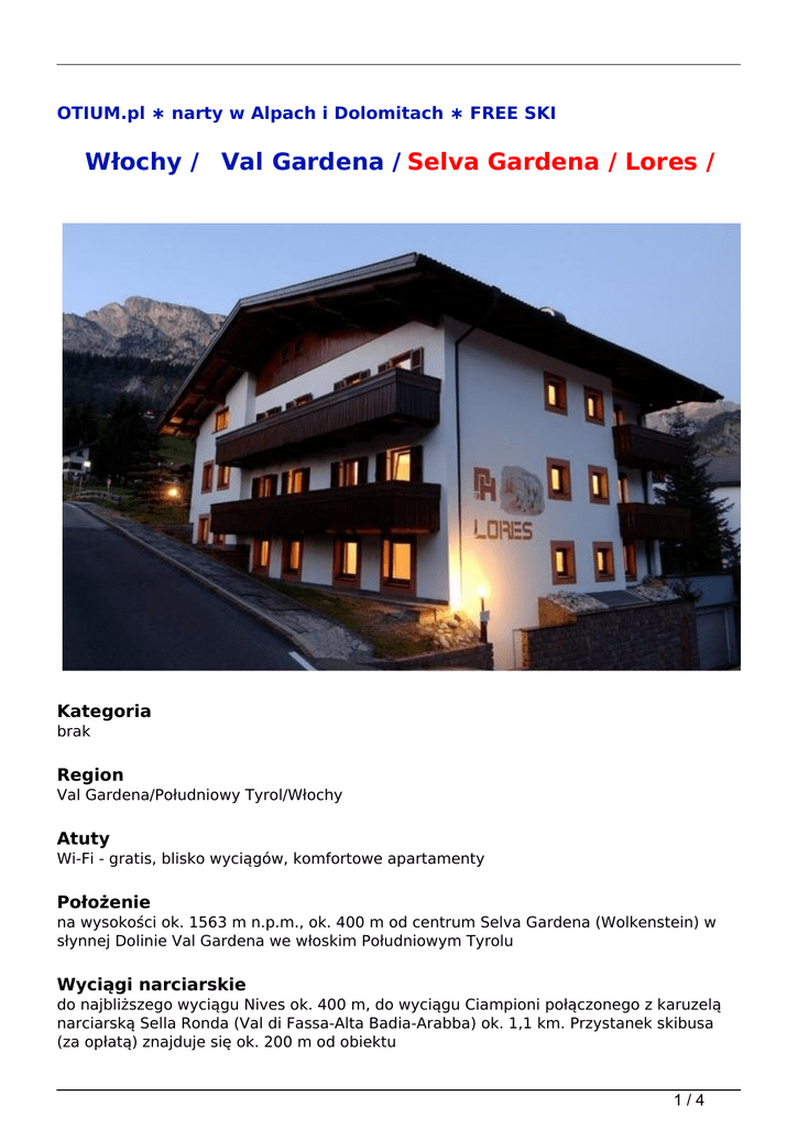 OTIUM.pl ∗ narty w Alpach i Dolomitach ∗ FREE SKI Włochy / Val Gardena / Selva Gardena / Lores / Kategoria brak Region Val Gardena/Południowy Tyrol/Włochy Atuty Wi-Fi - gratis, blisko wyciągów, komfortowe apartamenty Położenie na wysokości ok. 1563 m n.p.m., ok. 400 m od centrum Selva Gardena (Wolkenstein) w słynnej Dolinie Val Gardena we włoskim Południowym Tyrolu Wyciągi narciarskie do najbliższego wyciągu Nives ok. 400 m, do wyciągu Ciampioni połączonego z karuzelą narciarską Sella Ronda (Val di Fassa-Alta Badia-Arabba) ok. 1,1 km. Przystanek skibusa (za opłatą) znajduje się ok. 200 m od obiektu 1/4 Wyposażenie przechowalnia sprzętu narciarskiego, garaż (1 miejsce/apt. w cenie). Obiekt posiada 2 piętra Internet tak (Wi-Fi - gratis) Karty kredytowe tak (Visa, Matercard) Sport i relaks Centrum Wellness w Hotelu Antares (oddalonym o ok. 800 m) - basen i sala fitness (gratis); sauna i łaźnia turecka (wstęp od 14 roku życia, za opłatą 15 euro/os./wejście); hydromasaż (za opłatą - 10 euro/os./sesja); solarium (za opłatą); pokój gier i zabaw dla dzieci Apartament MONO dla 2-3 osób (ok. 29 m<sup>2</sup>), składa się z pokoju dziennego z podwójnym i pojedynczym rozkładanym łóżkiem wraz z aneksem kuchennym w pełni wyposażonym (naczynia, sztućce, kuchenka, lodówka). Łazienka z WC; TV, telefon Apartament BILO dla 2-4 osób (ok. 34 m<sup>2</sup>), składa się z sypialni z łóżkiem małżeńskim oraz pokoju dziennego z podwójnym rozkładanym łóżkiem wraz z aneksem kuchennym w pełni wyposażonym (naczynia, sztućce, kuchenka, lodówka). Łazienka z WC; TV, telefon Apartament TRILO dla 4-6 osób (ok. 69 m<sup>2</sup>), składa się z dwóch sypialni (w każdej łóżko małżeńskie lub piętrowe) oraz pokoju dziennego z podwójną rozkładaną sofą wraz z aneksem kuchennym w pełni wyposażonym (naczynia, sztućce, kuchenka, lodówka). Dwie łazienki z WC; TV, telefon Pieski nie Kategoria lokalna brak Świadczenia 7 noclegów (Uwaga! W terminach 17-23.12.2016, 02-08.01.2017, 08-14.01.2017 - 6 noclegów), ubezpieczenie Signal Iduna - Bezpieczne Podróże (w tym rekreacyjne uprawianie narciarstwa zjazdowego, biegowego lub snowboardu na oznakowanych trasach zjazdowych) - KL, KR, NNW i bagażu, opieka włoskiego kontrahenta Uwaga 2/4 Zalecamy dodatkowe ubezpieczenie OC/SS (w tym sprzęt sportowy) Signal Iduna - 35 zł/os./pobyt Dopłaty możliwość wypożyczenia łóżeczka dla dziecka - za opłatą 56 euro/tydz. - płatne przy rezerwacji w PLN w przeliczeniu wg kursu sprzedaży EUR banku BNP Paribas z dnia rezerwacji. Dopłata za ubezpieczenie od kosztów rezygnacji 2,4% W cenie prąd, woda, ogrzewanie, bielizna pościelowa i ręczniki Obowiązkowo płatne przy rezerwacji sprzątanie końcowe 55 euro/apt. (aneks kuchenny należy posprzątać we własnym zakresie, śmieci należy wyrzucić), taksa klimatyczna ok. 1,10 euro/ os./dzień (płatna powyżej 14 roku życia) - płatne w PLN w przeliczeniu wg kursu sprzedaży EUR banku BNP Paribas z dnia rezerwacji Zakwaterowanie przyjazd - od godz. 17.00 (w przypadku opóźnienia, konieczny telefon do recepcji, który jest podany na voucherze, nie gwarantujemy zakwaterowania w nocy), wyjazd - do godz. 10.00. Uwaga! Zakwaterowania oraz wykwaterowanie w Hotelu Antares, wg informacji podanych na voucherze Autokar nie Oferta Free Ski nie Promocje Niezmienność ceny - dla rezerwacji potwierdzonych do 30.11.2016. Oferta 7=6 w terminach 10-17.12.2016 oraz 18.03-01.04.2017. Ceny w systemie uwzględniają promocje data skąd pobyt opis cena / os 11.03.2017 nie dotyczy 7 dni Pokój: Apartament TRILO 6 Wyżywienie: bez wyżywienia 1266 zł / os 18.03.2017 nie dotyczy 7 dni Pokój: Apartament TRILO 6 Wyżywienie: bez wyżywienia 1110 zł / os 3/4 25.03.2017 nie dotyczy 7 dni Pokój: Apartament TRILO 6 Wyżywienie: bez wyżywienia 1110 zł / os OTIUM POLSKA SP. Z O.O. 30-150 KRAKÓW UL. ARMII KRAJOWEJ 12 lok. 11 tel./fax +48-12.4469214, 12.4469215, 12.4469216, 12.4469217 Zapraszamy poniedziałek-piątek w godzinach 10.00-18.00 (soboty 10.00-14.00 od połowy listopada do połowy kwietnia) E-mail: [email protected] Strona Internetowa: www.otium.pl 4/4 Powered by TCPDF (www.tcpdf.org)