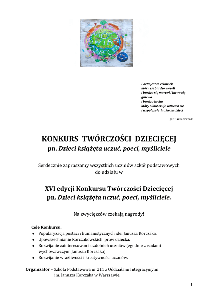 Poeta jest to człowiek który się bardzo weseli i bardzo się martwi i łatwo się gniewa i bardzo kocha który silnie czuje wzrusza się i współczuje i takie są dzieci Janusz Korczak KONKURS TWÓRCZOŚCI DZIECIĘCEJ pn. Dzieci książęta uczuć, poeci, myśliciele Serdecznie zapraszamy wszystkich uczniów szkół podstawowych do udziału w XVI edycji Konkursu Twórczości Dziecięcej pn. Dzieci książęta uczuć, poeci, myśliciele. Na zwycięzców czekają nagrody! Cele Konkursu: Popularyzacja postaci i humanistycznych idei Janusza Korczaka. Upowszechnianie Korczakowskich praw dziecka. Rozwijanie zainteresowań i uzdolnień uczniów (zgodnie zasadami wychowawczymi Janusza Korczaka). Rozwijanie wrażliwości i kreatywności uczniów. Organizator – Szkoła Podstawowa nr 211 z Oddziałami Integracyjnymi im. Janusza Korczaka w Warszawie. 1 Regulamin Konkursu §1 Adresat Konkurs adresowany jest do uczniów śródmiejskich szkół podstawowych m.st. Warszawy, §2 Kategorie wiekowe KLASY 0– III konkurs plastyczny 1. Zadaniem uczestników jest wykonanie pracy plastycznej Korczakowskimi prawami dziecka na temat: Podróż do Krainy Praw Dziecka 2. Technika dowolna. 3. Format minimum A2 (!). UWAGA! Prace plastyczne mogą być wykonane indywidualnie lub zespołowo. Kryteria oceny prac plastycznych: interpretacja tematu konkursu; oryginalność ujęcia tematu; walory artystyczne ( kompozycja, gama kolorystyczna, technika wykonania); estetyka wykonania. 2 konkurs języka angielskiego Zadaniem uczestników jest wykonanie swojej wizytówki na temat : Wielka Brytania oczami dziecka w formie plakatu (A3), w której znajdą się następujące treści: ciekawe miejsca warte odwiedzenia, zabytki Wielkiej Brytanii - podpisane sławni ludzie pochodzący z Wielkiej Brytanii Kryteria oceny prac: poprawność językowa oryginalność ujęcia tematu walory artystyczne, estetyka KLASY IV – VI konkurs plastyczny 1. Zadaniem uczestników jest wykonanie plakatu na temat: Dzieci świata, czyli przyjaźń bez granic 2. Technika dowolna. 3. Format minimum A2 (!). UWAGA! Prace plastyczne mogą być wykonane indywidualnie lub zespołowo. Kryteria oceny prac plastycznych: interpretacja tematu konkursu; koncepcja plastyczna pracy; poszukiwanie własnych sposobów przekazu – oryginalność formy i treści; walory artystyczne ( kompozycja, gama kolorystyczna, technika wykonania). 3 konkurs literacki 1. Zadaniem uczestników jest napisanie opowiadania na temat: Dziecięce marzenia…małe i duże 2. Objętość pracy- maksymalnie 2 strony A4 wydruku komputerowego (czcionka -12 pt, marginesy 2 cm, pojedyncza interlinia). UWAGA! Praca indywidualna. Kryteria oceny prac literackich: zgodność z tematem; sposób interpretacji tematu; oryginalność ujęcia tematu; poprawność językowa (stylistyczna i ortograficzna). konkurs języka angielskiego Zadaniem uczestników jest wykonanie pracy na temat : Wielka Brytania oczami dziecka w formie plakatu (A3), w której znajdą się następujące treści: opis ciekawych miejsc wartych zobaczenia, zabytków Wielkiej Brytanii informacje o historii przedstawionych miejsc przedstawienie sławnych ludzi pochodzących z Wielkiej Brytanii Kryteria oceny prac poprawność językowa; oryginalność ujęcia tematu; walory artystyczne, estetyka. Konkurs multimedialny 1. Zadaniem uczestników jest stworzenie prezentacji w programie PowerPoint inspirowanej Korczakowskimi prawami dziecka nt. Świat przyjazny nam…dzieciom. 2. Praca powinna zapisana być w formacie w pełni zgodnym z programem 4 PowerPoint 97-2003; 3. Na pierwszym slajdzie należy umieścić imię i nazwisko autora/autorów pracy oraz tytuł, na ostatnim napis KONIEC, na przedostatnim powinny być wymienione źródła, z których korzystano; UWAGA! Prace mogą być wykonane indywidualnie lub zespołowo. Kryteria oceny prac multimedialnych: interpretacja tematu; oryginalność ujęcia tematu; walory artystyczne; wykorzystanie różnych efektów wizualnych i dźwiękowych. §3 Opis prac konkursowych Do każdej pracy konkursowej powinna być dołączona informacja zawierająca: imię i nazwisko autora/ autorów pracy, wiek autora/autorów klasę, tytuł pracy, nazwę szkoły, imię i nazwisko opiekuna, pod kierunkiem którego praca została przygotowana. §4 Zgłaszanie prac Prace konkursowe należy dostarczyć do sekretariatu Szkoły Podstawowej nr 211 z Oddziałami Integracyjnymi, ul. Nowy Świat 21a, 00 – 029 Warszawa, w godz. 8.00 – 16.00 (lub przesłać drogą pocztową) do dnia 20 maja 2016r. §5 Wyniki Konkursu Komisja konkursowa (składająca się z nauczycieli polonistów, plastyków i informatyków) oceni prace do 26 maja 2016r. Wyniki zostaną ogłoszone na stronach internetowych Śródmiejskiej Edukacji – www.śródmieście.edu.pl oraz szkoły www.sp211.edupage.org 5 §6 Nagrody Uroczyste wręczenie nagród zwycięzcom Konkursu odbędzie się 1 czerwca 2016r. w Szkole Podstawowej nr 211 z Oddziałami Integracyjnymi im. Janusza Korczaka podczas obchodów Święta Szkoły. koordynator Konkursu - Ewa Pawlic-Rafałowska, e-mail: [email protected] NASZ ADRES: Szkoła Podstawowa nr 211 z Oddziałami Integracyjnymi im. Janusza Korczaka ul. Nowy Świat 21a 00-029 Warszawa tel. /fax. 022 826 47 85 www.sp211.edupage.org 6