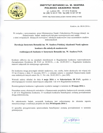 I N S T Y T U T B O T A N I K I im. W. SZAFERA POLSKIEJ AKADEMII NAUK ul. Lubicz 46, 31-512 Krakow tel. [48] 12 42 41 700; fax [48] 12 421 97 90 WWW: http://www.botany.pl [tam rowniez adresy e-mail] Krakow, dn. 08.04.2016 r. W zwi^zku z przyznaniem przez Ministerstwo Nauki i Szkolnictwa Wyzszego dotacji na finansowanie badari naukowych lub prac rozwojowych oraz zadan z nimi zwi^zanych sluz^cych rozwojowi miodych naukowcow oraz uczestnikow studiow doktoranckich Dyrekcja Instytutu Botaniki im. W. Szafera Polskiej Akademii Nauk ogtasza konkurs dla mtodych naukowcow realizuj^cych badania w Instytucie Botaniki im. W. Szafera P A N . Konkurs odbywa si^ na zasadach okreslonych w Regulaminie konkursu wprowadzonym Zarz^dzeniem Dyrektora IB PAN nr 20/201 Sr., z dn. 24.09.2015 r. Regulamin konkursu stanowi zal^cznik do niniejszego ogloszenia. Do konkursu mog^ przystapic mlodzi naukowcy, tzn. osoby, ktore ukonczyly nie wiecej niz 35 lat (Ustawa z dnia 15 stycznia 2015 r. o zmianie ustawy o zasadach finansowania nauki oraz niektorych innych ustaw Dz. U . Nr z dn. 24.02.2015 r., poz.249). Wnioski nalezy skladac do dnia 4 maja 2016 r. w Sekretariacie IB PAN, zgodnie z obowi^zuj^cym wzorem stanowi^cym zal^cznik 1 do w/w Regulaminu konkursu. Rozstrzygni^cie konkursu i ogloszenie wynikow nast^pi w terminie do 30 maja 2016 r. Procedura oceny zlozonych wnioskow o finansowanie projektow badawczych zawarta zostala w §4 w/w Regulaminu konkursu. O wynikach konkursu beneficjenci zostan^ powiadomieni drog4 elektroniczn^. Po zakohczeniu badah, uczestnik konkursu jest zobowi^zany merytorycznego z realizacji projektu do dnia 30 listopada 2016 r. do zlozenia raportu O sposobie przygotowania sprawozdania beneficjenci zostan^ powiadomieni w terminie pozniejszym.