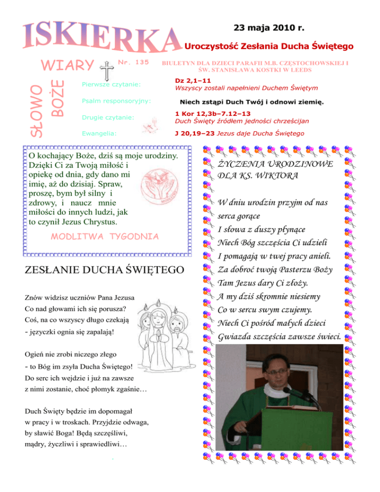 23 maja 2010 r. Uroczystość Zesłania Ducha Świętego SŁOWO BOŻE WIARY Nr. 135 Pierwsze czytanie: BIULETYN DLA DZIECI PARAFII M.B. CZĘSTOCHOWSKIEJ I ŚW. STANISŁAWA KOSTKI W LEEDS Dz 2,1–11 Wszyscy zostali napełnieni Duchem Świętym Psalm responsoryjny: Niech zstąpi Duch Twój i odnowi ziemię. Drugie czytanie: 1 Kor 12,3b–7.12–13 Duch Święty źródłem jedności chrześcijan Ewangelia: J 20,19–23 Jezus daje Ducha Świętego O kochający Boże, dziś są moje urodziny. Dzięki Ci za Twoją miłość i opiekę od dnia, gdy dano mi imię, aż do dzisiaj. Spraw, proszę, bym był silny i zdrowy, i naucz mnie miłości do innych ludzi, jak to czynił Jezus Chrystus. MODLITWA TYGODNIA ZESŁANIE DUCHA ŚWIĘTEGO Znów widzisz uczniów Pana Jezusa Co nad głowami ich się porusza? Coś, na co wszyscy długo czekają - języczki ognia się zapalają! Ogień nie zrobi niczego złego - to Bóg im zsyła Ducha Świętego! Do serc ich wejdzie i już na zawsze z nimi zostanie, choć płomyk zgaśnie… Duch Święty będzie im dopomagał w pracy i w troskach. Przyjdzie odwaga, by sławić Boga! Będą szczęśliwi, mądry, życzliwi i sprawiedliwi… . ŻYCZENIA URODZINOWE DLA KS. WIKTORA W dniu urodzin przyjm od nas serca gorące I słowa z duszy płynące Niech Bóg szczęścia Ci udzieli I pomagają w twej pracy anieli. Za dobroć twoją Pasterzu Boży Tam Jezus dary Ci złoży. A my dziś skromnie niesiemy Co w sercu swym czujemy. Niech Ci pośród małych dzieci Gwiazda szczęścia zawsze świeci. Wieża, którą zaczęli budować mieszkańcy Babilonu. Miasto leżące nad rzeką Eufrat, stolica Babilonii. BABEL Ozdobny daszek niesiony nad BABILON Najświętszym Sakramentem BALDACHIM np. podczas procesji Bożego Ciała. BARANEK BÓŻY BEATYFIKACJA Sakrament przyjmowany przez osobę, która ma przynajmniej piętnaście lat. W jego trakcie bierzmowany świadomie potwierdza to, co dokonało się na jego chrzcie, a także przyjmuje znamię daru Ducha Świętego. BETLEJEM BIBLIA Inaczej Pismo Święte; to dzieło złożone z 73 ksiąg. Autorem jest Pan Bóg, spisali ją natomiast ludzie, którzy zostali przez Niego natchnieni. BIERZMOWANIE BIRET BISKUP Duchowny, który ma najwyższy stopień święceń. To także tytuł najstarszej zachowanej polskiej pieśni religijnej. Zaliczenie osoby nieżyjącej do grona błogosławionych na podstawie jej heroicznego życia. BAZYLIKA Nazwa miasteczka położonego niedaleko Jerozolimy. Urodził się tam Jezus Chrystus. Matka Boża; Maryja. Tak ewangeliści w Nowym Testamencie nazywają Jezusa Chrystusa. BAPTYSTERIUM Pierwotnie pełniła funkcję Sali posiedzeń sądu i zebrań na rynku w starożytnych Atenach. Z czasem chrześcijanie przejęli ją za wzór swoich kościołów. Każdy człowiek, bez względu na to, z jakiego kraju pochodzi, jaki ma kolor skóry, jak wygląda, jakie są jego interesowania i co lubi. Chrzcielnica BLIŹNI BŁOGOSŁAWIONY BOGURODZICA BOŻE CIAŁO W języku greckim wyraz ten oznacza „szczęśliwy”. Błogosławiony to osoba zmarła, która została beatyfikowana BOŻE NARODZENIE BÓG Uroczystość obchodzona 25 grudnia, upamiętniająca narodziny Jezusa. BREWIARZ Kiedyś wyraz ten oznaczał „pieczęć”, dzisiaj -„uroczyste, bardzo ważne pismo papieskie”. BULLA Okrągłe lub czworokątne nakrycie głowy duchownych, część ich oficjalnego stroju. Purpurowe birety noszą kardynałowie, fioletowe biskupi, zaś czarne - reszta duchowieństwa. Uroczystość obchodzona ku czci Najświętszego Sakramentu w czwartek po niedzieli Trójcy Świętej na pamiątkę obdarowania nas przez Jezusa Eucharystią. Byt najwyższy; Stworzyciel nieba i ziemi. Bóg stworzył świat: góry, morza, kwiaty, zwierzęta i ludzi, bo jest dobry i pełen miłości. Kocha każdego człowieka i wszystko, co stworzył. Jest Ojcem wszystkich ludzi i Panem wszechświata — wszechmocnym, wiecznym, niepojętym, nieskończenie doskonałym. Opiekuje się nami i przebacza nam nasze grzechy. Książka, na której kartkach można znaleźć codzienne modlitwy kapłanów, zakonnic i zakonników. Wiele lat temu tylko oni odmawiali te modlitwy. Dzisiaj z brewiarza korzystają też osoby świeckie.