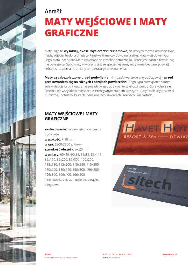 MATY WEJŚCIOWE I MATY GRAFICZNE Maty Logo to wysokiej jakości wycieraczki reklamowe, na których można umieścić logo, napis, zdjęcie, hasło promujące Państwa firmę czy dowolną grafikę. Maty wejściowe typu Logo-Mata i Standard-Mata wykonane są z włókna sztucznego, które jest bardzo trwałe i się nie odkształca. Spód maty wykonany jest ze specjalnej gumy nitrylowej (bezpamięciowej), która jest odporna na zmiany temperatury i odkształcenia. Maty są zabezpieczone przed podwijaniem i – dzięki warstwie antypoślizgowej – przed przesuwaniem się na różnych rodzajach powierzchni. Tego typu rozwiązania skutecznie wyłapują brud i kurz, znacznie ułatwiając utrzymanie czystości wnętrz. Sprawdzają się świetnie we wszystkich miejscach z intensywnym ruchem pieszym: budynkach użyteczności publicznej, hotelach, biurach, pensjonatach, dworcach, sklepach i marketach. MATY WEJŚCIOWE I MATY GRAFICZNE zastosowanie: na zewnątrz i do wnętrz budynków wysokość: 7-10 mm waga: 2300-2800 gr/mkw szerokość obrzeża: ok 20 mm wymiary: 60x40, 60x85, 85x85, 85x115, 85x150, 85x200, 85x300, 100x200, 115x180, 115x200, 115x240, 115x300, 150x200, 150x240, 150x300, 196x200, 196x300, 196x400, 196x600 inne rozmiary na zamowienie, okrągłe, nietypowe ANMAT T: 12 / 30 70 114 M: 513 175 435 ul. Norymberska 10c, 30-376 Kraków NIP: 676-205-19-15 www.anmat.pl