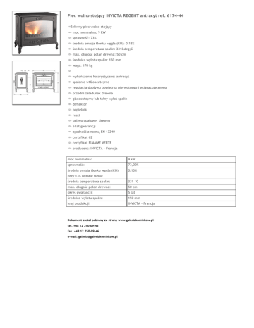 Piec wolno stojący INVICTA REGENT antracyt ref. 6174-44 Żeliwny piec wolno stojący - moc nominalna: 9 kW - sprawność: 73% - średnia emisja tlenku węgla (CO): 0,13% - średnia temperatura spalin: 331°C - max. długość polan drewna: 50 cm - średnica wylotu spalin: 150 mm - waga: 170 kg - wykończenie kolorystyczne: antracyt - spalanie wtórne - regulacja dopływu powietrza pierwotnego i wtórnego - przedni załadunek drewna - górny lub tylny wylot spalin - deflektor - popielnik - ruszt - paliwo opałowe: drewno - 5 lat gwarancji - zgodność z normą EN 13240 - certyfikat CE - certyfikat FLAMME VERTE - producent: INVICTA - Francja moc nominalna: 9 kW sprawność: 73,00% średnia emisja tlenku węgla (CO) 0,13% przy 13% udziale tlenu: średnia temperatura spalin: 331 °C max. długość polan drewna: 50 cm okres gwarancji: 5 lat średnica wylotu spalin: 150 mm kraj produkcji: INVICTA - Francja Dokument został pobrany ze strony www.galeriakominkow.pl tel. +48 12 250-09-45 fax. +48 12 250-09-46 e-mail: [email protected]