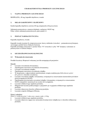 CHARAKTERYSTYKA PRODUKTU LECZNICZEGO 1. NAZWA PRODUKTU LECZNICZEGO BIOPRAZOL, 40 mg, kapsułki dojelitowe, twarde 2. SKŁAD JAKOŚCIOWY I ILOŚCIOWY Każda kapsułka dojelitowa zawiera 40 mg omeprazolu (Omeprazolum). Substancja pomocnicza o znanym działaniu: sacharoza 160,05 mg. Pełny wykaz substancji pomocniczych, patrz punkt 6.1. 3. POSTAĆ FARMACEUTYCZNA Kapsułka dojelitowa, twarda Kapsułki twarde (rozmiar 0), nieprzezroczyste, barwy niebiesko (wieczko) – pomarańczowej (korpus), zawierające peletki barwy białej do beżowej. Kapsułki posiadają oznaczenie w postaci litery ”O” (wieczko) i cyfry ”40” (korpus), wykonane za pomocą tuszu w kolorze białym. 4. SZCZEGÓŁOWE DANE KLINICZNE 4.1 Wskazania do stosowania Produkt leczniczy Bioprazol wskazany jest dla następujących pacjentów: Dorośli Leczenie owrzodzenia dwunastnicy. Zapobieganie nawrotom owrzodzenia dwunastnicy. Leczenie owrzodzenia żołądka. Zapobieganie nawrotom owrzodzenia żoładka. W skojarzeniu z odpowiednimi antybiotykami, terapia eradykacyjna Helicobacter pylori (H. pylori) w chorobie wrzodowej. Leczenie owrzodzeń żołądka i dwunastnicy związanych ze stosowaniem niesteroidowych leków przeciwzapalnych (NLPZ). Zapobieganie powstawaniu owrzodzeń żołądka i dwunastnicy związanych ze stosowaniem NLPZ u pacjentów narażonych na ryzyko ich wystąpienia. Leczenie refluksowego zapalenia przełyku. Długotrwałe leczenie podtrzymujące u pacjentów po wygojeniu refluksowego zapalenia przełyku. Leczenie objawowej choroby refluksowej przełyku. Leczenie zespołu Zollingera-Ellisona. Dzieci i młodzież Dzieci w wieku powyżej 1 roku oraz o masie ciała ≥ 10 kg Leczenie refluksowego zapalenia przełyku. Leczenie objawowe zgagi oraz zarzucania kwaśnej treści żołądkowej w chorobie refluksowej przełyku. 1 Dzieci i młodzież w wieku powyżej 4 lat W skojarzeniu z antybiotykami w leczeniu owrzodzenia dwunastnicy wywołanego przez H. pylori. 4.2 Dawkowanie i sposób podawania Dawkowanie u dorosłych Leczenie owrzodzenia dwunastnicy Zalecaną dawką omeprazolu u pacjentów z czynną chorobą wrzodową dwunastnicy jest 20 mg raz na dobę. U większości pacjentów wygojenie następuje w ciągu 2 tygodni. U pacjentów, u których w tym czasie nie doszło do pełnego zagojenia, proces ten zachodzi zwykle podczas kolejnych 2 tygodni podawania omeprazolu. U pacjentów z chorobą wrzodową dwunastnicy oporną na leczenie, stosuje się omeprazol w dawce 40 mg raz na dobę, a wygojenie uzyskuje się zwykle w okresie 4 tygodni. Zapobieganie nawrotom owrzodzenia dwunastnicy W celu zapobiegania nawrotom owrzodzenia dwunastnicy u pacjentów H. pylori-ujemnych oraz gdy eradykacja H. pylori nie jest możliwa zaleca się stosowanie omeprazolu w dawce 20 mg raz na dobę. U niektórych pacjentów wystarczająca może być dawka dobowa 10 mg. W razie niepowodzenia terapii dawka może zostać zwiększona do 40 mg na dobę. Leczenie owrzodzenia żołądka Zalecaną dawką omeprazolu jest 20 mg raz na dobę. U większości pacjentów wygojenie następuje w ciągu 4 tygodni. U pacjentów, u których w tym czasie nie doszło do pełnego zagojenia, proces ten zachodzi zwykle podczas kolejnych 4 tygodni leczenia. U pacjentów z owrzodzeniem żołądka opornym na leczenie, zalecane jest stosowanie omeprazolu w dawce 40 mg raz na dobę, a wygojenie uzyskiwane jest zwykle w okresie 8 tygodni. Zapobieganie nawrotom owrzodzenia żołądka W celu zapobiegania nawrotom owrzodzenia żołądka u pacjentów z chorobą wrzodową oporną na leczenie zaleca się stosowanie omeprazolu w dawce 20 mg raz na dobę. W razie konieczności dawka ta może być zwiększona do 40 mg raz na dobę. Schematy zalecane w celu eradykacji zakażenia Helicobacter pylori u pacjentów z chorobą wrzodową: W celu eradykacji zakażenia H. pylori przy wyborze antybiotyków należy uwzględnić indywidualną tolerancję leków przez pacjenta oraz należy się kierować krajowymi, regionalnymi i lokalnymi charakterystykami lekooporności, a także wytycznymi dotyczącymi leczenia. omeprazol 20 mg + klarytromycyna 500 mg + amoksycylina 1000 mg. Wszytskie leki należy przyjmować dwa razy na dobę przez jeden tydzień; lub omeprazol 20 mg + klarytromycyna 250 mg (zamiennie 500 mg) + metronidazol 400 mg (lub 500 mg, lub tynidazol 500 mg). Wszystkie leki należy przyjmować dwa razy na dobę przez jeden tydzień; lub omeprazol 40 mg jeden raz na dobę przez jeden tydzień + amoksycylina 500 mg i metronidazol 400 mg (lub 500 mg, lub tynidazol 500 mg) trzy razy na dobę przez jeden tydzień. W każdym z powyższych schematów leczenia, jeżeli po zakończeniu kuracji u pacjenta utrzymuje się zakażenie H. pylori, leczenie można powtórzyć. Leczenie owrzodzeń żołądka i dwunastnicy związanych ze stosowaniem NLPZ (niesteroidowych leków przeciwzapalnych) W leczeniu owrzodzeń żołądka i dwunastnicy związanych ze stosowaniem NLPZ zalecana dawka omeprazolu wynosi 20 mg raz na dobę. U większości pacjentów wygojenie zmian następuje w okresie do 4 tygodni. U pacjentów, u których w tym czasie nie doszło do pełnego wygojenia po wstępnej serii podawania omeprazolu, proces ten zachodzi zwykle podczas kolejnych 4 tygodni leczenia. 2 Zapobieganie powstawaniu owrzodzeń żołądka i dwunastnicy związanych ze stosowaniem NLPZ u pacjentów z podwyższonym ryzykiem ich wystąpienia W profilaktyce owrzodzeń żołądka lub dwunastnicy związanych ze stosowaniem NLPZ u pacjentów podwyższonego ryzyka ich wystąpienia (wiek >60 lat, wcześniejsze występowanie owrzodzeń żołądka i dwunastnicy, wcześniejsze występowanie krwawień z górnego odcinka przewodu pokarmowego) zalecana dawka omeprazolu wynosi 20 mg jeden raz na dobę. Leczenie refluksowego zapalenia przełyku Zalecana dawka omeprazolu wynosi 20 mg raz na dobę. U większości pacjentów wygojenie następuje w ciągu 4 tygodni. U pacjentów, u których nie doszło do zagojenia w czasie pierwszego eta