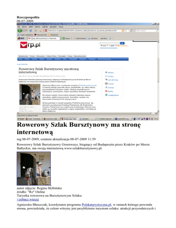 Rzeczpospolita 08-07-2009 Rowerowy Szlak Bursztynowy ma stronę internetową reg 08-07-2009, ostatnia aktualizacja 08-07-2009 11:59 Rowerowy Szlak Bursztynowy Greenways, biegnący od Budapesztu przez Kraków po Morze Bałtyckie, ma swoją internetową www.szlakbursztynowy.pl. autor zdjęcia: Regina Skibińska źródło: "Rz" Online Turystka rowerowa na Bursztynowym Szlaku +zobacz więcej Agnieszka Błaszczak, koordynator programu Polskaturystyczna.pl, w ramach którego powstała strona, powiedziała, że celem witryny jest przybliżenie turystom szlaku: atrakcji przyrodniczych i kulturowych, ekomuzeów, miejsc sprzedaży lokalnych produktów. Na stronie znaleźć można także aktualny kalendarz imprez: jarmarków, rajdów turystycznych, koncertów, wystaw czy warsztatów kulinarnych lub artystycznych. Strona powstała w ramach programu PolskaTurystyczna.pl. Jej twórcami są krakowska Fundacja Partnerstwo dla Środowiska, Fundusz Partnerstwa oraz organizacje koordynujące Bursztynowy Szlak na szczeblu regionalnym z pięciu województw, od Karpat po Morze Bałtyckie. Bursztynowy Szlak Greenways jest polsko-słowacko-węgierską inicjatywą ekoturystyczną realizowaną wzdłuż cennego przyrodniczo i kulturowo historycznego traktu od Budapesztu przez Bańską Szczawnicę po Kraków, i dalej od Krakowa Doliną Wisły po Morze Bałtyckie. Trasa, którą tworzy międzynarodowy szlak rowerowy oraz lokalne pętle tematyczne, eksponuje unikalne wartości zakątków Bursztynowego Szlaku, ich przyrodę, zabytki, tradycje, lokalną kuchnię, rzemiosło, sztukę, imprezy i jarmarki. Bursztynowy Szlak należy do sieci zielonych szlaków Greenways Europy Środkowo-Wschodniej. www.szlakbursztynowy.pl PAP