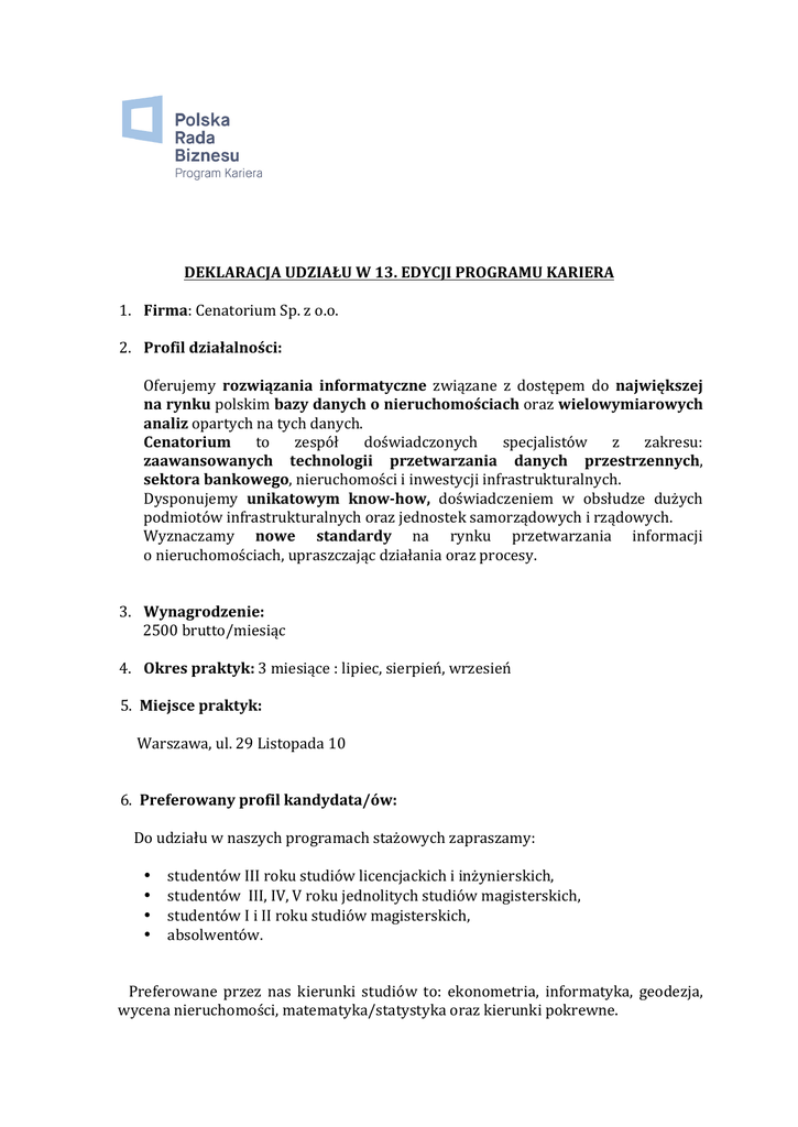 DEKLARACJA UDZIAŁU W 13. EDYCJI PROGRAMU KARIERA 1. Firma: Cenatorium Sp. z o.o. 2. Profil działalności: Oferujemy rozwiązania informatyczne związane z dostępem do największej na rynku polskim bazy danych o nieruchomościach oraz wielowymiarowych analiz opartych na tych danych. Cenatorium to zespół doświadczonych specjalistów z zakresu: zaawansowanych technologii przetwarzania danych przestrzennych, sektora bankowego, nieruchomości i inwestycji infrastrukturalnych. Dysponujemy unikatowym know-‐how, doświadczeniem w obsłudze dużych podmiotów infrastrukturalnych oraz jednostek samorządowych i rządowych. Wyznaczamy nowe standardy na rynku przetwarzania informacji o nieruchomościach, upraszczając działania oraz procesy. 3. Wynagrodzenie: 2500 brutto/miesiąc 4. Okres praktyk: 3 miesiące : lipiec, sierpień, wrzesień 5. Miejsce praktyk: Warszawa, ul. 29 Listopada 10 6. Preferowany profil kandydata/ów: Do udziału w naszych programach stażowych zapraszamy: • • • • studentów III roku studiów licencjackich i inżynierskich, studentów III, IV, V roku jednolitych studiów magisterskich, studentów I i II roku studiów magisterskich, absolwentów. Preferowane przez nas kierunki studiów to: ekonometria, informatyka, geodezja, wycena nieruchomości, matematyka/statystyka oraz kierunki pokrewne. 7. Praktyka w działach: IT, Wycen i analiz 8. Program praktyk: 1/ Cel praktyk • zapoznanie się ze specyfiką działalności i organizacją pracy w firmie Cenatorium, • zapoznanie się z narzędziami oraz systemami informatycznymi stosowanymi w przedsiębiorstwie, ich działaniem, obsługą oraz bezpieczeństwem, • nabycie umiejętności wektoryzacji, weryfikacji i moderacji danych, • nabycie umiejętności współpracy w zespole oraz między działami, • aktywny udział w bieżących przedsięwzięciach realizowanych przez Cenatorium. 2/ Zakres obowiązków • • • • • • • • • 3/ wprowadzanie, digitalizowanie, weryfikacja i moderacja danych, analiza danych ofertowych, opracowywanie raportów i analiz trendów, określanie przybliżonej wartości nieruchomości, analiza czynników wpływających na cenę nieruchomości, wsparcie zespołu B+R w zakresie przetwarzania danych różnego rodzaju, z wykorzystaniem własnych skryptów i dedykowanych narzędzi, wspomaganie tworzenia własnych narzędzi, rozbudowywanie funkcjonalności oprogramowania GIS, bieżące testowanie roboczych rozwiązań software'owych. Opiekun praktyk Adam Sobczak PROSIMY O ROWIĄZANIE ZADANIA Z DZIEDZINY IT LUB WYCEN I ANALIZ ( W ZALEŻNOŚCI DO JAKIEGO DZIAŁU APLIKUJESZ)
