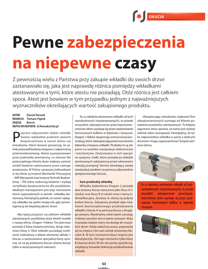 OKUCIA Pewne zabezpieczenia na niepewne czasy Z pewnością wielu z Państwa przy zakupie wkładki do swoich drzwi zastanawiało się, jaka jest naprawdę różnica pomiędzy wkładkami atestowanymi a tymi, które atestu nie posiadają. Otóż różnica jest całkiem spora. Atest jest bowiem w tym przypadku jednym z najważniejszych wyznaczników określających wartość zakupionego produktu. AUTOR: Daniel Nowak REDAKCJA: Tomasz Pępek ZDJĘCIA: Brevis NAPISZ DO EKSPERTA: [email protected] P oprzez odpowiedni dobór wkładki można radykalnie podnieść poziom bezpieczeństwa w swoim domu czy mieszkaniu. Atest stanowi gwarancję, że zamek przeszedł badania związane z odpornością przeciwwłamaniową. Atesty są przyznawane przez jednostkę zewnętrzną, co stanowi dla potencjalnego klienta dużo większą wartość aniżeli badania wykonywane przez samego producenta. W Polsce uznanymi jednostkami w tej sferze są Instytut Mechaniki Precyzyjnej – IMP Warszawie oraz Instytut Techniki Budowlanej – ITB, które wykonują badania i wydają certyfikaty bezpieczeństwa dla produktów. Idealnym rozwiązaniem jest więc stosowanie drzwi wyposażonych w zamek i wkładkę atestowaną. Pamiętajmy jednak, że nawet najlepsza wkładka nie spełni swojej roli, gdy zamontujemy ją do kiepskiej jakości drzwi. Aby lepiej przyjrzeć się zaletom wkładek atestowanych, przybliżmy atuty dwóch modeli z naszej oferty: Dragon i Hektor. Ten pierwszy posiada 6 klasę bezpieczeństwa, drugi natomiast klasę 4. Obie wkładki posiadają możliwość rozbudowy o dalsze elementy układu 1 klucza, a zastosowanie specjalnej karty sprawia, że na jej podstawie klucze można dociąć tylko w autoryzowanych salonach. To co odróżnia atestowane wkładki od tych standardowych (nieatestowanych), to przede wszystkim zabezpieczenie przeciwprzewierceniowe, które uzyskuje się przez zastosowanie hartowanych kołków w bębenku i korpusie. Dragon i Hektor dysponują wzmocnioną konstrukcją, które zabezpieczają przed wyrwaniem bębenka z korpusu wkładki. Produkty te są odporne na wszelkie manipulacje elektroniczne i mechaniczne. Zastosowano w nich specjalne sprężyny i kołki, które posiadacza wkładek atestowanych zabezpieczą przed włamaniem metodą „bumping” (termin określający sztukę manipulacji zamkiem za pomocą odpowiednio spreparowanego klucza). Sam przekoduj wkładkę Wkładka bębenkowa Dragon 2 posiada dwa zestawy klucza oznaczone jako klucz A (1 sztuka) oraz klucz B (4 sztuki) wraz z kartą indentyfikacyjną. Zestawy te różnią się jedynie kodem klucza. Zakupiony produkt daje możliwość beznarzędziowego przekodowania wkładki z klucza A za pomocą kluczy z drugiego zestawu. Wyobraźmy sobie zatem sytuację, w której nasz dom stoi w stanie surowym. Klucz A posiada majster, który ma dostęp do wszystkich drzwi. Kiedy zakończy pracę, pojawiamy się na miejscu i ten sam zamek otwieramy kluczem B. W tym momencie klucz majstra jest bezużyteczny. Od tego momentu tylko klucz B otworzy drzwi. W ten oto prosty sposób najzwyklejszy Kowalski dokonuje przekodowania wkładki. 53 Ubezpieczając mieszkanie, większość firm ubezpieczeniowych wymaga od klienta posiadania produktów atestowanych. To kolejny argument, który sprawia, że warto jest wybrać właśnie takie rozwiązanie. Pamiętajmy, że tylko odpowiednia wkładka w parze z dobrymi drzwiami mogą zagwarantować bezpieczeństwo domu. › To co odróżnia atestowane wkładki od tych standardowych (nieatestowanych), to przede wszystkim zabezpieczenie przeciwprzewierceniowe, które uzyskuje się przez zastosowanie hartowanych kołków w bębenku i korpusie.