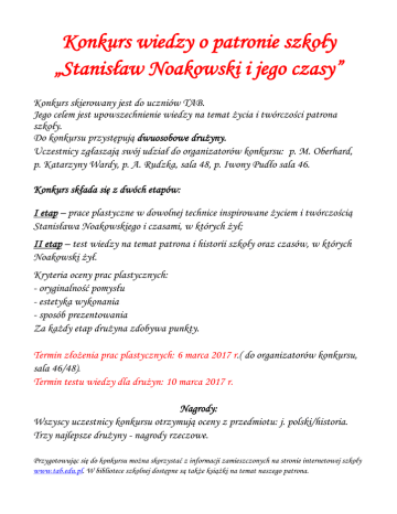 Konkurs wiedzy o patronie szkoły „Stanisław Noakowski i jego czasy” Konkurs skierowany jest do uczniów TAB. Jego celem jest upowszechnienie wiedzy na temat życia i twórczości patrona szkoły. Do konkursu przystępują dwuosobowe drużyny. Uczestnicy zgłaszają swój udział do organizatorów konkursu: p. M. Oberhard, p. Katarzyny Wardy, p. A. Rudzka, sala 48, p. Iwony Pudło sala 46. Konkurs składa się z dwóch etapów: I etap – prace plastyczne w dowolnej technice inspirowane życiem i twórczością Stanisława Noakowskiego i czasami, w których żył; II etap – test wiedzy na temat patrona i historii szkoły oraz czasów, w których Noakowski żył. Kryteria oceny prac plastycznych: - oryginalność pomysłu - estetyka wykonania - sposób prezentowania Za każdy etap drużyna zdobywa punkty. Termin złożenia prac plastycznych: 6 marca 2017 r.( do organizatorów konkursu, sala 46/48). Termin testu wiedzy dla drużyn: 10 marca 2017 r. Nagrody: Wszyscy uczestnicy konkursu otrzymują oceny z przedmiotu: j. polski/historia. Trzy najlepsze drużyny - nagrody rzeczowe. Przygotowując się do konkursu można skorzystać z informacji zamieszczonych na stronie internetowej szkoły www.tab.edu.pl. W bibliotece szkolnej dostępne są także książki na temat naszego patrona.