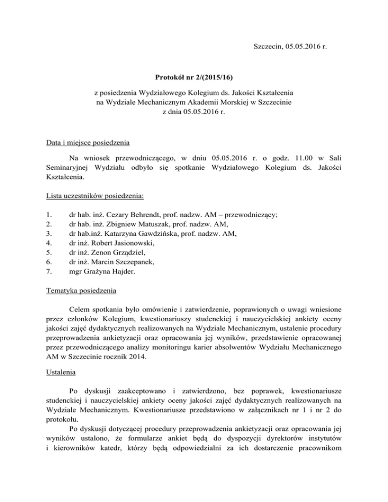 Szczecin, 05.05.2016 r. Protokół nr 2/(2015/16) z posiedzenia Wydziałowego Kolegium ds. Jakości Kształcenia na Wydziale Mechanicznym Akademii Morskiej w Szczecinie z dnia 05.05.2016 r. Data i miejsce posiedzenia Na wniosek przewodniczącego, w dniu 05.05.2016 r. o godz. 11.00 w Sali Seminaryjnej Wydziału odbyło się spotkanie Wydziałowego Kolegium ds. Jakości Kształcenia. Lista uczestników posiedzenia: 1. 2. 3. 4. 5. 6. 7. dr hab. inż. Cezary Behrendt, prof. nadzw. AM – przewodniczący; dr hab. inż. Zbigniew Matuszak, prof. nadzw. AM, dr hab.inż. Katarzyna Gawdzińska, prof. nadzw. AM, dr inż. Robert Jasionowski, dr inż. Zenon Grządziel, dr inż. Marcin Szczepanek, mgr Grażyna Hajder. Tematyka posiedzenia Celem spotkania było omówienie i zatwierdzenie, poprawionych o uwagi wniesione przez członków Kolegium, kwestionariuszy studenckiej i nauczycielskiej ankiety oceny jakości zajęć dydaktycznych realizowanych na Wydziale Mechanicznym, ustalenie procedury przeprowadzenia ankietyzacji oraz opracowania jej wyników, przedstawienie opracowanej przez przewodniczącego analizy monitoringu karier absolwentów Wydziału Mechanicznego AM w Szczecinie rocznik 2014. Ustalenia Po dyskusji zaakceptowano i zatwierdzono, bez poprawek, kwestionariusze studenckiej i nauczycielskiej ankiety oceny jakości zajęć dydaktycznych realizowanych na Wydziale Mechanicznym. Kwestionariusze przedstawiono w załącznikach nr 1 i nr 2 do protokołu. Po dyskusji dotyczącej procedury przeprowadzenia ankietyzacji oraz opracowania jej wyników ustalono, że formularze ankiet będą do dyspozycji dyrektorów instytutów i kierowników katedr, którzy będą odpowiedzialni za ich dostarczenie pracownikom prowadzących zajęcia dydaktyczne. Prowadzący zajęcia przeprowadzą ankietyzację wśród studentów po zakończeniu zajęć dydaktycznych i wypełnione ankiety zwrócą przełożonym. Dyrektorzy instytutów i kierownicy katedr przekażą wypełnione ankiety studenckie przewodniczącemu Kolegium. Za rozprowadzenie ankiet nauczycielskich wśród pracowników, nadzór nad ankietyzacją i zwrot wypełnionych ankiet przewodniczącemu Kolegium odpowiedzialni są dyrektorzy instytutów i kierownicy katedr. Ankietyzacja będzie przeprowadzona w czerwcu. Opracowanie wyników ankietyzacji przeprowadzi przewodniczący Kolegium, a efekty swych prac przedstawi na pierwszym zebraniu Kolegium w roku akademickim 2016/2017. Ostatnim punktem zebrania było omówienie analizy monitoringu karier absolwentów Wydziału Mechanicznego AM w Szczecinie rocznik 2014. Analizę przeprowadzono z wykorzystaniem raportu „Losy zawodowe absolwentów AM w Szczecinie – rocznik 2014” opracowanego przez Biuro karier AM w Szczecinie. Głównym celem badań było poznanie losów zawodowych absolwentów WM AM w okresie do 12 miesięcy od ukończeniu studiów oraz określenie planów zawodowych i edukacyjnych. Przewodniczący zapoznał członków Kolegium z najważniejszymi wnioskami wynikającymi z analizy: - - na 108 absolwentów, ankiety wypełniło i wyraziło zgodę na udział w badaniach 36 absolwentów studiów I stopnia i 6 absolwentów studiów II stopnia. Stanowi to 39% liczby absolwentów; 75% absolwentów znalazło zatrudnienie w branży morskiej; 82% absolwentów pracuje za granicą; 72% absolwentów uzyskało pracę po 2 miesiącach od ukończenia studiów; 39% absolwentów zarabia powyżej 7000 PLN, a 21% w przedziale 5000-7000 PLN; 86% absolwentów powtórnie wybrałaby ten sam kierunek studiów; 61% absolwentów deklaruje wysoki i bardzo wysoki poziom satysfakcji z wykonywanej pracy. Pełną analizę monitoringu karier absolwentów przedstawiono w załączniku nr 3 do niniejszego protokołu. Analiza będzie przedstawiona na majowym posiedzeniu Rady Wydziału. Na tym posiedzenie zakończono. Za Wydziałowe Kolegium ds. Jakości Kształcenia dr hab. inż. Cezary Behrendt, prof. nadzw. AM – przewodniczący Załącznik nr 1 Studencka ankieta oceny jakości zajęć dydaktycznych realizowanych na Wydziale Mechanicznym Akademii Morskiej w Szczecinie Proszę o wypełnienie: Nazwa przedmiotu: ……………………………………………………………………….. Rok akademicki 20…/20… semestr zimowy/letni * *niewłaściwe skreślić Forma realizacji zajęć (proszę zaznaczyć literą x w odpowiedniej kolumnie) Audytoryjne (wykład) Ćwiczenia audytoryjne Laboratorium Symulator Proszę o udzielenie odpowiedzi na następujące pytanie: Czy prowadzący zajęcia przedstawił treści zawarte w karcie przedmiotu (cele, treści programowe, metody i efekty kształcenia, formy walidacji, kryteria oceny, oraz wykaz literatury)? (proszę zaznaczyć literą x w odpowiedniej kolumnie) Tak Nie Poinformował gdzie można zapoznać się z kartą przedmiotu Poniżej wymienione zostały stwierdzenia dotyczące bazy dydaktycznej i sposobu prowadzenia zajęć. W ostatniej kolumnie proszę przypisać dla każdego stwierdzenia ocenę w skali od 1 do 10 (1 ocena negatywna, 10 ocena pozytywna). Lp. Stwierdzenie 1 Zajęcia prowadzone były zgodnie z treścią przedstawioną w karcie przedmiotu Zajęcia odbywały się w planowanym czasie 2 Ocena studenta 3 4 5 6 7 8 9 10 11 Zajęcia prowadzone były w sposób zrozumiały, logiczny i przystępny Osoba prowadząca była dobrze przygotowana do zajęć Prowadzący traktował studentów z szacunkiem, życzliwie i sprawiedliwie Prowadzący tworzył atmosferę sprzyjającą zdobywaniu wiedzy i umiejętności (np. zachęcał do zadawania pytań, wyrażania własnych poglądów, dyskusji, zgłaszania i wyjaśniania wątpliwości) Liczba godzin przeznaczona na realizację zajęć audytoryjnych jest wystarczająca do przekazania wiedzy Liczba godzin przeznaczona na realizację zajęć laboratoryjnych i z wykorzystaniem symulatorów jest wystarczająca do nabycia umiejętności Wyposażenie stanowisk laboratoryjnych jest wystarczające do zdobycia wiedzy i umiejętności Instrukcje do s