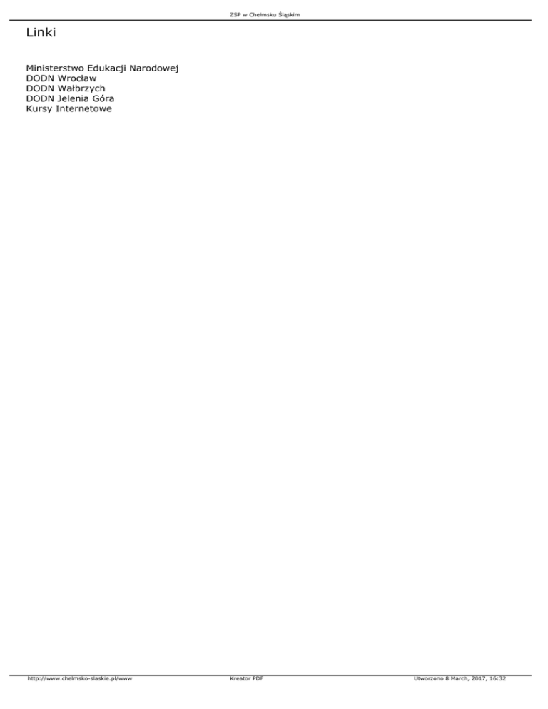 ZSP w Chełmsku Śląskim Linki Ministerstwo Edukacji Narodowej DODN Wrocław DODN Wałbrzych DODN Jelenia Góra Kursy Internetowe http://www.chelmsko-slaskie.pl/www Kreator PDF Utworzono 8 March, 2017, 16:32