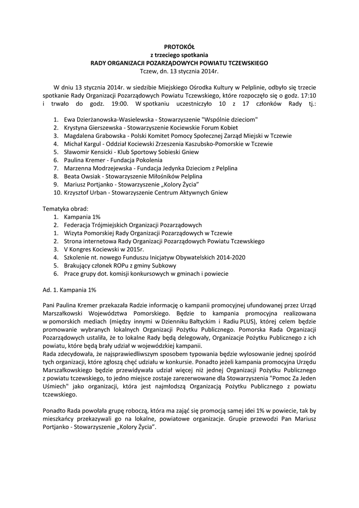 PROTOKÓŁ z trzeciego spotkania RADY ORGANIZACJI POZARZĄDOWYCH POWIATU TCZEWSKIEGO Tczew, dn. 13 stycznia 2014r. W dniu 13 stycznia 2014r. w siedzibie Miejskiego Ośrodka Kultury w Pelplinie, odbyło się trzecie spotkanie Rady Organizacji Pozarządowych Powiatu Tczewskiego, które rozpoczęło się o godz. 17:10 i trwało do godz. 19:00. W spotkaniu uczestniczyło 10 z 17 członków Rady tj.: 1. 2. 3. 4. 5. 6. 7. 8. 9. 10. Ewa Dzierżanowska-Wasielewska - Stowarzyszenie "Wspólnie dzieciom" Krystyna Gierszewska - Stowarzyszenie Kociewskie Forum Kobiet Magdalena Grabowska - Polski Komitet Pomocy Społecznej Zarząd Miejski w Tczewie Michał Kargul - Oddział Kociewski Zrzeszenia Kaszubsko-Pomorskie w Tczewie Sławomir Kensicki - Klub Sportowy Sobieski Gniew Paulina Kremer - Fundacja Pokolenia Marzenna Modrzejewska - Fundacja Jedynka Dzieciom z Pelplina Beata Owsiak - Stowarzyszenie Miłośników Pelplina Mariusz Portjanko - Stowarzyszenie „Kolory Życia” Krzysztof Urban - Stowarzyszenie Centrum Aktywnych Gniew Tematyka obrad: 1. Kampania 1% 2. Federacja Trójmiejskich Organizacji Pozarządowych 1. Wizyta Pomorskiej Rady Organizacji Pozarządowych w Tczewie 2. Strona internetowa Rady Organizacji Pozarządowych Powiatu Tczewskiego 3. V Kongres Kociewski w 2015r. 4. Szkolenie nt. nowego Funduszu Inicjatyw Obywatelskich 2014-2020 5. Brakujący członek ROPu z gminy Subkowy 6. Prace grupy dot. komisji konkursowych w gminach i powiecie Ad. 1. Kampania 1% Pani Paulina Kremer przekazała Radzie informację o kampanii promocyjnej ufundowanej przez Urząd Marszałkowski Województwa Pomorskiego. Będzie to kampania promocyjna realizowana w pomorskich mediach (między innymi w Dzienniku Bałtyckim i Radiu PLUS), której celem będzie promowanie wybranych lokalnych Organizacji Pożytku Publicznego. Pomorska Rada Organizacji Pozarządowych ustaliła, że to lokalne Rady będą delegowały, Organizacje Pożytku Publicznego z ich powiatu, które będą brały udział w wojewódzkiej kampanii. Rada zdecydowała, że najsprawiedliwszym sposobem typowania będzie wylosowanie jednej spośród tych organizacji, które zgłoszą chęć udziału w konkursie. Ponadto jeżeli kampania promocyjna Urzędu Marszałkowskiego będzie przewidywała udział więcej niż jednej Organizacji Pożytku Publicznego z powiatu tczewskiego, to jedno miejsce zostaje zarezerwowane dla Stowarzyszenia "Pomoc Za Jeden Uśmiech" jako organizacji, która jest najmłodszą Organizacją Pożytku Publicznego z powiatu tczewskiego. Ponadto Rada powołała grupę roboczą, która ma zająć się promocją samej idei 1% w powiecie, tak by mieszkańcy przekazywali go na lokalne, powiatowe organizacje. Grupie przewodzi Pan Mariusz Portjanko - Stowarzyszenie „Kolory Życia”. Ad. 2. Federacja Trójmiejskich Organizacji Pozarządowych Grupa przedstawicieli organizacji pozarządowych metropolii trójmiejskiej złożyła wspólną fisz, która przewiduje 7-letnie wsparcie dla trójmiejskich organizacji. W związku z tym faktem, grupa tych przedstawicieli zdecydowała o powołaniu Federacji, która miałaby zarządzać w przyszłości tym projektem. W Federacji mają uczestniczyć organizacje zajmujące się wsparciem 3-go sektora. Grupa przedstawicieli organizacji pozarządowych metropolii trójmiejskiej zwróciła się z prośbą do wszystkich metropolitalnych lokalnych rad organizacji o wytypowanie takich organizacji. Rada zdecydowała, że skonsultuje tę kwestię z różnymi zainteresowanymi organizacjami i w najbliższym czasie wyda dla nich rekomendacje co do udziału w Federacji. Ad. 3. Wizyta Pomorskiej Rady Organizacji Pozarządowych w Tczewie Zgodnie z wcześniejszymi zapowiedziami 15.01.2014r. nie odbyło się w Tczewie spotkanie Pomorskiej Rady Organizacji Pozarządowych. Spotkanie zostało przełożone na luty 2014r. Rada omówiła wstępny program spotkania PROPu oraz termin i miejsce spotkania. Wstępna propozycja zakłada spotkanie w Fabryce Sztuk w Tczewie 26.02.2014r. (środa) w godz. 16.00 do 18.00. Ad. 4. Strona internetowa Rady Organizacji Pozarządowych Pani Paulina Kremer przedstawiła Radzie propozycję strony internetowej Rady. Propozycja została zaakceptowana przez wszystkich. Ponadto Rada zobowiązała Panią Paulinę do podjęcia działań na rzecz umieszczenia ww. strony na serwerze Urzędu Miasta Tczew. Ad. 5. V Kongres Kociewski w 2015r. Pan Michał Kargul - Oddział Kociewski Zrzeszenia Kaszubsko-Pomorskie w Tczewie, poinformował Radę o spotkaniu jakie odbędzie się 25.01.2014r. o godz. 10.00 w Fabryce Sztuk w Tczewie. Spotkanie dotyczy przygotowania V Kongresu Kociewskiego jaki odbędzie się w 2015r. Pan Michał Kargul zwrócił się do radnych z prośbą o zaangażowanie się w Kongres. Ad. 6. Szkolenie dotyczące nowego Funduszu Inicjatyw Obywatelskich 2014-2020 Pan Sławomir Kensicki - Klub Sportowy Sobieski Gniew, przekazał Radzie informacje, że jego organizacja będzie w najbliższym czasie prowadziła szkolenie z nowego Funduszu Inicjatyw Obywatelskich 2014-2020. Więcej informacji Pan Sławomir przekaże, w momencie gdy program zacznie formalnie funkcjonować. Ad. 7. Brakujący członek ROPu z gminy Subkowy Rada debatowała nt. braku przedstawiciela gminy Subkowy w składzie Rady. Członkowie Rady: Pani Krystyna Gierszewska, Pan Krzysztof Urban oraz Pan Sławomir Kensicki zgodzili się przeprowadzić rozmowy z organizacjami z gminy Subkowy nt. zbadania przyczyn braku chęci udziału w Radzie oraz ewentualnemu zaradzeniu obecnej sytuacji. Ad. 8. Prace grupy dot. komisji konkursowej w gminach i powiecie Prace grupy roboczej dalej trwają. Wnioski grupa przedstawi w najbliższym czasie. Harmonogram spotkań Rady na I kwartał 2014r. 10.02.2014.r (poniedziałek) godz. 17.00 – Gniew 10.03.2014r. (poniedziałek) godz. 17.00 – Subkowy