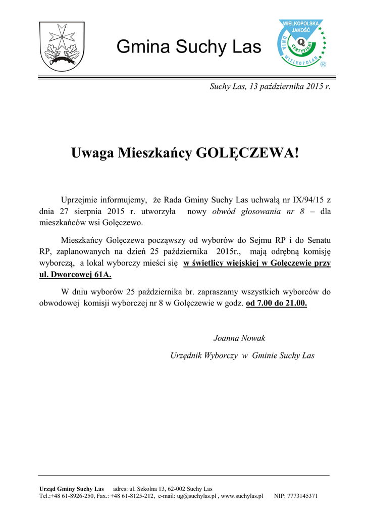 Gmina Suchy Las Suchy Las, 13 października 2015 r. Uwaga Mieszkańcy GOLĘCZEWA! Uprzejmie informujemy, że Rada Gminy Suchy Las uchwałą nr IX/94/15 z dnia 27 sierpnia 2015 r. utworzyła nowy obwód głosowania nr 8 – dla mieszkańców wsi Golęczewo. Mieszkańcy Golęczewa począwszy od wyborów do Sejmu RP i do Senatu RP, zaplanowanych na dzień 25 października 2015r., mają odrębną komisję wyborczą, a lokal wyborczy mieści się w świetlicy wiejskiej w Golęczewie przy ul. Dworcowej 61A. W dniu wyborów 25 października br. zapraszamy wszystkich wyborców do obwodowej komisji wyborczej nr 8 w Golęczewie w godz. od 7.00 do 21.00. Joanna Nowak Urzędnik Wyborczy w Gminie Suchy Las Urząd Gminy Suchy Las adres: ul. Szkolna 13, 62-002 Suchy Las Tel.:+48 61-8926-250, Fax.: +48 61-8125-212, e-mail: [email protected] , www.suchylas.pl NIP: 7773145371