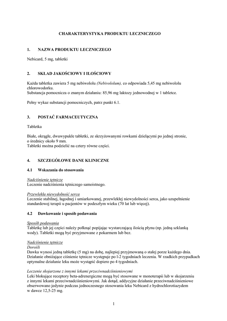 CHARAKTERYSTYKA PRODUKTU LECZNICZEGO 1. NAZWA PRODUKTU LECZNICZEGO Nebicard, 5 mg, tabletki 2. SKŁAD JAKOŚCIOWY I ILOŚCIOWY Każda tabletka zawiera 5 mg nebiwololu (Nebivololum), co odpowiada 5,45 mg nebiwololu chlorowodorku. Substancja pomocnicza o znanym działaniu: 85,96 mg laktozy jednowodnej w 1 tabletce. Pełny wykaz substancji pomocniczych, patrz punkt 6.1. 3. POSTAĆ FARMACEUTYCZNA Tabletka Białe, okrągłe, dwuwypukłe tabletki, ze skrzyżowanymi rowkami dzielącymi po jednej stronie, o średnicy około 9 mm. Tabletki można podzielić na cztery równe części. 4. SZCZEGÓŁOWE DANE KLINICZNE 4.1 Wskazania do stosowania Nadciśnienie tętnicze Leczenie nadciśnienia tętniczego samoistnego. Przewlekła niewydolność serca Leczenie stabilnej, łagodnej i umiarkowanej, przewlekłej niewydolności serca, jako uzupełnienie standardowej terapii u pacjentów w podeszłym wieku (70 lat lub więcej). 4.2 Dawkowanie i sposób podawania Sposób podawania Tabletkę lub jej części należy połknąć popijając wystarczającą ilością płynu (np. jedną szklanką wody). Tabletki mogą być przyjmowane z pokarmem lub bez. Nadciśnienie tętnicze Dorośli Dawka wynosi jedną tabletkę (5 mg) na dobę, najlepiej przyjmowaną o stałej porze każdego dnia. Działanie obniżające ciśnienie tętnicze występuje po l-2 tygodniach leczenia. W rzadkich przypadkach optymalne działanie leku może wystąpić dopiero po 4 tygodniach. Leczenie skojarzone z innymi lekami przeciwnadciśnieniowymi Leki blokujące receptory beta-adrenergiczne mogą być stosowane w monoterapii lub w skojarzeniu z innymi lekami przeciwnadciśnieniowymi. Jak dotąd, addycyjne działanie przeciwnadciśnieniowe obserwowano jedynie podczas jednoczesnego stosowania leku Nebicard z hydrochlorotiazydem w dawce 12,5-25 mg. 1 Pacjenci z niewydolnością nerek Zalecana dawka początkowa dla pacjentów z niewydolnością nerek wynosi 2,5 mg na dobę. W razie konieczności dawkę dobową można zwiększyć do 5 mg. Pacjenci z niewydolnością wątroby Dane dotyczące pacjentów z niewydolnością wątroby lub zaburzeniami czynności wątroby są ograniczone. Dlatego stosowanie leku Nebicard u tych pacjentów jest przeciwwskazane. Pacjenci w podeszłym wieku U pacjentów w wieku powyżej 65 lat zalecana dawka początkowa wynosi 2,5 mg na dobę. W razie potrzeby dawkę dobową można zwiększyć do 5 mg. Jednocześnie, ze względu na ograniczone doświadczenie u osób w wieku powyżej 75 lat, należy zachować ostrożność i ściśle obserwować pacjentów. Dzieci i młodzież Nie przeprowadzono badań nad lekiem u dzieci i młodzieży. Z tego względu stosowanie leku Nebicard u dzieci i młodzieży nie jest zalecane. Przewlekła niewydolność serca Leczenie stabilnej przewlekłej niewydolności serca należy rozpocząć poprzez stopniowe zwiększanie dawki, aż do uzyskania optymalnej dawki podtrzymującej określonej dla każdego pacjenta. Pacjenci powinni mieć stabilną przewlekłą niewydolność serca i nie powinna u nich występować ostra niewydolność serca przez ostatnie sześć tygodni. Zaleca się, aby lekarz prowadzący miał doświadczenie w leczeniu przewlekłej niewydolności serca. U pacjentów otrzymujących leki działające na układ sercowo-naczyniowy, w tym leki moczopędne i (lub) digoksynę i (lub) inhibitory ACE i (lub) antagonistów receptora angiotensyny II, dawkowanie tych leków powinno być ustabilizowane podczas ostatnich dwóch tygodni przed rozpoczęciem leczenia lekiem Nebicard. Dawkę początkową należy zwiększać co 1-2 tygodnie w zależności od tolerancji leku przez pacjenta: 1,25 mg nebiwololu, zwiększyć do 2,5 mg nebiwololu raz na dobę, następnie do 5 mg raz na dobę i następnie do 10 mg raz na dobę. Maksymalna zalecana dawka wynosi 10 mg nebiwololu raz na dobę. Rozpoczęcie leczenia i każde zwiększenie dawki powinno być wykonane pod nadzorem doświadczonego lekarza, trwającym co najmniej 2 godziny dla upewnienia się, że stan kliniczny pacjenta pozostaje stabilny (zwłaszcza ciśnienie tętnicze krwi, częstość akcji serca, zaburzenia przewodzenia, objawy nasilenia niewydolności serca). Występowanie działań niepożądanych może uniemożliwiać leczenie maksymalną zalecaną dawką leku. W razie konieczności dawkę podtrzymującą można również stopniowo zmniejszać i ponownie zwiększać, jeżeli jest to wskazane. Podczas stopniowego zwiększania dawki, w przypadku nasilenia niewydolności serca lub nietolerancji leku, najpierw zalecane jest zmniejszenie dawki nebiwololu lub, w razie konieczności, natychmiastowe przerwanie leczenia (w przypadku ciężkiego niedociśnienia tętniczego, nasilenia niewydolności serca z ostrym obrzękiem płuc, wstrząsu kardiogennego, objawowej bradykardii lub bloku przedsionkowo-komorowego). Leczenie stabilnej przewlekłej niewydolności serca nebiwololem jest zwykle leczeniem długotrwałym. Nie zaleca się nagłego przerywania leczenia nebiwololem, ponieważ może to prowadzić do przemijającego nasilenia niewydolności serca. Jeśli przerwanie leczenia jest konieczne, dawka powinna być zmniejszana stopniowo, o połowę co tydzień. 2 Pacjenci z niewydolnością nerek Nie jest wymagane dostosowanie dawki w przypadku łagodnej do umiarkowanej niewydolności nerek, gdyż dawkę zwiększa się stopniowo do dawki maksymalnej tolerowanej przez pacjenta. Brak doświadczeń u pacjentów z ciężką niewydolnością nerek (stężenie kreatyniny w surowicy 250 μmol/l). Dlatego stosowanie nebiwololu u tych pacjentów nie jest zalecane. Pacjenci z niewydolnością wątroby Dane dotyczące pacjentów z niewydolnością wątroby są ograniczone. Dlatego stosowanie leku Nebicard u tych pacjentów jest przeciwwskazane. Pacjenci w podeszłym wieku Nie jest wymagane dostosowanie dawki, gdyż dawkę zwiększa się stopniowo do dawki maksymalnej tolerowanej przez pacjenta. Dzieci i młodzież Nie przeprowadzono badań nad lekiem u dzieci 