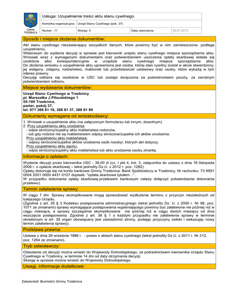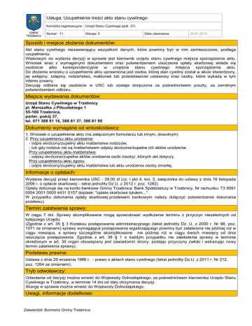 Usługa: Uzupełnienie treści aktu stanu cywilnego Komórka organizacyjna Urząd Stanu Cywilnego (pok. 37) Numer: 11 Wersja: 5 Data utworzenia 30.01.2013 Sposób i miejsce złożenia dokumentów: Akt stanu cywilnego niezawierający wszystkich danych, które powinny być w nim zamieszczone, podlega uzupełnieniu. Właściwym do wydania decyzji w sprawie jest kierownik urzędu stanu cywilnego miejsca sporządzenia aktu. Wniosek wraz z wymaganymi dokumentami oraz potwierdzeniem uiszczenia opłaty skarbowej składa się osobiście albo korespondencyjnie w urzędzie stanu cywilnego miejsca sporządzenia aktu. Do złożenia wniosku o uzupełnienie aktu uprawniona jest osoba, której stan cywilny został w akcie stwierdzony, jej wstępny, zstępny, rodzeństwo, małżonek lub przedstawiciel ustawowy oraz osoby, które wykażą w tym interes prawny. Decyzję odbiera się osobiście w USC lub zostaje doręczona za pośrednictwem poczty, za zwrotnym potwierdzeniem odbioru. Miejsce wydawania dokumentów: Urząd Stanu Cywilnego w Trzebnicy pl. Marszałka J.Piłsudskiego 1 55-100 Trzebnica, parter, pokój 37, tel. 071 388 81 16, 388 81 37, 388 81 99 Dokumenty wymagane od wnioskodawcy: 1. Wniosek o uzupełnienie aktu (na załączonym formularzu lub innym, dowolnym) 2. Przy uzupełnieniu aktu urodzenia: - odpis skrócony/zupełny aktu małżeństwa rodziców, - lub gdy rodzice nie są małżeństwem odpisy skrócone/zupełne ich aktów urodzenia. Przy uzupełnieniu aktu małżeństwa: - odpisy skrócone/zupełne aktów urodzenia osób /osoby/, których akt dotyczy. Przy uzupełnieniu aktu zgonu: - odpis skrócony/zupełny aktu małżeństwa lub aktu urodzenia osoby zmarłej. Informacje o opłatach: Wydanie decyzji przez kierownika USC - 39,00 zł (cz. I pkt 4, kol. 3, załącznika do ustawy z dnia 16 listopada 2006 r. o opłacie skarbowej – tekst jednolity Dz.U. z 2012 r. poz. 1282). Opłaty dokonuje się na konto bankowe Gminy Trzebnica: Bank Spółdzielczy w Trzebnicy, Nr rachunku: 73 9591 0004 2001 0000 4431 0107 dopisek: "opłata skarbowa tytułem..." . W przypadku dokonania opłaty skarbowej przelewem bankowym należy dołączyć potwierdzenie dokonania przelewu). Termin załatwienia sprawy: W ciągu 7 dni. Sprawy skomplikowane mogą spowodować wydłużenie terminu z przyczyn niezależnych od tutejszego Urzędu. (Zgodnie z art. 35 § 3 Kodeksu postępowania administracyjnego (tekst jednolity Dz. U. z 2000 r. Nr 98, poz. 1071 ze zmianami) sprawy wymagające postępowania wyjaśniającego powinny być załatwione nie później niż w ciągu miesiąca, a sprawy szczególnie skomplikowane nie później niż w ciągu dwóch miesięcy od dnia wszczęcia postępowania. Zgodnie z art. 36 § 1 o każdym przypadku nie załatwienia sprawy w terminie określonym w art. 35 organ obowiązany jest zawiadomić strony, podając przyczyny zwłoki i wskazując nowy termin załatwienia sprawy). Podstawa prawna: Ustawa z dnia 29 września 1986 r. - prawo o aktach stanu cywilnego (tekst jednolity Dz.U. z 2011 r. Nr 212, poz. 1264 ze zmianami). Tryb odwoławczy: Odwołanie od decyzji można wnieść do Wojewody Dolnośląskiego, za pośrednictwem kierownika Urzędu Stanu Cywilnego w Trzebnicy, w terminie 14 dni od daty otrzymania decyzji. Skargę w sprawie można wnieść do Wojewody Dolnośląskiego. Uwagi, informacje dodatkowe: Zatwierdził: Burmistrz Gminy Trzebnica Usługa: Uzupełnienie treści aktu stanu cywilnego Komórka organizacyjna Urząd Stanu Cywilnego (pok. 37) Numer: 11 Wersja: 5 Data utworzenia 30.01.2013 Uzupełnieniu podlega akt stanu cywilnego nie zawierający wszystkich danych, które powinny być w nim zamieszczone. Podstawą uzupełnienia są przede wszystkim akty stanu cywilnego. Dokumenty składane wraz z wnioskiem nie podlegają zwrotowi, lecz są włączane do akt zbiorowych aktu stanu cywilnego i przechowywane w USC przez okres 100 lat, następnie przekazywane do archiwum państwowego. Miejsce na notatki: Wniosek o uzupełnienie aktu stanu cywilnego składa się na załączonym formularzu lub innym, dowolnym. Jednostka odpowiedzialna: Urząd Stanu Cywilnego w Trzebnicy, pokój nr 37 (parter), Anna Piotrowska, tel. +48 71 388 81 37, e-mail: [email protected] Zatwierdził: Burmistrz Gminy Trzebnica