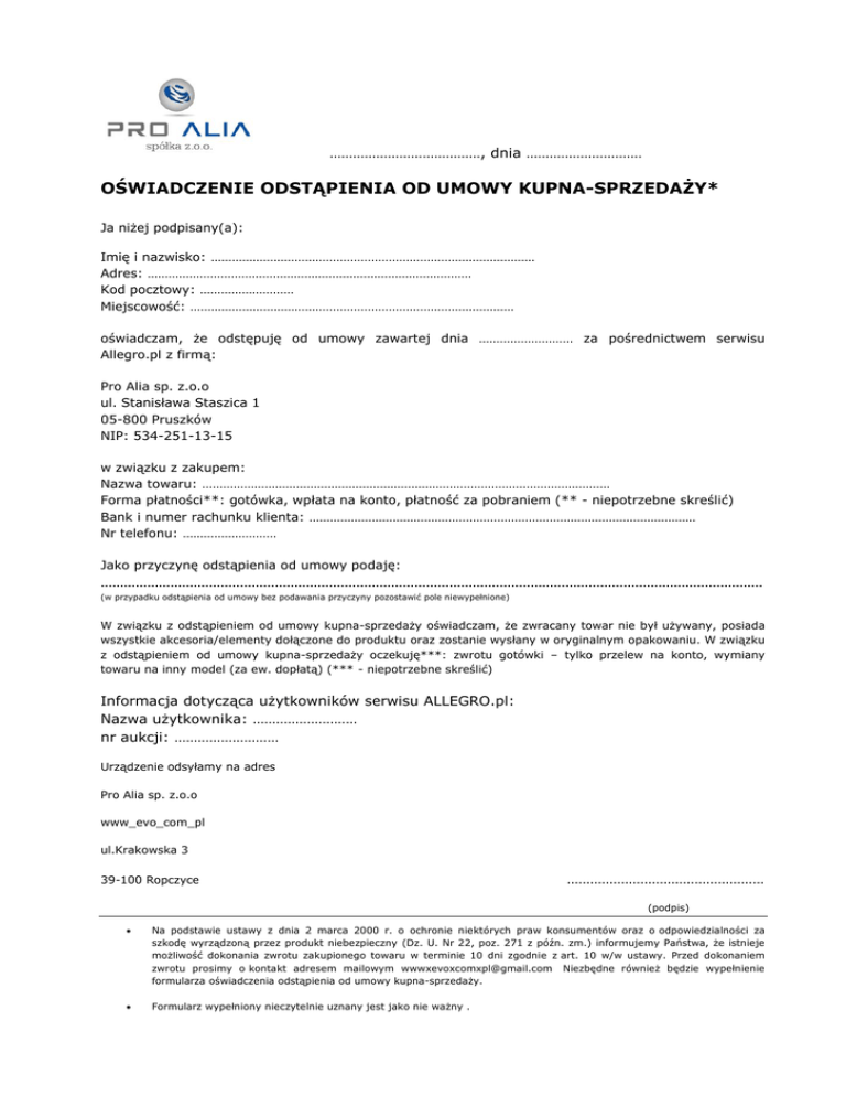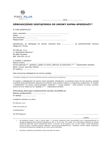 …………………………………, dnia ………………………… OŚWIADCZENIE ODSTĄPIENIA OD UMOWY KUPNA-SPRZEDAŻY* Ja niżej podpisany(a): Imię i nazwisko: ………………………………………………………………………………… Adres: ………………………………………………………………………………… Kod pocztowy: ……………………… Miejscowość: ………………………………………………………………………………… oświadczam, że odstępuję od umowy zawartej dnia ……………………… za pośrednictwem serwisu Allegro.pl z firmą: Pro Alia sp. z.o.o ul. Stanisława Staszica 1 05-800 Pruszków NIP: 534-251-13-15 w związku z zakupem: Nazwa towaru: ……………………………………………………………………………………………………… Forma płatności**: gotówka, wpłata na konto, płatność za pobraniem (** - niepotrzebne skreślić) Bank i numer rachunku klienta: ………………………………………………………………………………………………… Nr telefonu: ……………………… Jako przyczynę odstąpienia od umowy podaję: ……………………………………………………………………………………………………………………………………………………… (w przypadku odstąpienia od umowy bez podawania przyczyny pozostawić pole niewypełnione) W związku z odstąpieniem od umowy kupna-sprzedaży oświadczam, że zwracany towar nie był używany, posiada wszystkie akcesoria/elementy dołączone do produktu oraz zostanie wysłany w oryginalnym opakowaniu. W związku z odstąpieniem od umowy kupna-sprzedaży oczekuję***: zwrotu gotówki – tylko przelew na konto, wymiany towaru na inny model (za ew. dopłatą) (*** - niepotrzebne skreślić) Informacja dotycząca użytkowników serwisu ALLEGRO.pl: Nazwa użytkownika: ……………………… nr aukcji: ……………………… Urządzenie odsyłamy na adres Pro Alia sp. z.o.o www_evo_com_pl ul.Krakowska 3 39-100 Ropczyce …………………………………………… (podpis) Na podstawie ustawy z dnia 2 marca 2000 r. o ochronie niektórych praw konsumentów oraz o odpowiedzialności za szkodę wyrządzoną przez produkt niebezpieczny (Dz. U. Nr 22, poz. 271 z późn. zm.) informujemy Państwa, że istnieje możliwość dokonania zwrotu zakupionego towaru w terminie 10 dni zgodnie z art. 10 w/w ustawy. Przed dokonaniem zwrotu prosimy o kontakt adresem mailowym [email protected] Niezbędne również będzie wypełnienie formularza oświadczenia odstąpienia od umowy kupna-sprzedaży. Formularz wypełniony nieczytelnie uznany jest jako nie ważny .