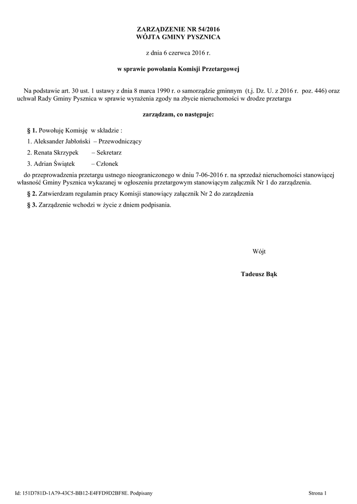 ZARZĄDZENIE NR 54/2016 WÓJTA GMINY PYSZNICA z dnia 6 czerwca 2016 r. w sprawie powołania Komisji Przetargowej Na podstawie art. 30 ust. 1 ustawy z dnia 8 marca 1990 r. o samorządzie gminnym (t.j. Dz. U. z 2016 r. poz. 446) oraz uchwał Rady Gminy Pysznica w sprawie wyrażenia zgody na zbycie nieruchomości w drodze przetargu zarządzam, co następuje: § 1. Powołuję Komisję w składzie : 1. Aleksander Jabłoński – Przewodniczący 2. Renata Skrzypek – Sekretarz 3. Adrian Świątek – Członek do przeprowadzenia przetargu ustnego nieograniczonego w dniu 7-06-2016 r. na sprzedaż nieruchomości stanowiącej własność Gminy Pysznica wykazanej w ogłoszeniu przetargowym stanowiącym załącznik Nr 1 do zarządzenia. § 2. Zatwierdzam regulamin pracy Komisji stanowiący załącznik Nr 2 do zarządzenia § 3. Zarządzenie wchodzi w życie z dniem podpisania. Wójt Tadeusz Bąk Id: 151D781D-1A79-43C5-BB12-E4FFD9D2BF8E. Podpisany Strona 1 Załącznik Nr 1 do Zarządzenia Nr 54/2016 Wójta Gminy Pysznica z dnia 6 czerwca 2016 r. Wójt Gminy Pysznica Ogłasza przetarg na sprzedaż nieruchomości stanowiących własność gminy Pysznica Lp Położenie Nr działki Nr Kw 1 Pysznica 972 973 974/4 TB1S/00063222/1 TB1S/00063222/1 TB1S/00063172/5 2 Jastkowice 244/7 TB1S/00028043/5 Pow. działki w ha 0,0294 0,0318 0,19 0,98 Przezn. w MPO lub decyzja. Budownictwo jednorodzinne zgodnie z mpzp Brak planu nieużytek Cena w zł. 130 000 brutto 72 000 netto Kwota wadium W PLN 15 000 8 000 Termin zagospodarowania Uwagi Do końca 2018 r Bez obciążeń Do końca 2018 r * Przetarg ustny oddzielnie na każdą nieruchomość wg. kolejności uwzględnionej w w/w tabeli odbędzie się w dniu 7-06-2016 r. o godz. 900 w budynku Urzędu Gminy w Pysznicy ul. Wolności 322. Warunkiem przystąpienia do przetargu jest wpłata wadium w wysokości uwzględnionej w tabeli w terminie do 3-06-2016 r. na konto Urzędu Gminy w Pysznicy Nr 36 9434 1025 2006 1695 1311 0002 BS Tarnobrzeg o/Nisko. Uczestnik, który kupuje więcej niż jedną działkę winien wpłacić wielokrotność kwoty wadium. Wadium wpłacone przez osobę, która wygra przetarg zostanie zaliczone na poczet ceny nabycia działki, pozostałym uczestnikom wadium zostanie niezwłocznie zwrócone po zakończeniu przetargu. W przypadku, gdy osoba, która wygra przetarg, uchyli się od zawarcia umowy wadium przepada na rzecz Gminy Pysznica. Uczestnik przetargu powinien posiadać dowód osobisty, oraz potwierdzenie wpłaty wadium. W przypadku wpłaty wadium przez Internet konieczne jest przedłożenie zaświadczenia z banku o potwierdzeniu wpłaty. * Na wymienionej w poz. 2 działce znajduje się transformator i jest ustanowiona służebność przesyłu na rzecz PGE Dystrybucja S.A. Oddział Rzeszów i jej każdoczesnego następcy prawnego. Osoba reprezentująca w przetargu inną osobę fizyczną lub prawną powinna posiadać pisemne pełnomocnictwo lub upoważnienie do reprezentowania. Bliższych informacji na temat działek przeznaczonych do sprzedaży można uzyskać w UG Pysznica, ul. Wolności 322 pok. Nr 24 lub tel. 0-15 841-01-02 w godz. pracy Urzędu. Id: 151D781D-1A79-43C5-BB12-E4FFD9D2BF8E. Podpisany Strona 1 Załącznik Nr 2 do Zarządzenia Nr 54/2016 Wójta Gminy Pysznica z dnia 6 czerwca 2016 r. REGULAMIN PRACY KOMISJI powołanej do przeprowadzenia przetargu ustnego licytacji 1. Komisja powołana w celu realizacji Uchwały Rady Gminy w Pysznicy w sprawie wyrażenia zgody na rozdysponowanie nieruchomości w drodze przetargu i rozpoczyna działalność z dniem jej powołania. 2. Komisję obowiązują przepisy ustawy z dnia 21 sierpnia 1997 r. o gospodarce nieruchomościami (t.j. Dz. U. z 2015 poz. 1774, z późn. zm.) oraz akty wykonawcze wydane na jej podstawie oraz postanowienia niniejszego regulaminu. 3. Pracą Komisji kieruje Przewodniczący. 4. Członkowie Komisji - udzielają wyjaśnień dotyczących nieruchomości objętych przetargiem, - oceniają prawidłowość ogłoszenia przetargu, - oceniają prawidłowość wpłaty wadium przez oferentów, - w przypadku nieprawidłowości ze strony oferenta decyduje o niedopuszczeniu do przetargu, - rozstrzygają spory wynikłe w przetargu ustnym-licytacji. 5. Członkowie Komisji przeprowadzają przetarg ustny-licytację wyłaniając najlepszą oferowaną cenę. 6. Członkowie Komisji z przeprowadzonej licytacji spisują protokół który stanowi podstawę do zawarcia Notarialnej umowy kupna sprzedaży. 7. Sekretarz Komisji zapewnia prawidłową dokumentację prac Komisji i pisemność postępowania Komisji, zgodnie z przepisami ustawy o gospodarce nieruchomościami. 8. Komisja zakończy prace w dniu podpisania umowy notarialnej kupna sprzedaży nieruchomości. Id: 151D781D-1A79-43C5-BB12-E4FFD9D2BF8E. Podpisany Strona 1