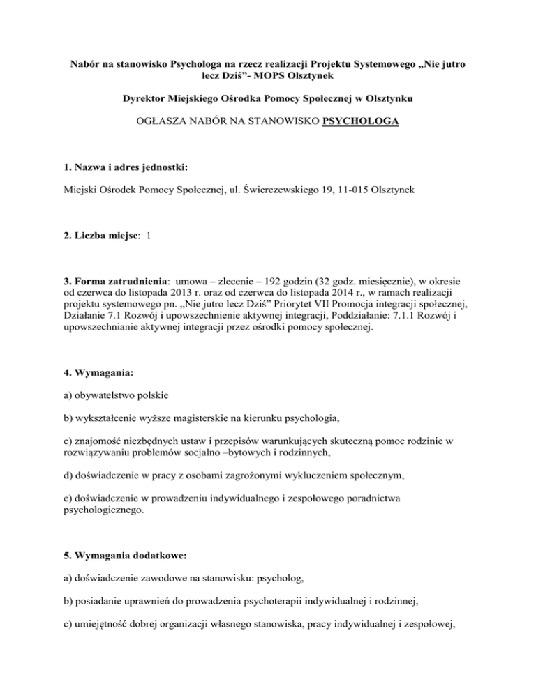 Nabór na stanowisko Psychologa na rzecz realizacji Projektu Systemowego „Nie jutro lecz Dziś”- MOPS Olsztynek Dyrektor Miejskiego Ośrodka Pomocy Społecznej w Olsztynku OGŁASZA NABÓR NA STANOWISKO PSYCHOLOGA 1. Nazwa i adres jednostki: Miejski Ośrodek Pomocy Społecznej, ul. Świerczewskiego 19, 11-015 Olsztynek 2. Liczba miejsc: 1 3. Forma zatrudnienia: umowa – zlecenie – 192 godzin (32 godz. miesięcznie), w okresie od czerwca do listopada 2013 r. oraz od czerwca do listopada 2014 r., w ramach realizacji projektu systemowego pn. „Nie jutro lecz Dziś” Priorytet VII Promocja integracji społecznej, Działanie 7.1 Rozwój i upowszechnienie aktywnej integracji, Poddziałanie: 7.1.1 Rozwój i upowszechnianie aktywnej integracji przez ośrodki pomocy społecznej. 4. Wymagania: a) obywatelstwo polskie b) wykształcenie wyższe magisterskie na kierunku psychologia, c) znajomość niezbędnych ustaw i przepisów warunkujących skuteczną pomoc rodzinie w rozwiązywaniu problemów socjalno –bytowych i rodzinnych, d) doświadczenie w pracy z osobami zagrożonymi wykluczeniem społecznym, e) doświadczenie w prowadzeniu indywidualnego i zespołowego poradnictwa psychologicznego. 5. Wymagania dodatkowe: a) doświadczenie zawodowe na stanowisku: psycholog, b) posiadanie uprawnień do prowadzenia psychoterapii indywidualnej i rodzinnej, c) umiejętność dobrej organizacji własnego stanowiska, pracy indywidualnej i zespołowej, d) sumienność, terminowość, odpowiedzialność, otwartość na kontakt z ludźmi. 6. Zakres zadań wykonywanych na stanowisku: Do podstawowych obowiązków należeć będzie udzielanie specjalistycznej pomocy dla rodzin objętych wsparciem asystenta rodzinnego uczestniczących w projekcie, w tym: a) pomoc psychologiczna mającej na celu pomoc osobom i rodzinom objętych wsparciem asystenta rodziny w ramach projektu „Nie jutro lecz Dziś ”, we wzmacnianiu lub odzyskiwaniu zdolności do funkcjonowania w społeczeństwie poprzez pełnienie odpowiednich ról społecznych oraz tworzenie warunków sprzyjających temu celowi, b) udzielanie informacji, wskazówek i pomocy w zakresie rozwiązywania spraw życiowych osobom, które dzięki tej pomocy będą zdolne samodzielnie rozwiązywać problemy będące przyczyną trudnej sytuacji życiowej, c) ustalanie działań zmierzających do zaspokojenia stwierdzonych potrzeb społecznych, psychicznych i biologicznych, d) wspieranie uczestników projektu w zakresie podnoszenia ich kompetencji życiowych i umiejętności społecznych, e) udzielanie pomocy zgodnie z zasadami etyki zawodowej i kierowanie się zasadami etyki zawodowej w trakcie wykonywania obowiązków służbowych, f) współpraca z pracownikami socjalnymi ośrodka pomocy społecznej, środowiskiem lokalnym oraz innymi instytucjami na rzecz uczestników projektu, g) prowadzenie dokumentacji w zakresie w/w działań (karty pracy), h) sporządzenie raportu z przebiegu realizacji zadania. 7. Wymagane dokumenty: aktualne CV, list motywacyjny, kserokopie dyplomów potwierdzających wykształcenie oraz kserokopie zaświadczeń o ukończonych kursach i szkoleniach, Oświadczenie o niekaralności następującej treści: „Oświadczam, że nie byłem/am karany/a za przestępstwo popełnione umyślnie i nie toczy się przeciwko mnie postępowanie karne. Oświadczam, że posiadam pełną zdolność do czynności prawnych i korzystam z pełni praw publicznych zgodnie z ustawą o pracownikach samorządowych z dnia 21 listopada 2008r. (tekst jednolity Dz. U. Nr 223 poz.1458 z późn. zm.).” Oświadczenie dotyczące zgody na przetwarzanie danych osobowych o treści: „ Wyrażam zgodę na przetwarzanie danych osobowych zawartych w ofercie pracy dla potrzeb niezbędnych do realizacji procesu rekrutacji na stanowisko –Psycholog na rzecz realizacji Projektu Systemowego „Nie jutro lecz Dziś”- MOPS w Olsztynku, zgodnie z ustawą z dnia 29.08.1997 r. o ochronie danych osobowych (tekst jednolity Dz. U. z 2002 r. Nr 101, poz. 926 z późn. zm.)” 8. Dodatkowe informacje: Wymagane dokumenty aplikacyjne należy składać osobiście lub korespondencyjnie, w zamkniętej kopercie, w sekretariacie Miejskiego Ośrodka Pomocy Społecznej w Olsztynku, ul. Świerczewskiego 19, 11-015, z dopiskiem: Dotyczy naboru na stanowisko Asystent Rodziny, w terminie do dnia 21 czerwca 2012r.do godz. 12:00 (decyduje data wpływu do Ośrodka). Aplikacje, które wpłyną do Miejskiego Ośrodka Pomocy Społecznej w Olsztynku po wyżej określonym terminie nie będą rozpatrywane. Informacja o wyniku naboru będzie umieszczona na stronie internetowej Miejskiego Ośrodka Pomocy Społecznej w Olsztynku (http://mops.olsztynek.net.pl/) oraz na tablicy informacyjnej Miejskiego Ośrodka Pomocy Społecznej w Olsztynku. W ciągu 14 dni od dnia zakończenia procedury rekrutacyjnej, dokumenty można odbierać w sekretariacie Ośrodka. Po upływie tego terminu zostaną komisyjnie zniszczone.