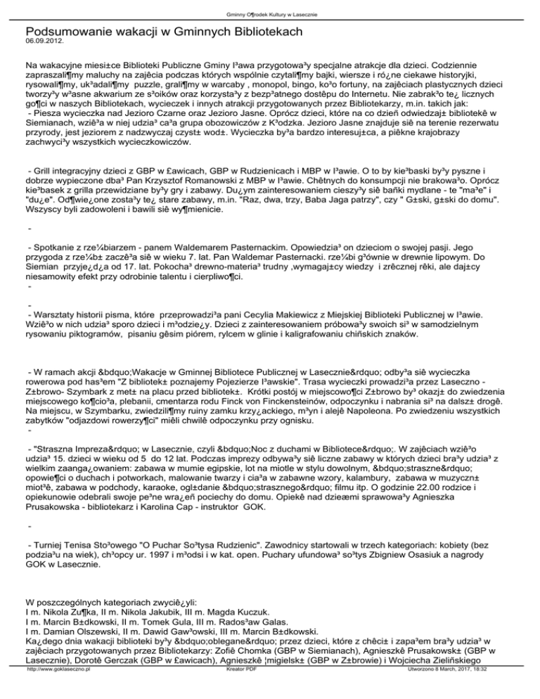 Gminny O¶rodek Kultury w Lasecznie Podsumowanie wakacji w Gminnych Bibliotekach 06.09.2012. Na wakacyjne miesi±ce Biblioteki Publiczne Gminy I³awa przygotowa³y specjalne atrakcje dla dzieci. Codziennie zapraszali¶my maluchy na zajêcia podczas których wspólnie czytali¶my bajki, wiersze i ró¿ne ciekawe historyjki, rysowali¶my, uk³adali¶my puzzle, grali¶my w warcaby , monopol, bingo, ko³o fortuny, na zajêciach plastycznych dzieci tworzy³y w³asne akwarium ze s³oików oraz korzysta³y z bezp³atnego dostêpu do Internetu. Nie zabrak³o te¿ licznych go¶ci w naszych Bibliotekach, wycieczek i innych atrakcji przygotowanych przez Bibliotekarzy, m.in. takich jak: - Piesza wycieczka nad Jezioro Czarne oraz Jezioro Jasne. Oprócz dzieci, które na co dzieñ odwiedzaj± bibliotekê w Siemianach, wziê³a w niej udzia³ ca³a grupa obozowiczów z K³odzka. Jezioro Jasne znajduje siê na terenie rezerwatu przyrody, jest jeziorem z nadzwyczaj czyst± wod±. Wycieczka by³a bardzo interesuj±ca, a piêkne krajobrazy zachwyci³y wszystkich wycieczkowiczów. - Grill integracyjny dzieci z GBP w £awicach, GBP w Rudzienicach i MBP w I³awie. O to by kie³baski by³y pyszne i dobrze wypieczone dba³ Pan Krzysztof Romanowski z MBP w I³awie. Chêtnych do konsumpcji nie brakowa³o. Oprócz kie³basek z grilla przewidziane by³y gry i zabawy. Du¿ym zainteresowaniem cieszy³y siê bañki mydlane - te "ma³e" i "du¿e". Od¶wie¿one zosta³y te¿ stare zabawy, m.in. "Raz, dwa, trzy, Baba Jaga patrzy", czy " G±ski, g±ski do domu". Wszyscy byli zadowoleni i bawili siê wy¶mienicie. - Spotkanie z rze¼biarzem - panem Waldemarem Pasternackim. Opowiedzia³ on dzieciom o swojej pasji. Jego przygoda z rze¼b± zaczê³a siê w wieku 7. lat. Pan Waldemar Pasternacki. rze¼bi g³ównie w drewnie lipowym. Do Siemian przyje¿d¿a od 17. lat. Pokocha³ drewno-materia³ trudny ,wymagaj±cy wiedzy i zrêcznej rêki, ale daj±cy niesamowity efekt przy odrobinie talentu i cierpliwo¶ci. - Warsztaty historii pisma, które przeprowadzi³a pani Cecylia Makiewicz z Miejskiej Biblioteki Publicznej w I³awie. Wziê³o w nich udzia³ sporo dzieci i m³odzie¿y. Dzieci z zainteresowaniem próbowa³y swoich si³ w samodzielnym rysowaniu piktogramów, pisaniu gêsim piórem, rylcem w glinie i kaligrafowaniu chiñskich znaków. - W ramach akcji „Wakacje w Gminnej Bibliotece Publicznej w Lasecznie” odby³a siê wycieczka rowerowa pod has³em "Z bibliotek± poznajemy Pojezierze I³awskie". Trasa wycieczki prowadzi³a przez Laseczno Z±browo- Szymbark z met± na placu przed bibliotek±. Krótki postój w miejscowo¶ci Z±browo by³ okazj± do zwiedzenia miejscowego ko¶cio³a, plebanii, cmentarza rodu Finck von Finckensteinów, odpoczynku i nabrania si³ na dalsz± drogê. Na miejscu, w Szymbarku, zwiedzili¶my ruiny zamku krzy¿ackiego, m³yn i alejê Napoleona. Po zwiedzeniu wszystkich zabytków "odjazdowi rowerzy¶ci" miêli chwilê odpoczynku przy ognisku. - "Straszna Impreza” w Lasecznie, czyli „Noc z duchami w Bibliotece”. W zajêciach wziê³o udzia³ 15. dzieci w wieku od 5 do 12 lat. Podczas imprezy odbywa³y siê liczne zabawy w których dzieci bra³y udzia³ z wielkim zaanga¿owaniem: zabawa w mumie egipskie, lot na miotle w stylu dowolnym, „straszne” opowie¶ci o duchach i potworkach, malowanie twarzy i cia³a w zabawne wzory, kalambury, zabawa w muzyczn± miot³ê, zabawa w podchody, karaoke, ogl±danie „strasznego” filmu itp. O godzinie 22.00 rodzice i opiekunowie odebrali swoje pe³ne wra¿eñ pociechy do domu. Opiekê nad dzieæmi sprawowa³y Agnieszka Prusakowska - bibliotekarz i Karolina Cap - instruktor GOK. - Turniej Tenisa Sto³owego "O Puchar So³tysa Rudzienic". Zawodnicy startowali w trzech kategoriach: kobiety (bez podzia³u na wiek), ch³opcy ur. 1997 i m³odsi i w kat. open. Puchary ufundowa³ so³tys Zbigniew Osasiuk a nagrody GOK w Lasecznie. W poszczególnych kategoriach zwyciê¿yli: I m. Nikola Zu¶ka, II m. Nikola Jakubik, III m. Magda Kuczuk. I m. Marcin B±dkowski, II m. Tomek Gula, III m. Rados³aw Galas. I m. Damian Olszewski, II m. Dawid Gaw³owski, III m. Marcin B±dkowski. Ka¿dego dnia wakacji biblioteki by³y „oblegane” przez dzieci, które z chêci± i zapa³em bra³y udzia³ w zajêciach przygotowanych przez Bibliotekarzy: Zofiê Chomka (GBP w Siemianach), Agnieszkê Prusakowsk± (GBP w Lasecznie), Dorotê Gerczak (GBP w £awicach), Agnieszkê ¦migielsk± (GBP w Z±browie) i Wojciecha Zieliñskiego http://www.goklaseczno.pl Kreator PDF Utworzono 8 March, 2017, 18:32 Gminny O¶rodek Kultury w Lasecznie (GBP w Rudzienicach). Dziêkujemy za mile spêdzony czas! http://www.goklaseczno.pl Kreator PDF Utworzono 8 March, 2017, 18:32