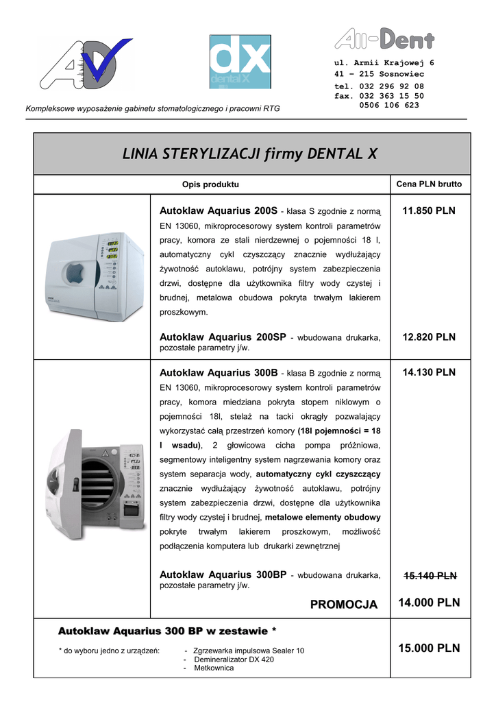 ul. Armii Krajowej 6 41 – 215 Sosnowiec tel. 032 296 92 08 fax. 032 363 15 50 0506 106 623 Kompleksowe wyposażenie gabinetu stomatologicznego i pracowni RTG LINIA STERYLIZACJI firmy DENTAL X Cena PLN brutto Opis produktu Autoklaw Aquarius 200S - klasa S zgodnie z normą 11.850 PLN EN 13060, mikroprocesorowy system kontroli parametrów pracy, komora ze stali nierdzewnej o pojemności 18 l, automatyczny cykl czyszczący znacznie wydłużający żywotność autoklawu, potrójny system zabezpieczenia drzwi, dostępne dla użytkownika filtry wody czystej i brudnej, metalowa obudowa pokryta trwałym lakierem proszkowym. Autoklaw Aquarius 200SP - wbudowana drukarka, 12.820 PLN pozostałe parametry j/w. Autoklaw Aquarius 300B - klasa B zgodnie z normą 14.130 PLN EN 13060, mikroprocesorowy system kontroli parametrów pracy, komora miedziana pokryta stopem niklowym o pojemności 18l, stelaż na tacki okrągły pozwalający wykorzystać całą przestrzeń komory (18l pojemności = 18 l wsadu), 2 głowicowa cicha pompa próżniowa, segmentowy inteligentny system nagrzewania komory oraz system separacja wody, automatyczny cykl czyszczący znacznie wydłużający żywotność autoklawu, potrójny system zabezpieczenia drzwi, dostępne dla użytkownika filtry wody czystej i brudnej, metalowe elementy obudowy pokryte trwałym lakierem proszkowym, możliwość podłączenia komputera lub drukarki zewnętrznej Autoklaw Aquarius 300BP - wbudowana drukarka, pozostałe parametry j/w. PROMOCJA 15.140 PLN 14.000 PLN Autoklaw Aquarius 300 BP w zestawie * * do wyboru jedno z urządzeń: - Zgrzewarka impulsowa Sealer 10 - Demineralizator DX 420 - Metkownica 15.000 PLN Zgrzewarka impulsowa Sealer 10 do rękawów o maksymalnej szerokości 300 mm, szerokość zgrzewu 10mm, 434 EUR 1.715 PLN możliwość zawieszenia na ścianie. AQTABS – tabletki regenerujące do autoklawów 300B oraz AQTABS 200S. Zapewniają czyszczenie i usuwanie wszelkich osadów 143 PLN z wnętrza komory. 1 opakowanie zawiera 12 tabletek. DEMINERALIZATOR DX420 – system bezpośrednio doprowadza,demineraslizuje Parametry: Przepływ wodę 50l/h, do sterylizatorów. jakość wody 0,1-20 454 EUR 1.790 PLN mikrojednostek/cm X01.0426 97 EUR Wkład wymienny do demineralizatora DX420 383 PLN PURITY OR.2 –osmatyczny filtr uzdatniania wody do autoklawu. Umożliwia dostarczenie wody bezpośrednio z 1463 EUR 5.780 PLN sieci, zgodnie z normą EN1717. EQ3OR2-CAR 318 EUR Wkład wymienny do Purity OR.2 1.260 PLN METKOWNICA –zestaw zawiera: 1metkownicę, 10 rolek taśmowych. DRUKARKA ZEWNĘTRZNA – zestaw zawiera drukarkę DPU414Seiko, rolkę papieru, 1 kabel i zasilacz. 105514 474 EUR 1.870 PLN 575 EUR 2.270 PLN 33 PLN Papier do drukarki. DESTYLARKA DestMax – destytlarka do autoklawu zapewniająca właściwą wodę do procesu sterylizacji Parametry techniczne: pojemność 4dm3 , wydajność 1 dm3 / 1h, zasilanie 220V/50-60 Hz, moc całkowita 580 W (grzanie 700PLN 565W, chłodzenie 15W),waga ok.3,5 kg. W zestawie z urządzeniem: zbiornik na wodę destylowaną,łącznik oraz kabel zasilający. Cennik zawiera wybrane pozycje z oferty producenta – szczegółowe informacje można uzyskać w firmie All – Dent www.alldent.info.pl, e-mail [email protected] Ceny w PLN podane są w celach informacyjnych 1EURO = 3,95 PLN i zawierają podatek VAT. Aktualna cena przeliczana jest wg kursu sprzedaży walut NBP z dnia wystawienia faktury.i zawierają podatek VAT. Ceny mogą ulec zmianie bez uprzedniego zawiadomienia w przypadku zmian cen przez producenta, zmian przepisów podatkowych, przepisów celnych lub z innych przyczyn. Podane w cenniku informacje nie są ofertą handlową w rozumieniu art. 66 Kodeksu Cywilnego.